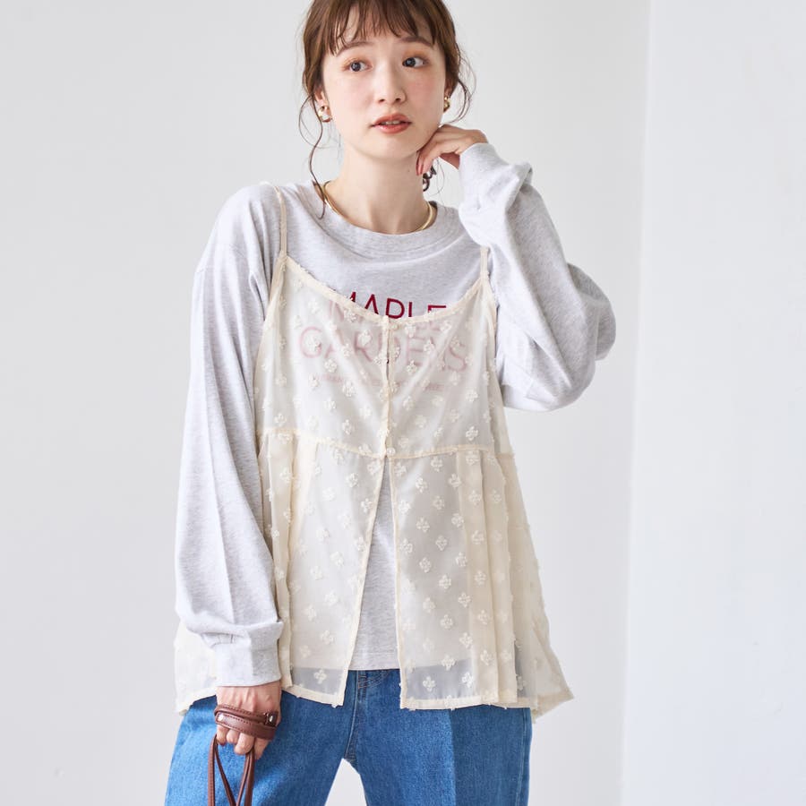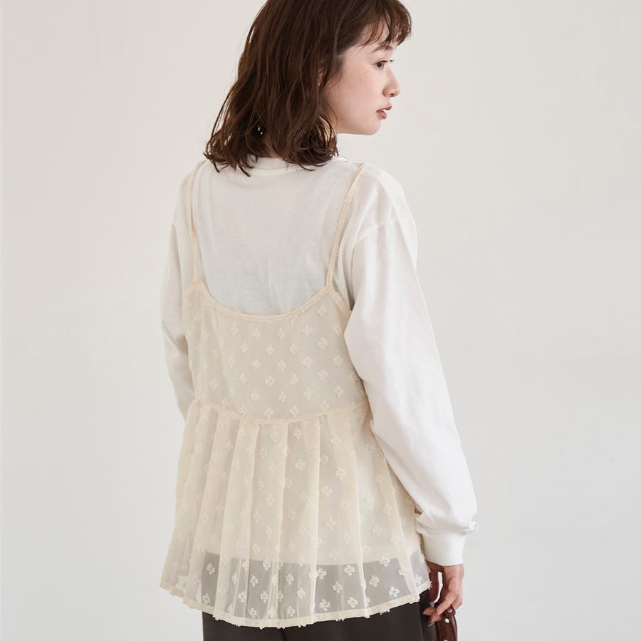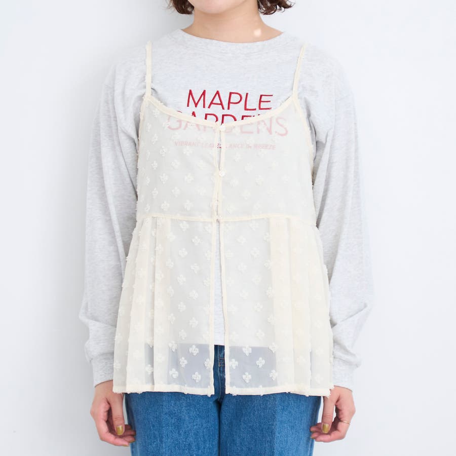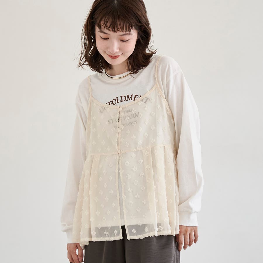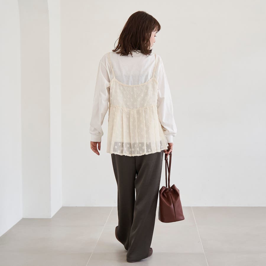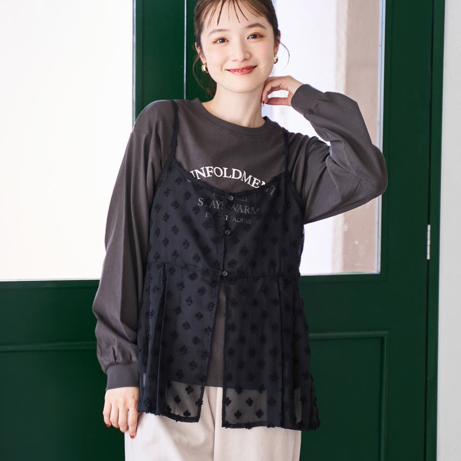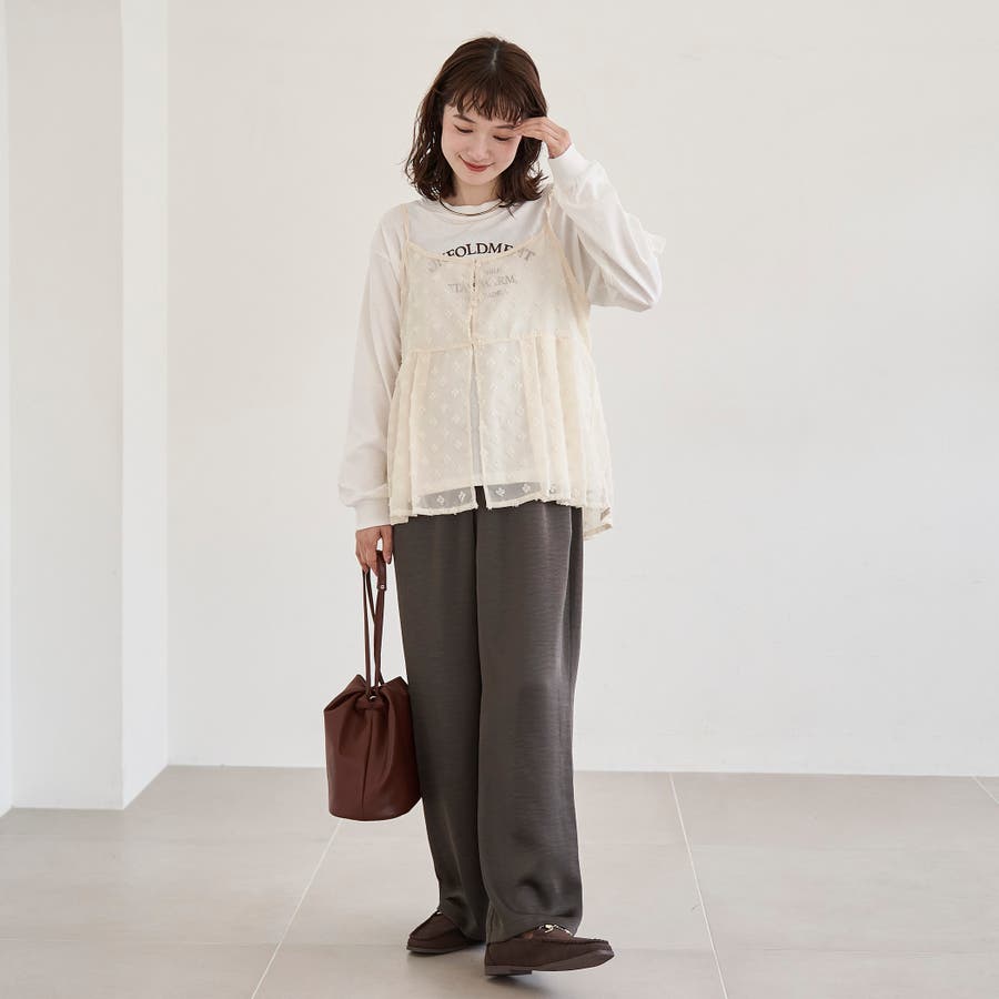 キャミソールは透け感のあるドット柄シフォンで、重ねるだけでスタイリングに華やかさをプラス。