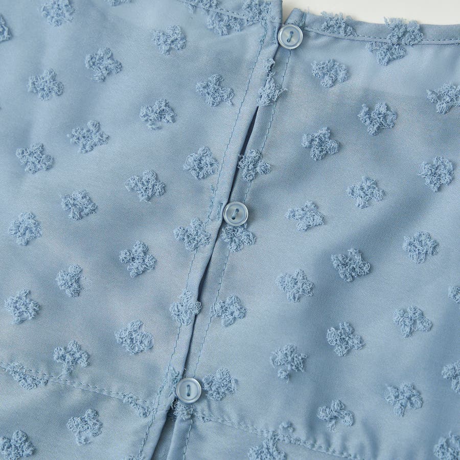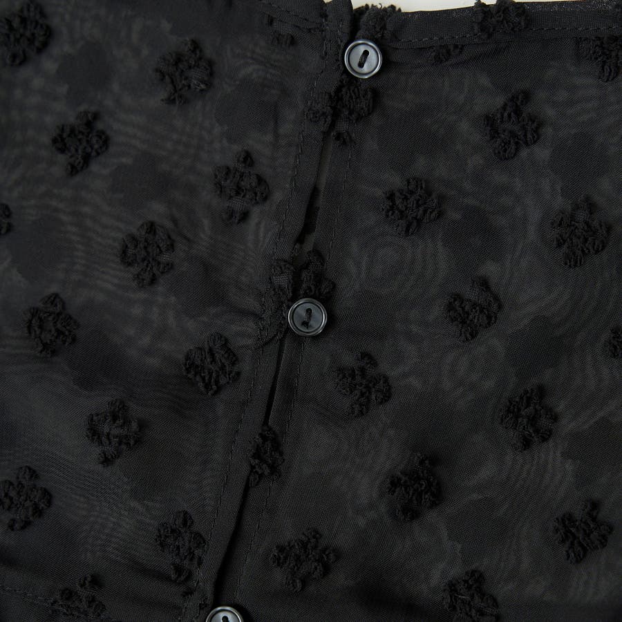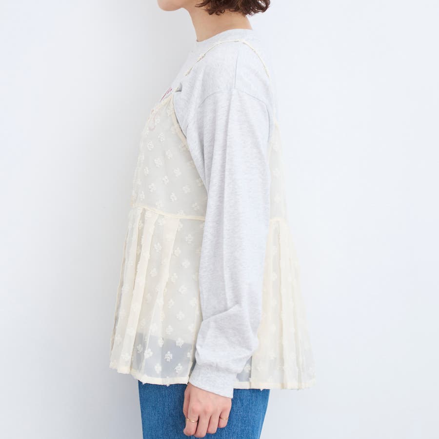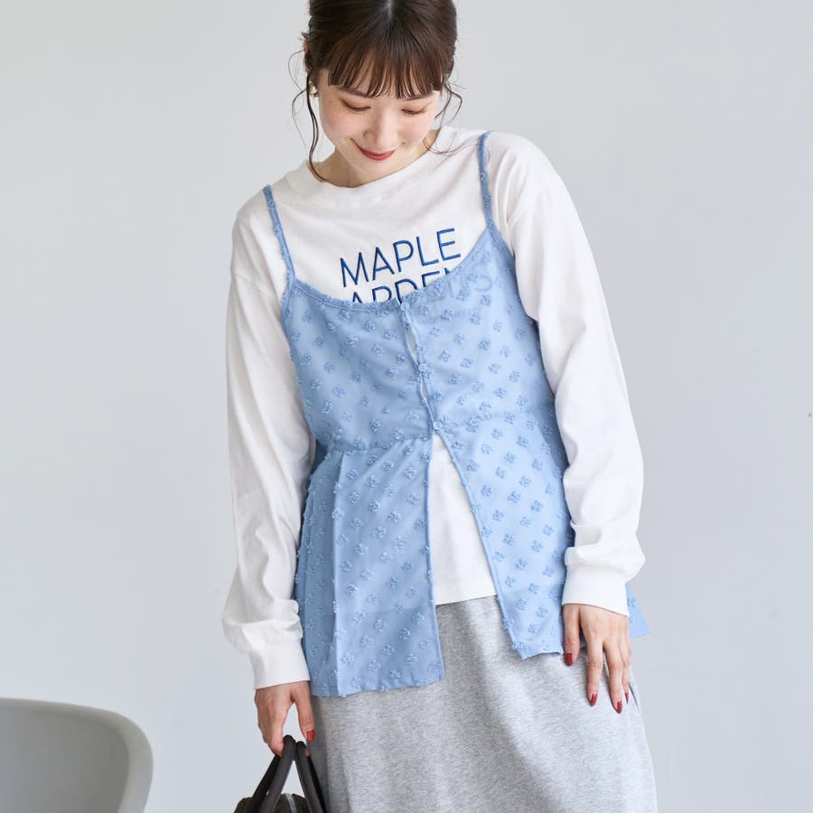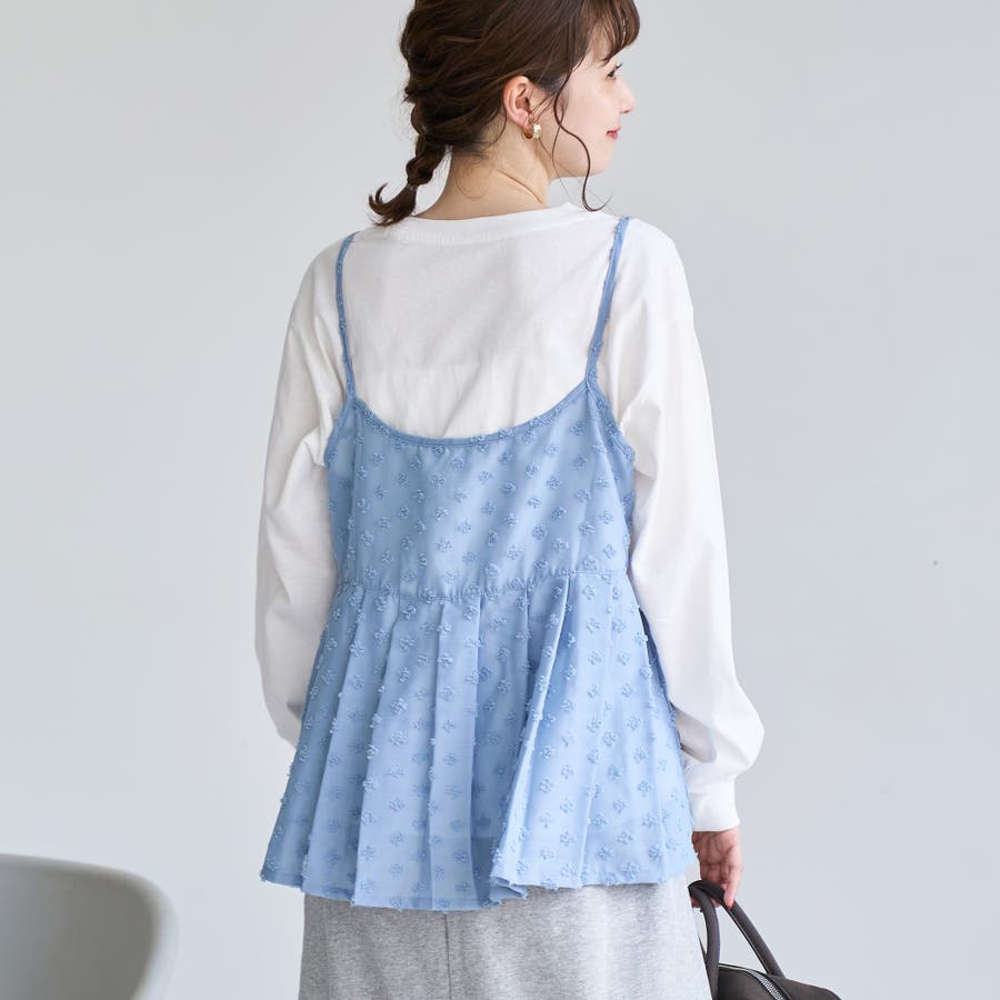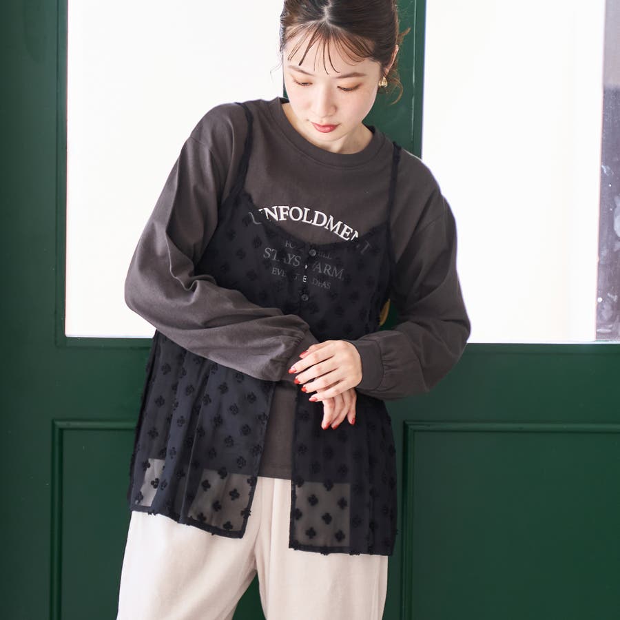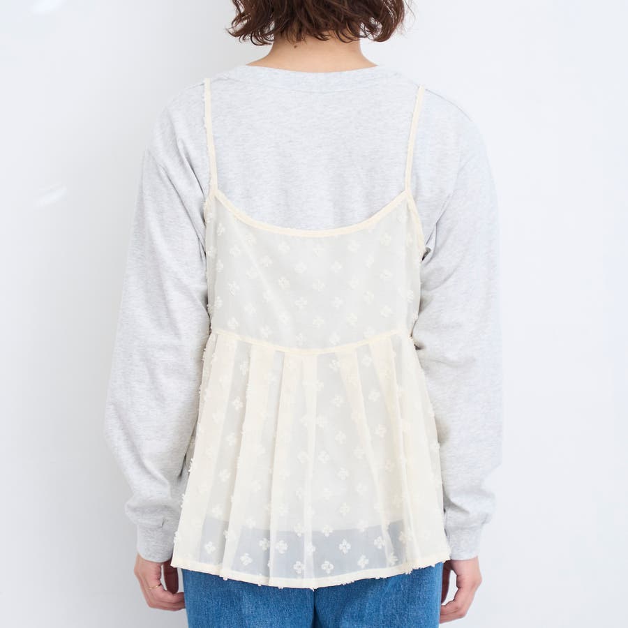 キャミソールは透け感のあるドット柄シフォンで、重ねるだけでスタイリングに華やかさをプラス。