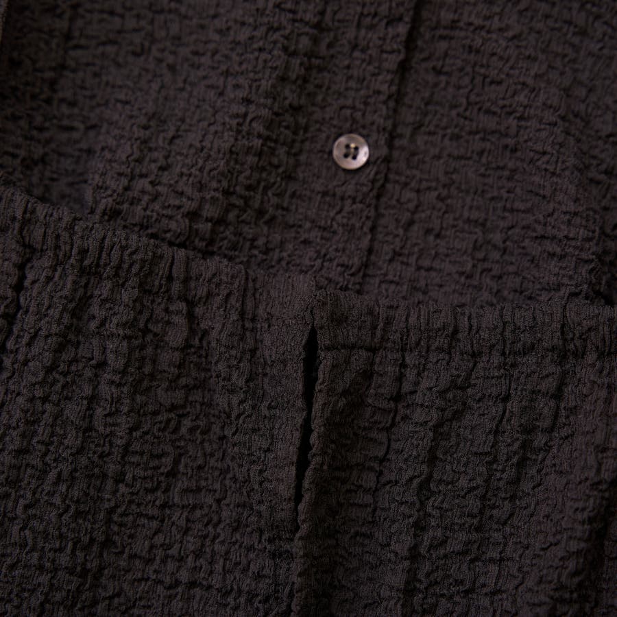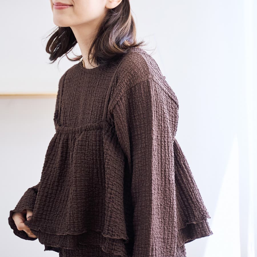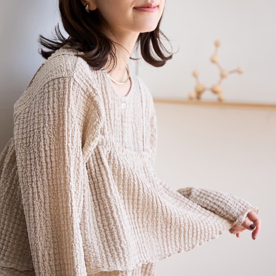同素材で仕立てたセットアイテムは、裾や袖口にあしらったメローデザインがさりげない甘さをプラスします。