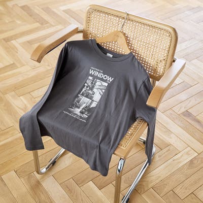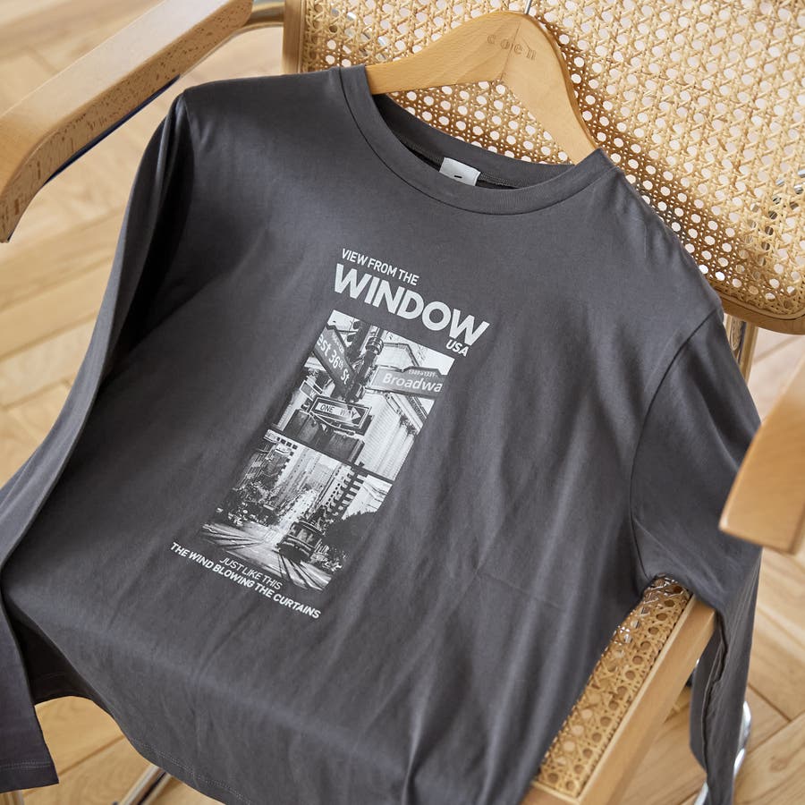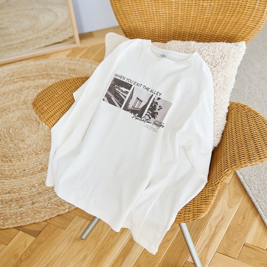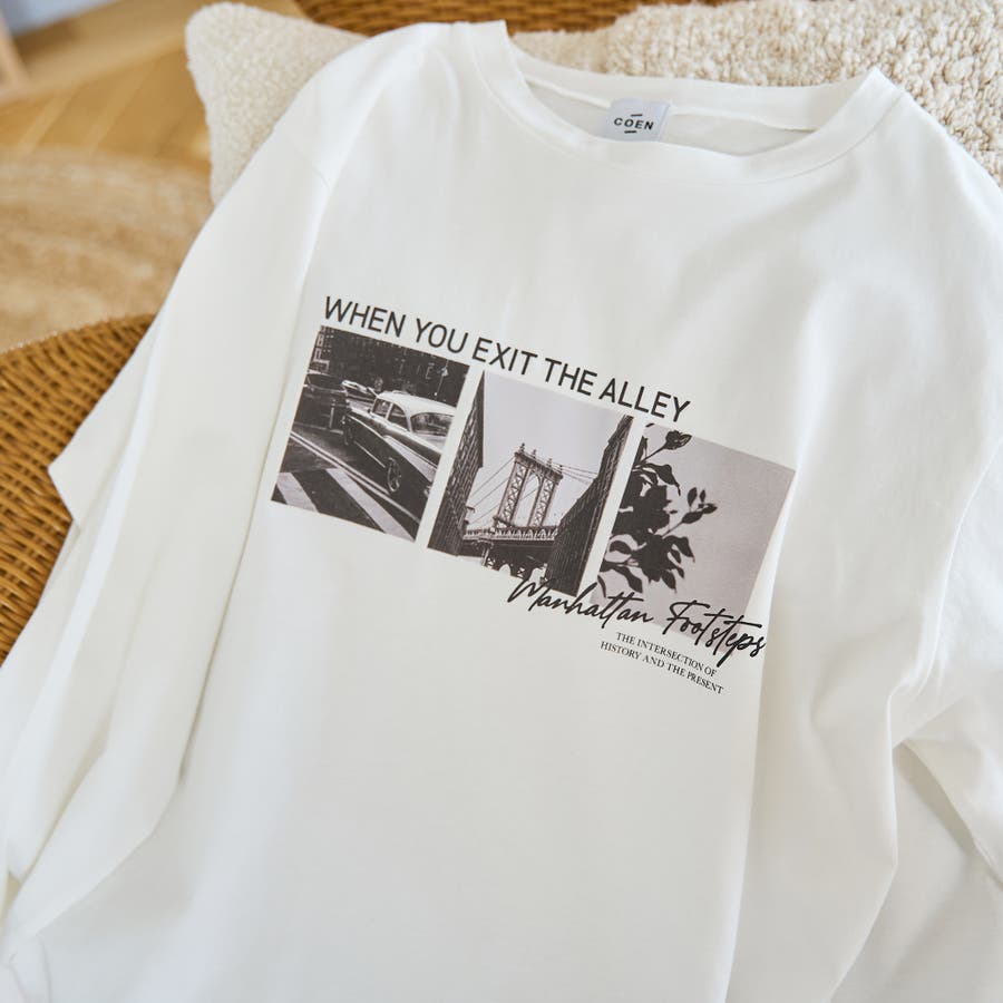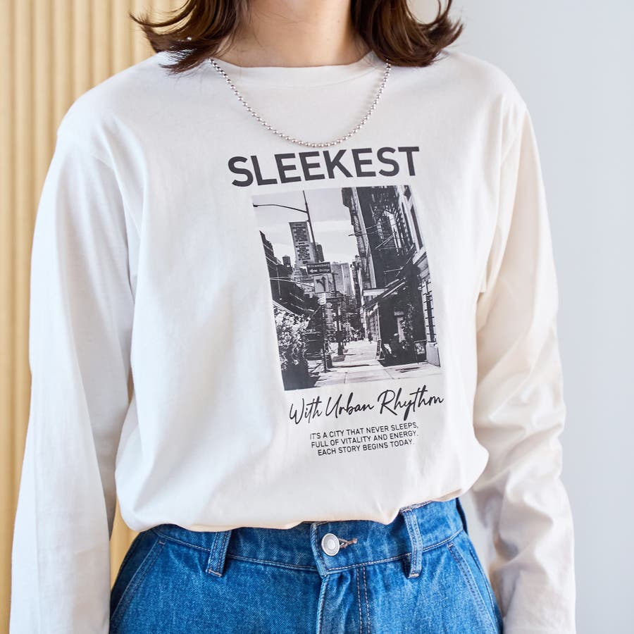 アメリカの街並みとお花のフォトグラフィックは、カジュアルはもちろん、キレイめスタイルにも合わせやすいデザインです。