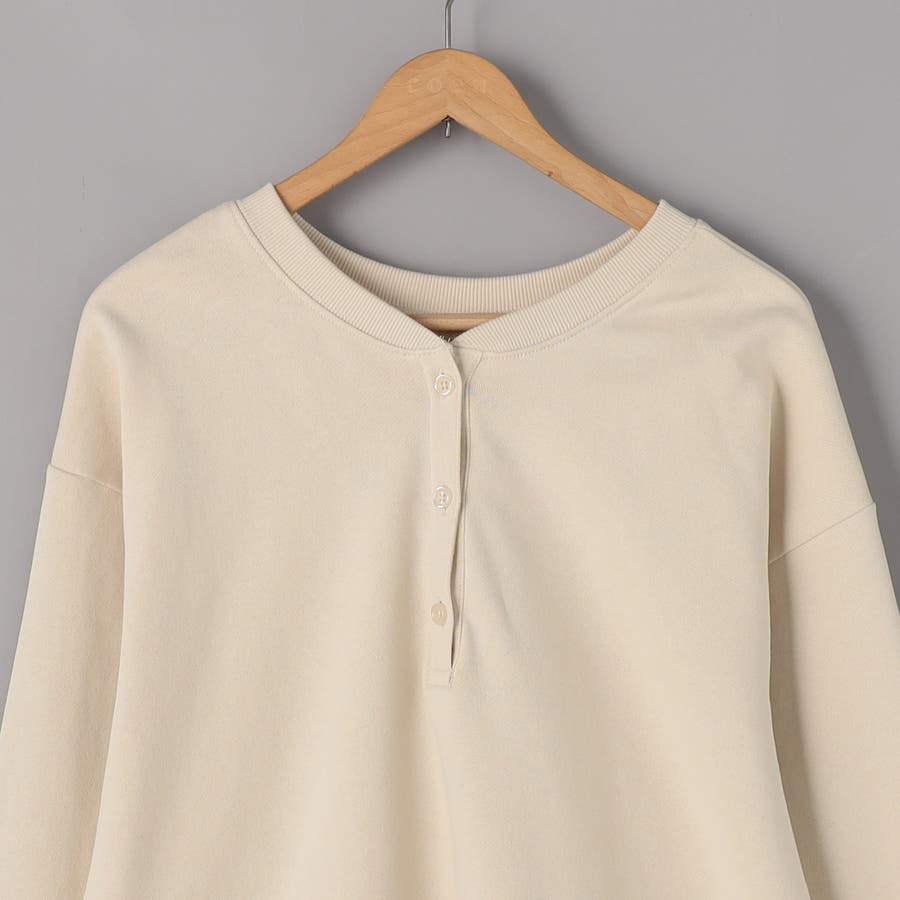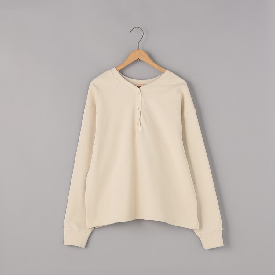 ヘンリーネックにもクルーネックにも着用でき、ヘンリーネックが苦手な方にも取り入れやすい仕様です。