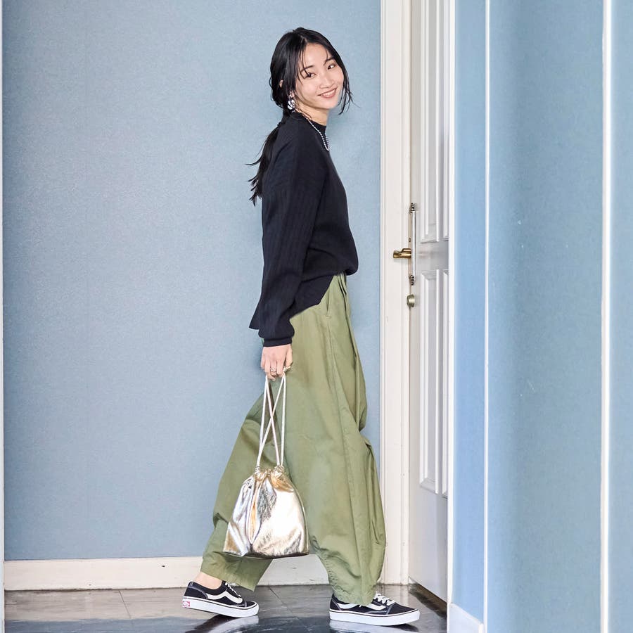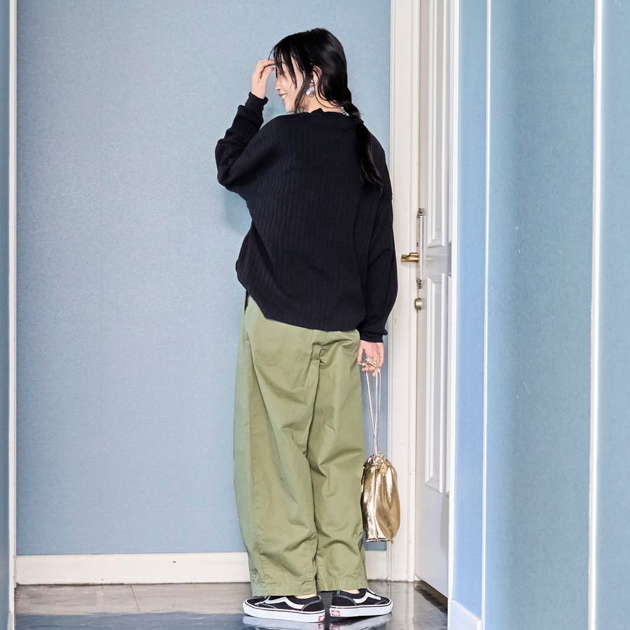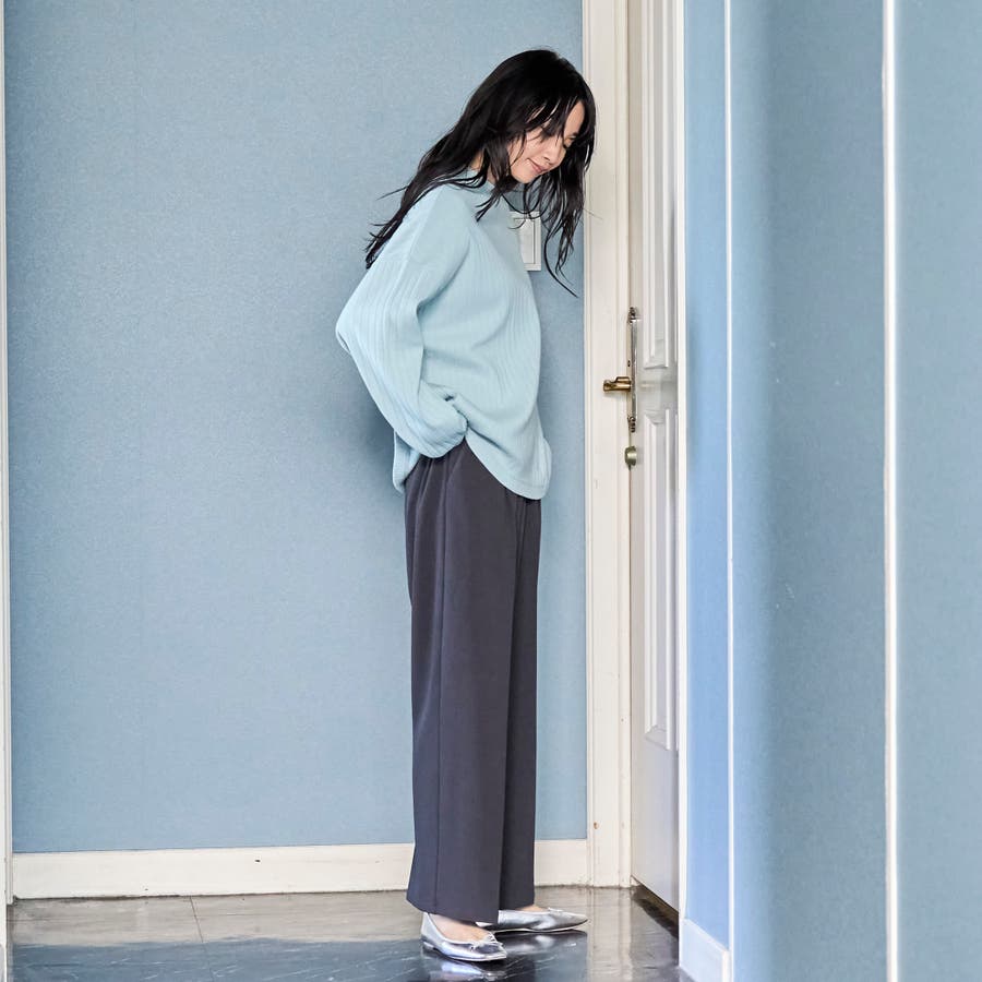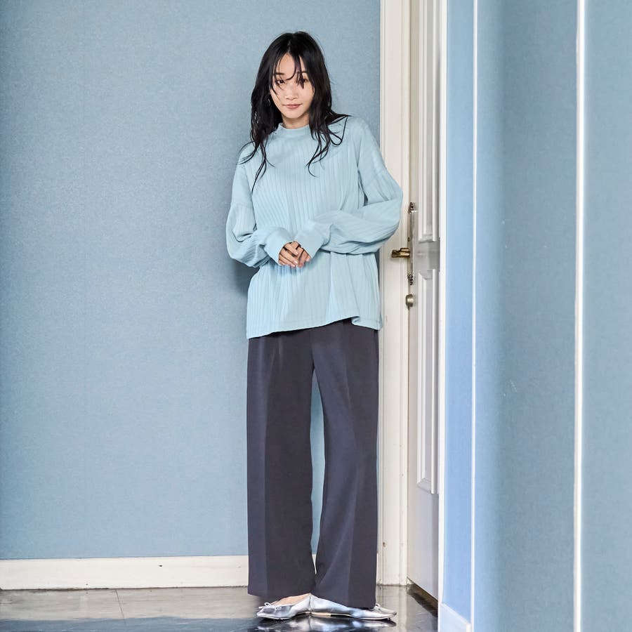 リブ編みによって縦のラインが強調され、すっきり細見えするのが魅力。