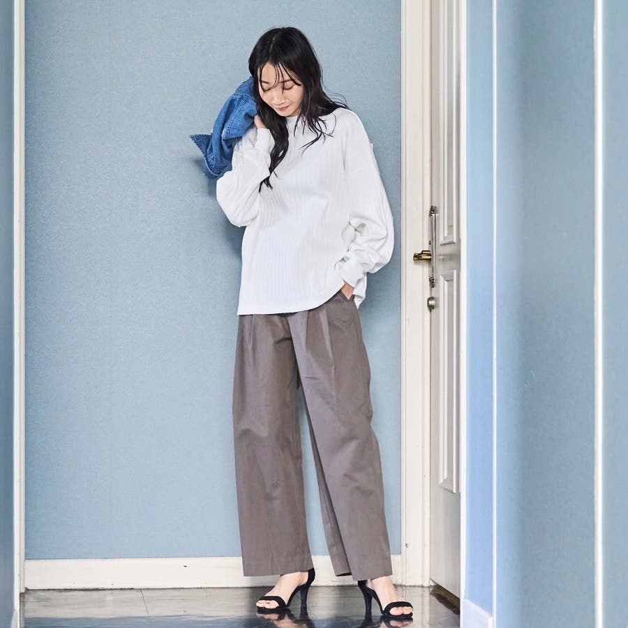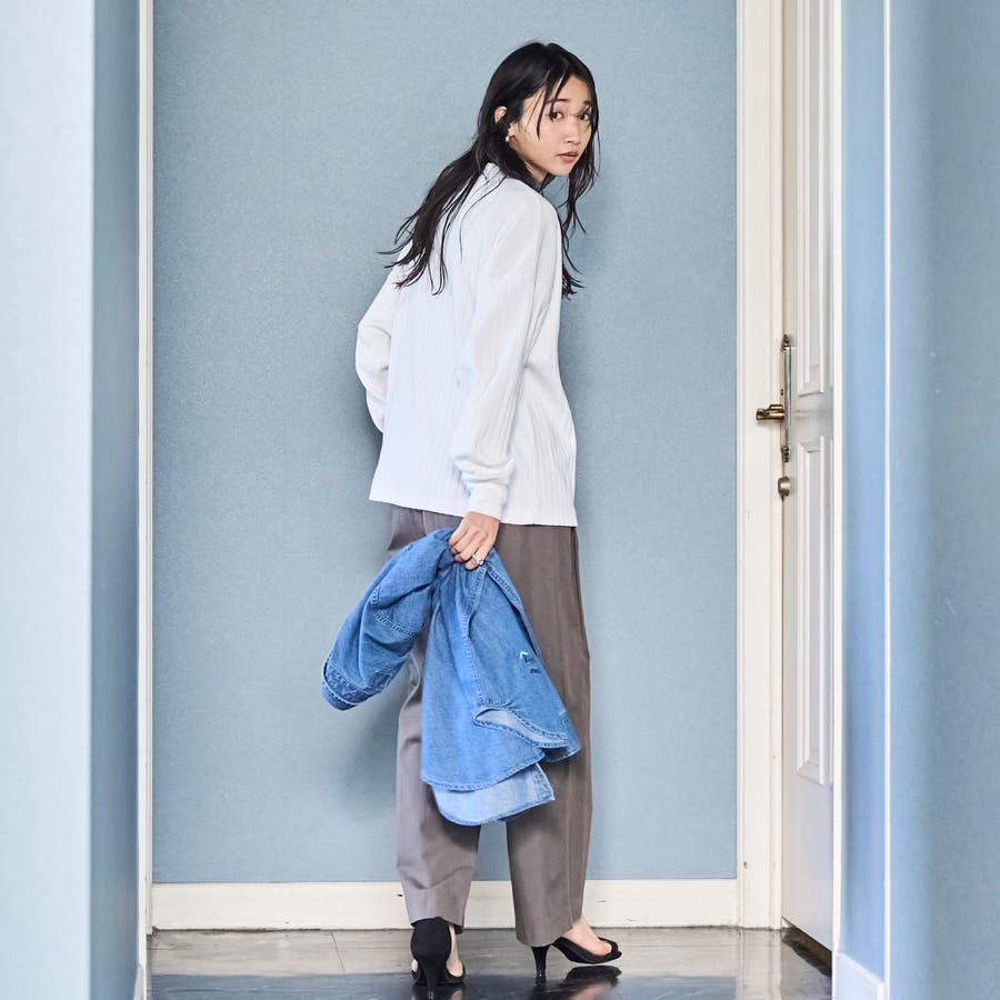 袖はボリューム感を出してトレンド感のある仕上がりにし、シンプルながらも一枚でもサマになるデザインです。