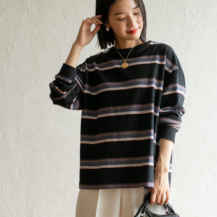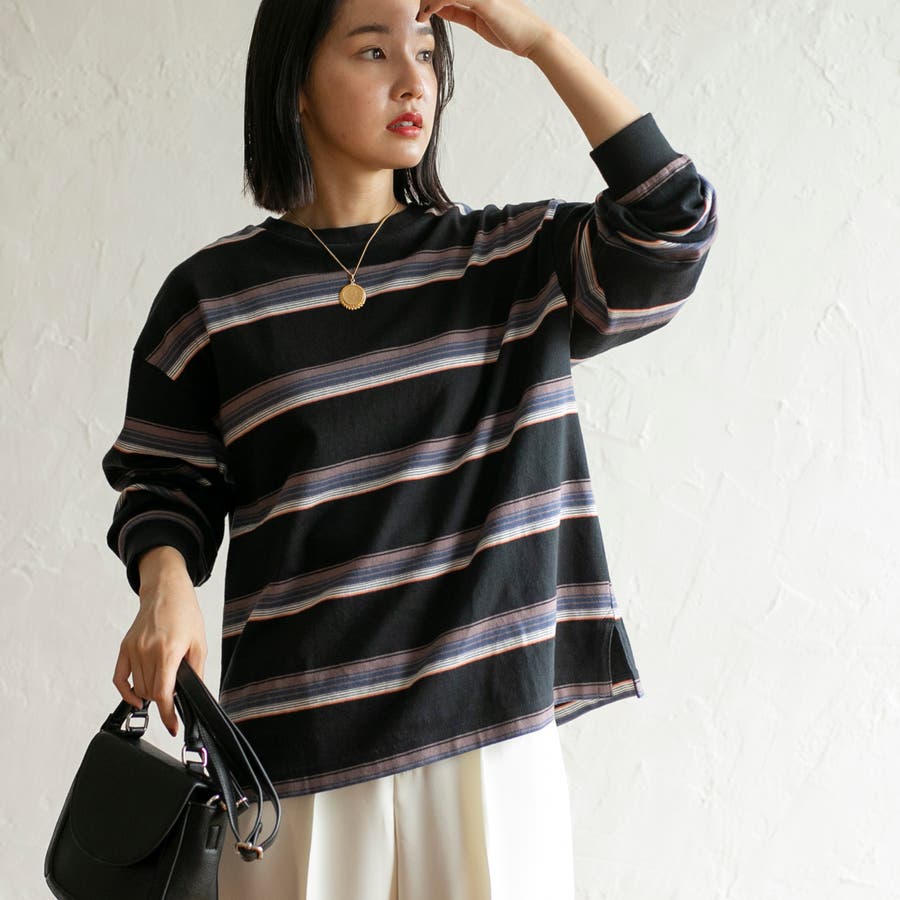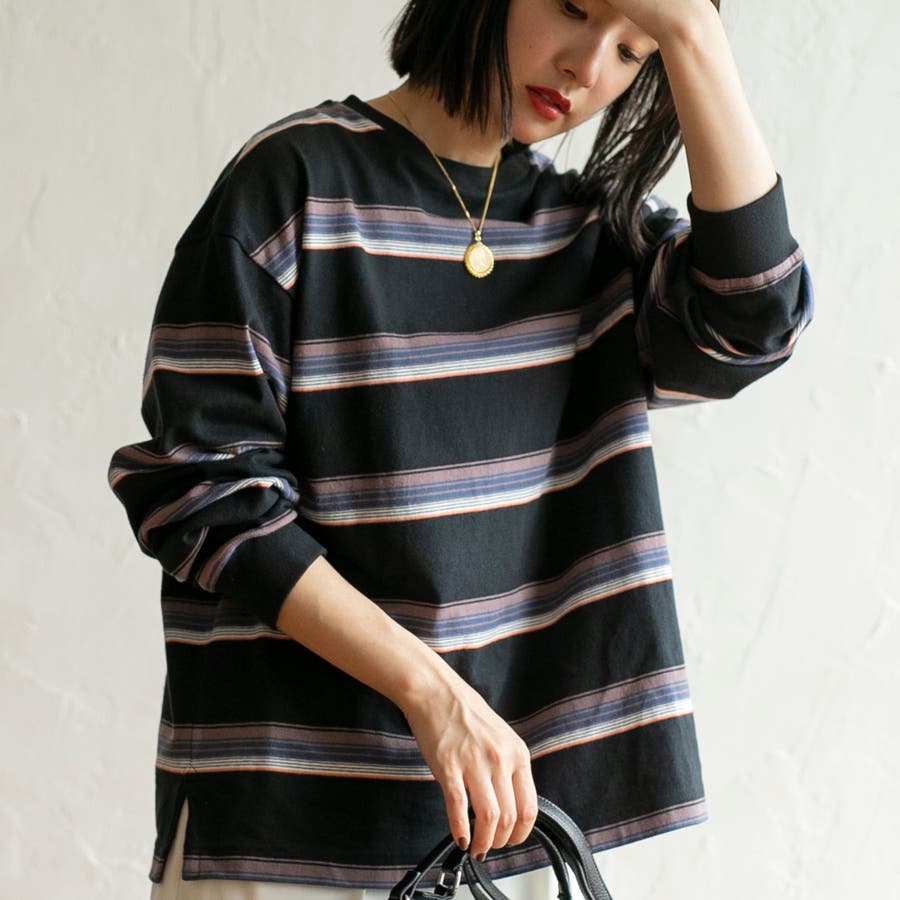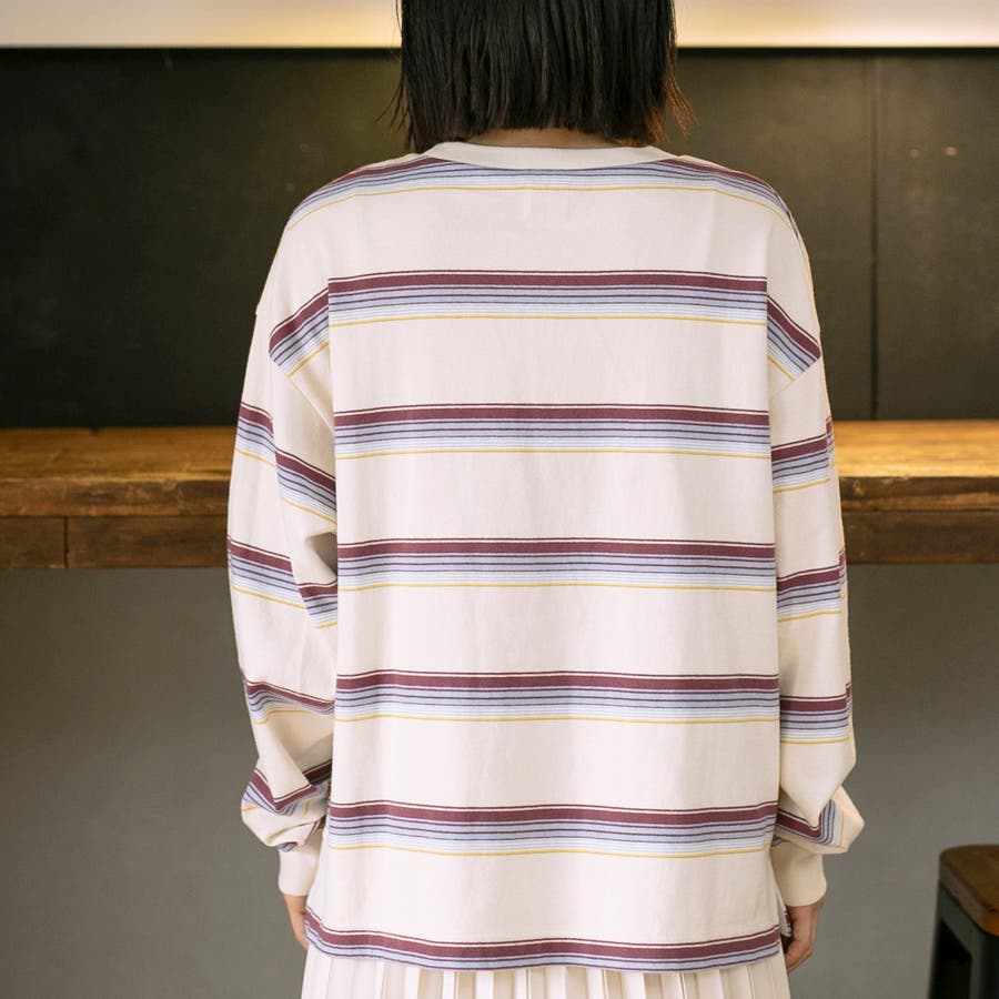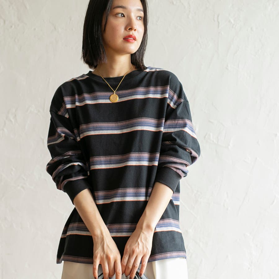 ゆったりとしたオーバーサイズと程よい長さが一枚での着用はもちろん、ジャケットやアウターのインにしても映える色合いのボーダーロンT。