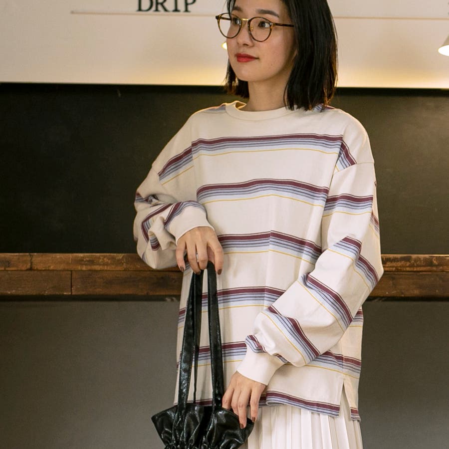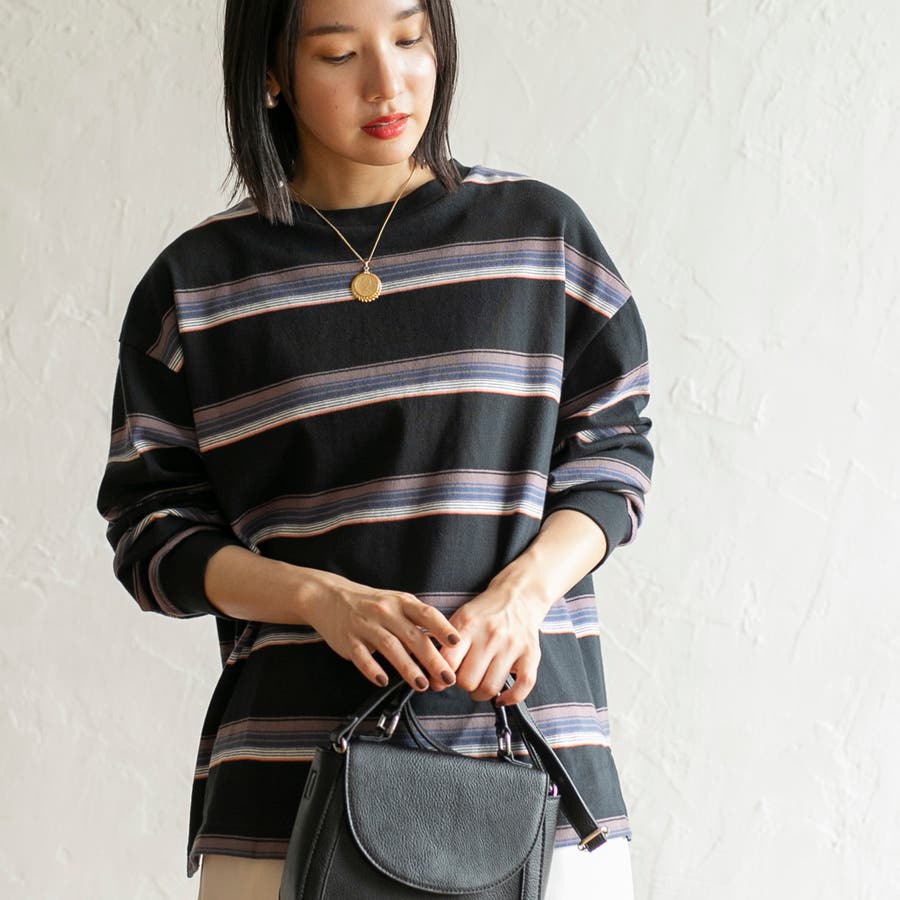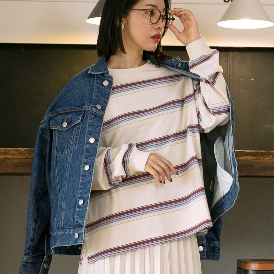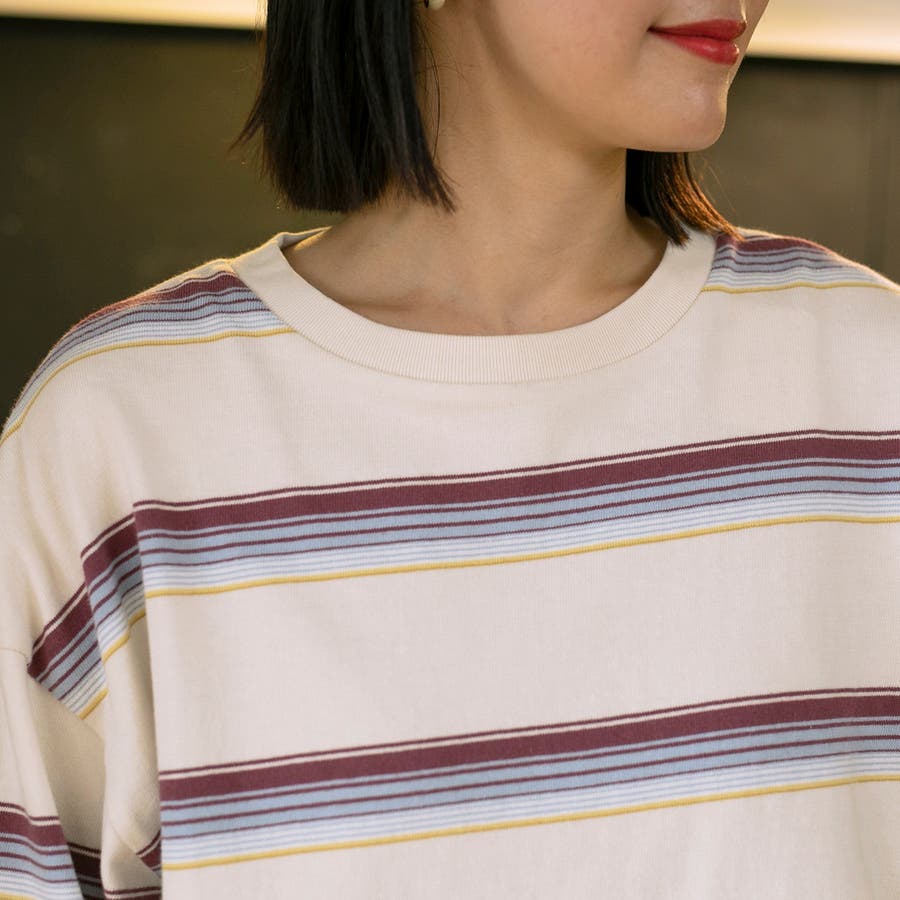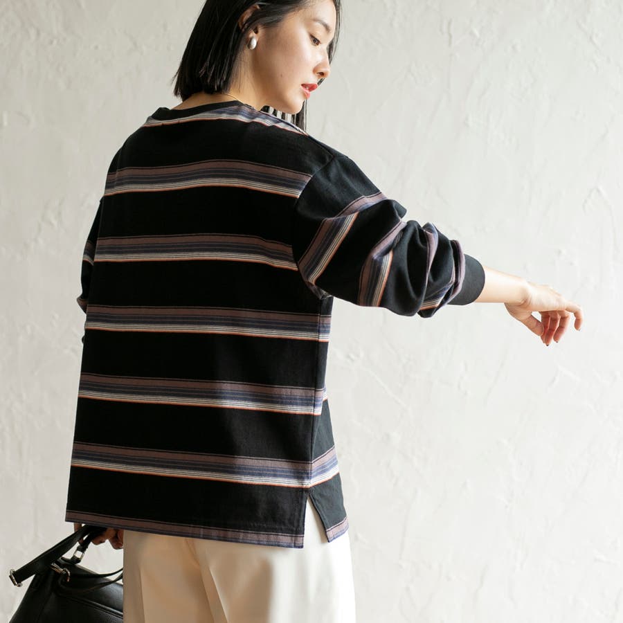 ゆったりとしたオーバーサイズと程よい長さが一枚での着用はもちろん、ジャケットやアウターのインにしても映える色合いのボーダーロンT。
