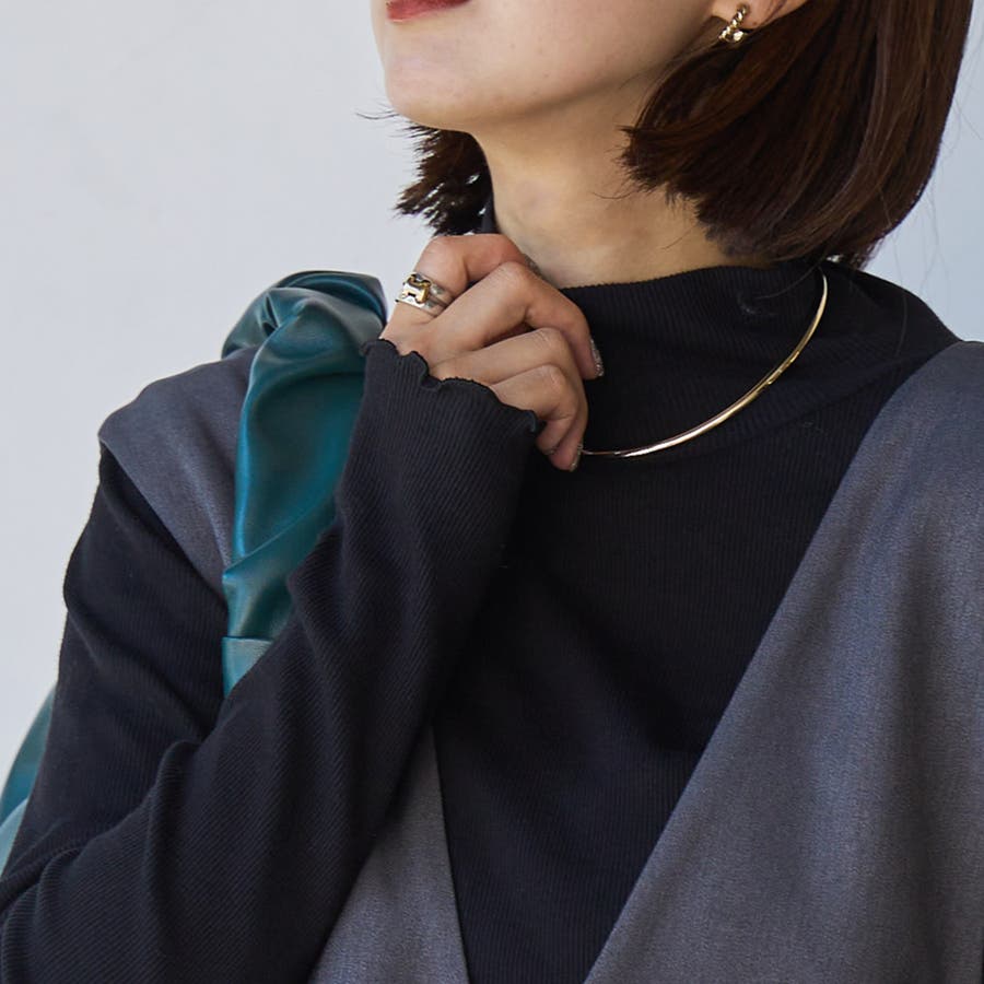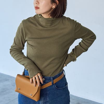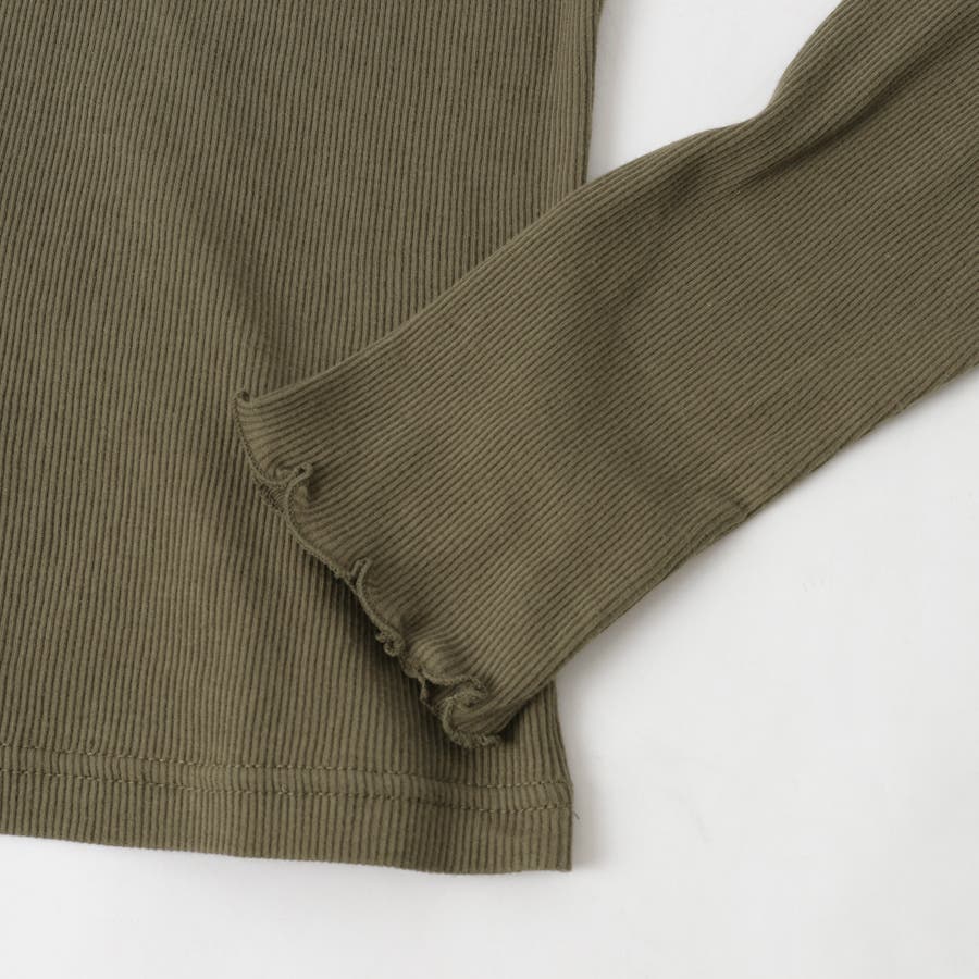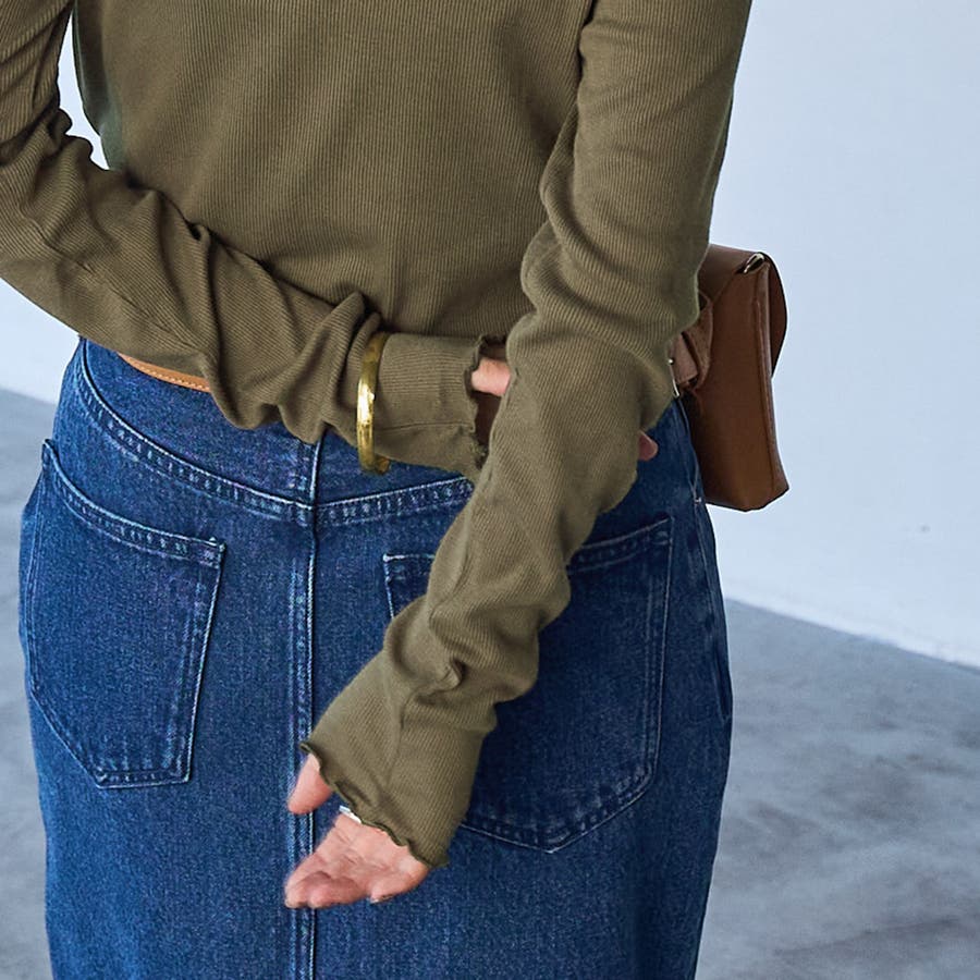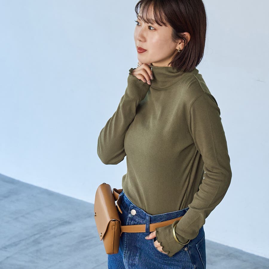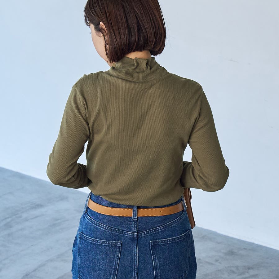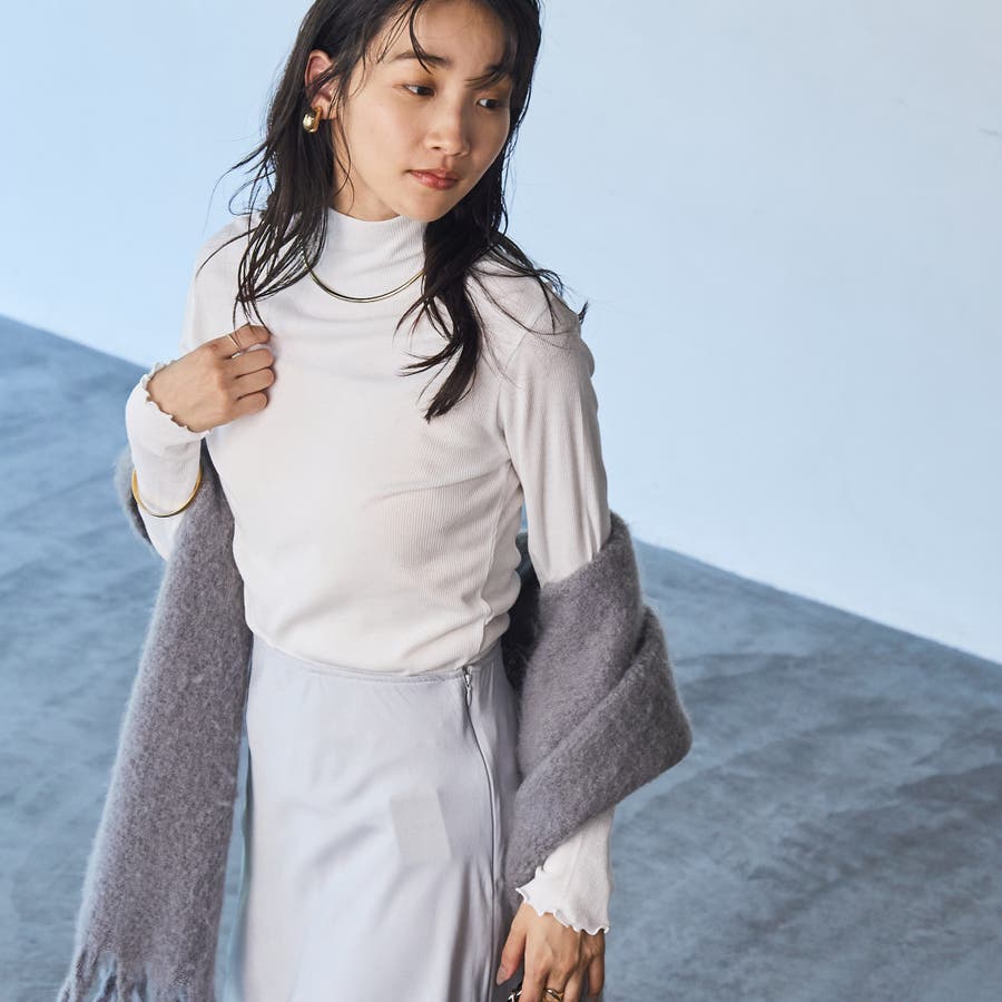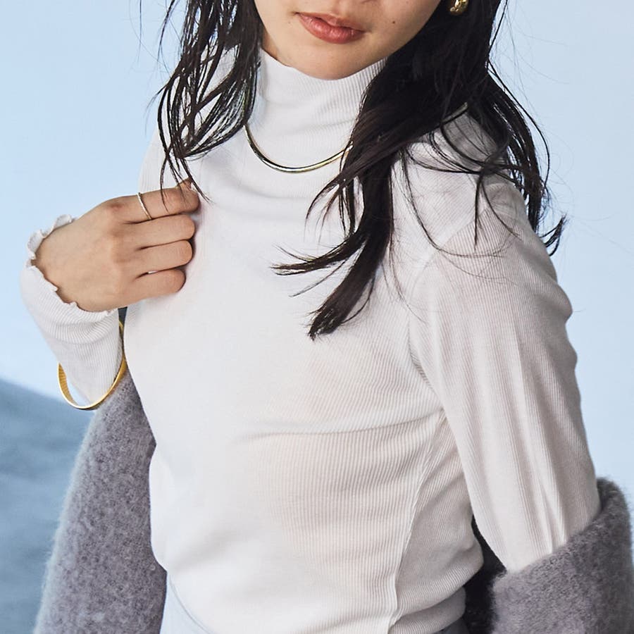 シンプルなリブタートルネックは袖口のメローディテールがポイント。