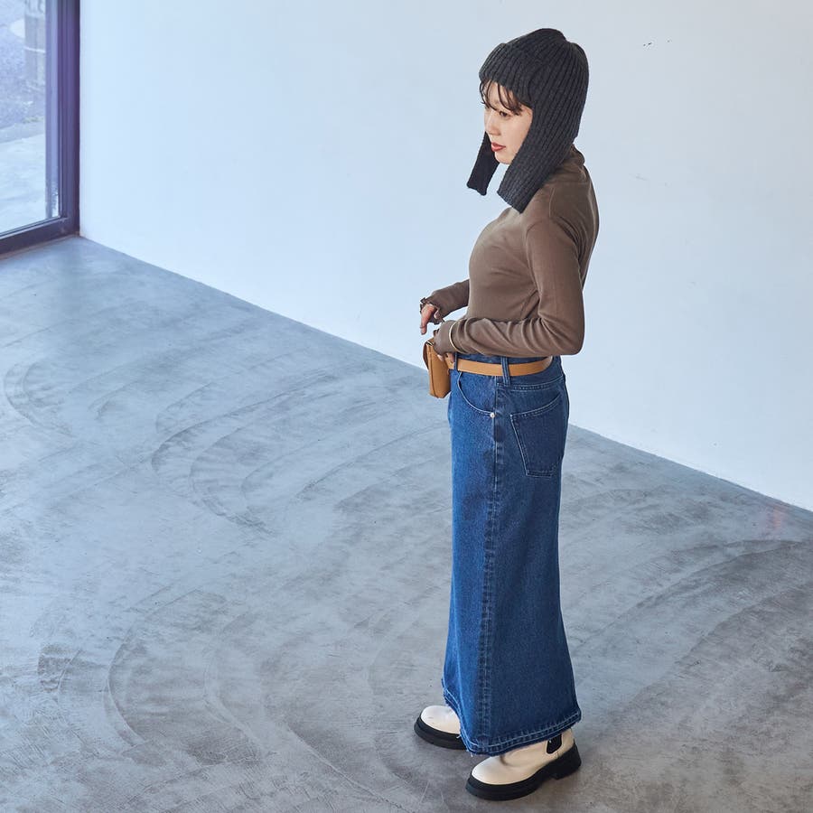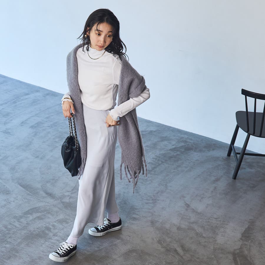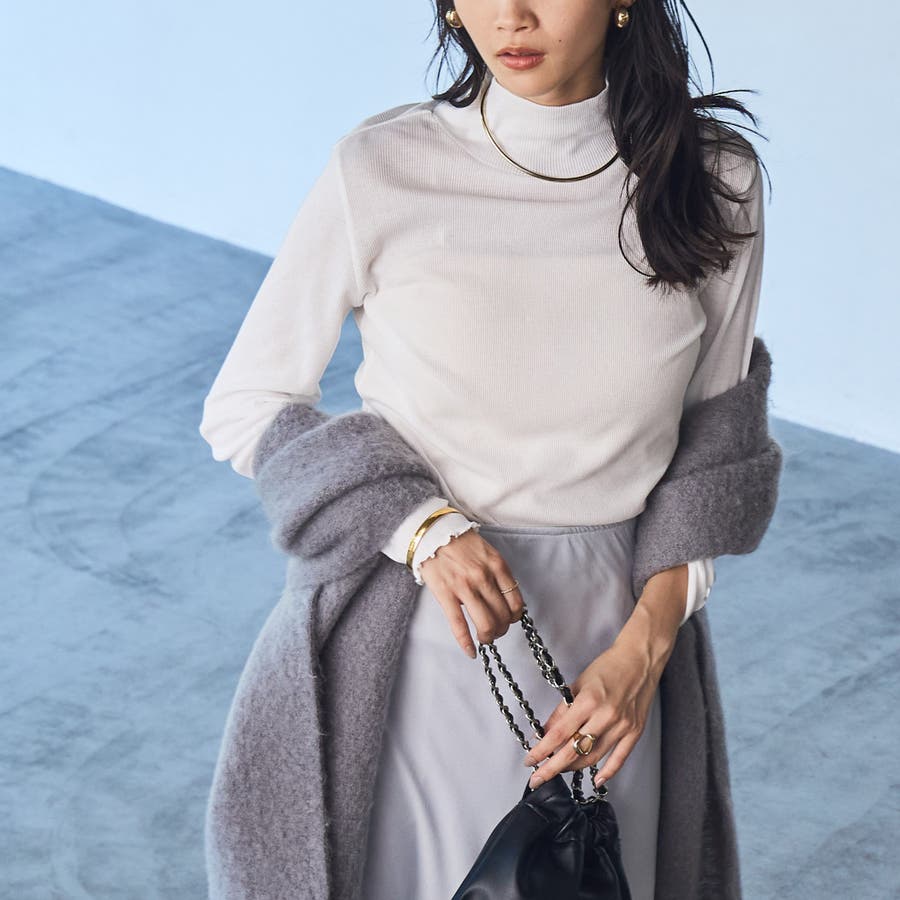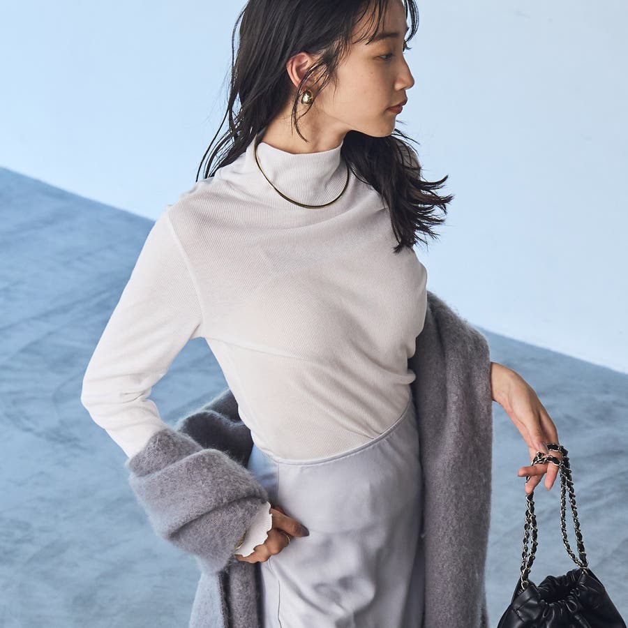 すっきりタイト目シルエットにやや低めのタートルネックと華奢で長めのアームが女性らしさを引き立てます。