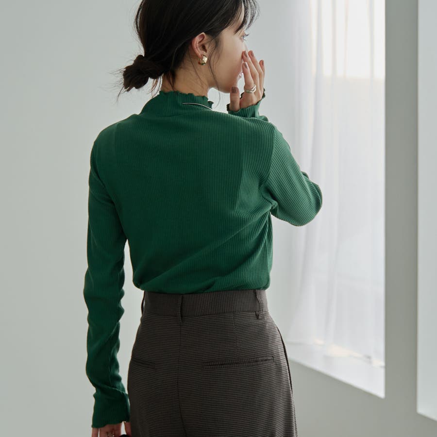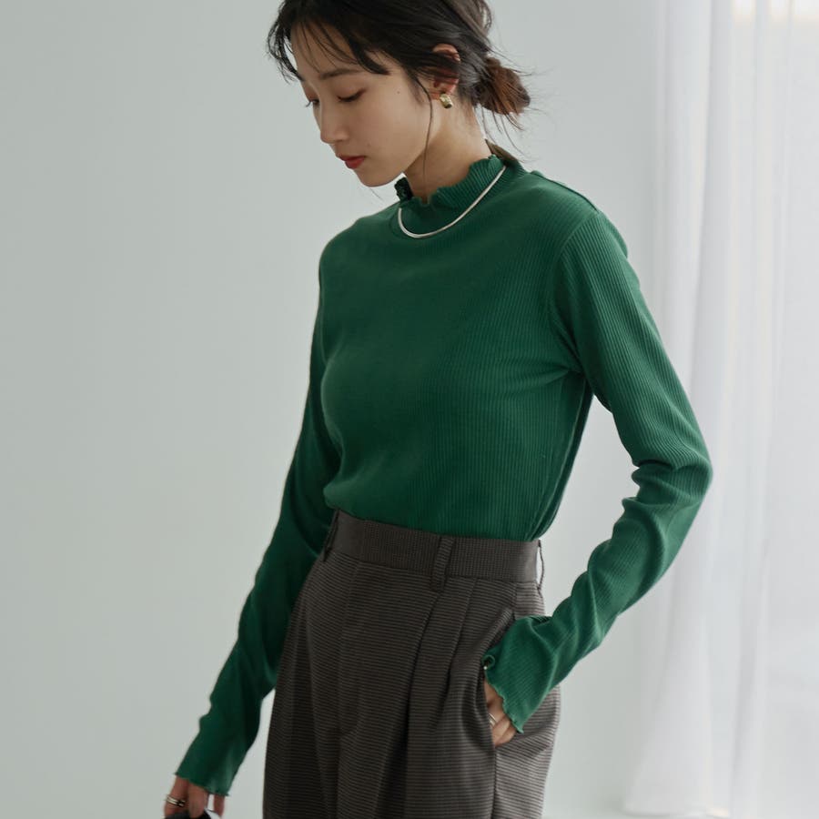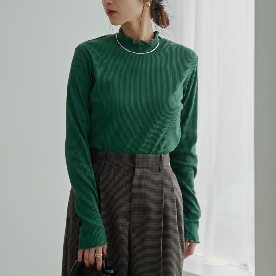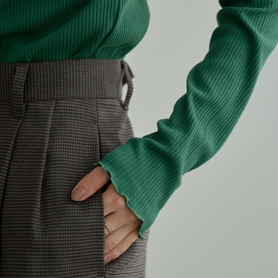 シンプルなリブタートルネックは袖口とネックのメロウなディテールがポイント。
