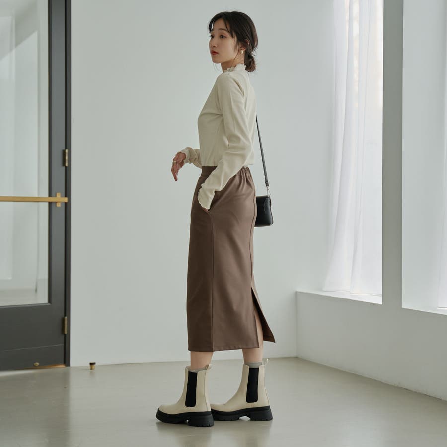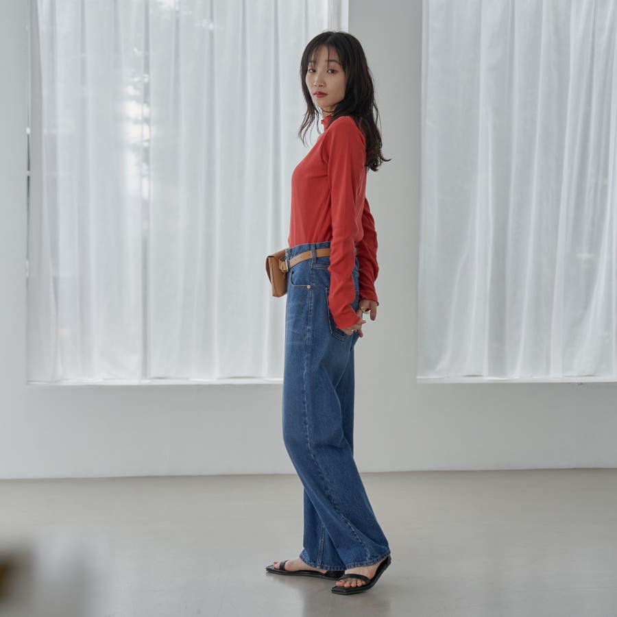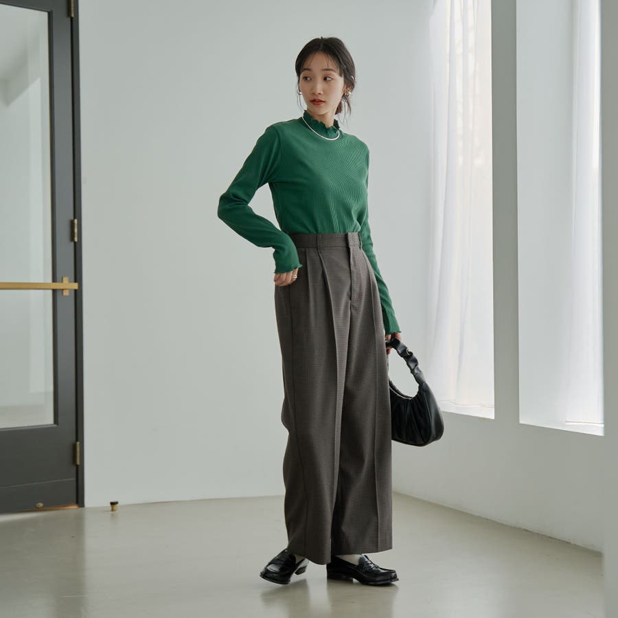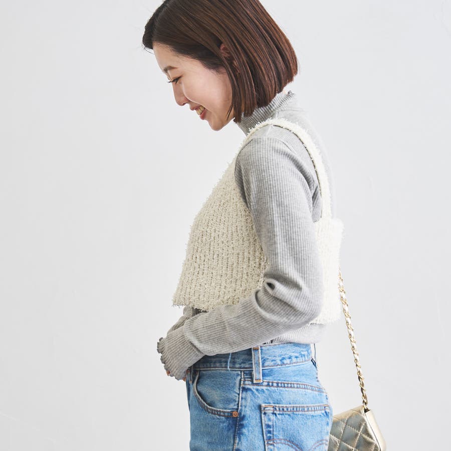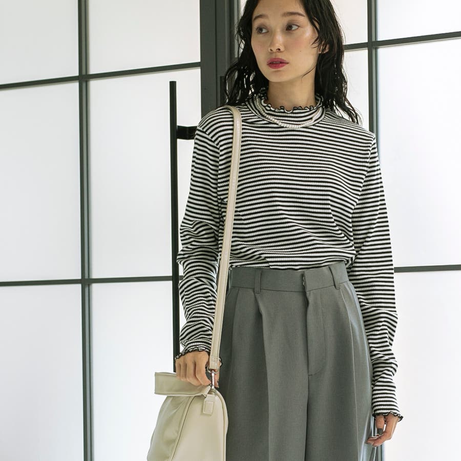 シンプルなリブタートルネックは袖口とネックのメロウなディテールがポイント。