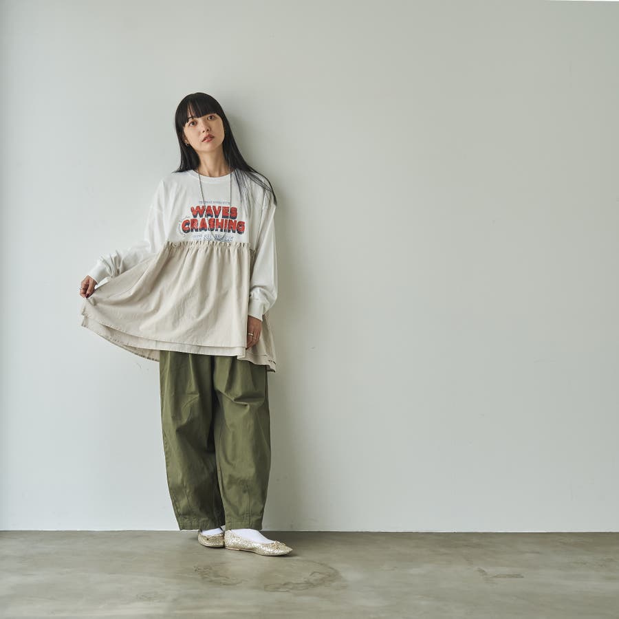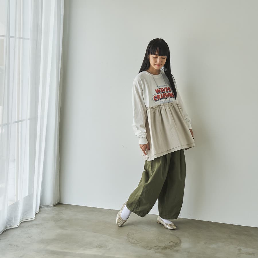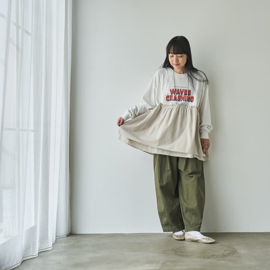 胸元から広がるふんわりとしたシルエットで、カジュアルスタイルにガーリー感をプラスする1枚。