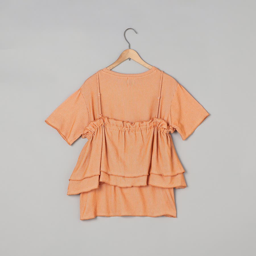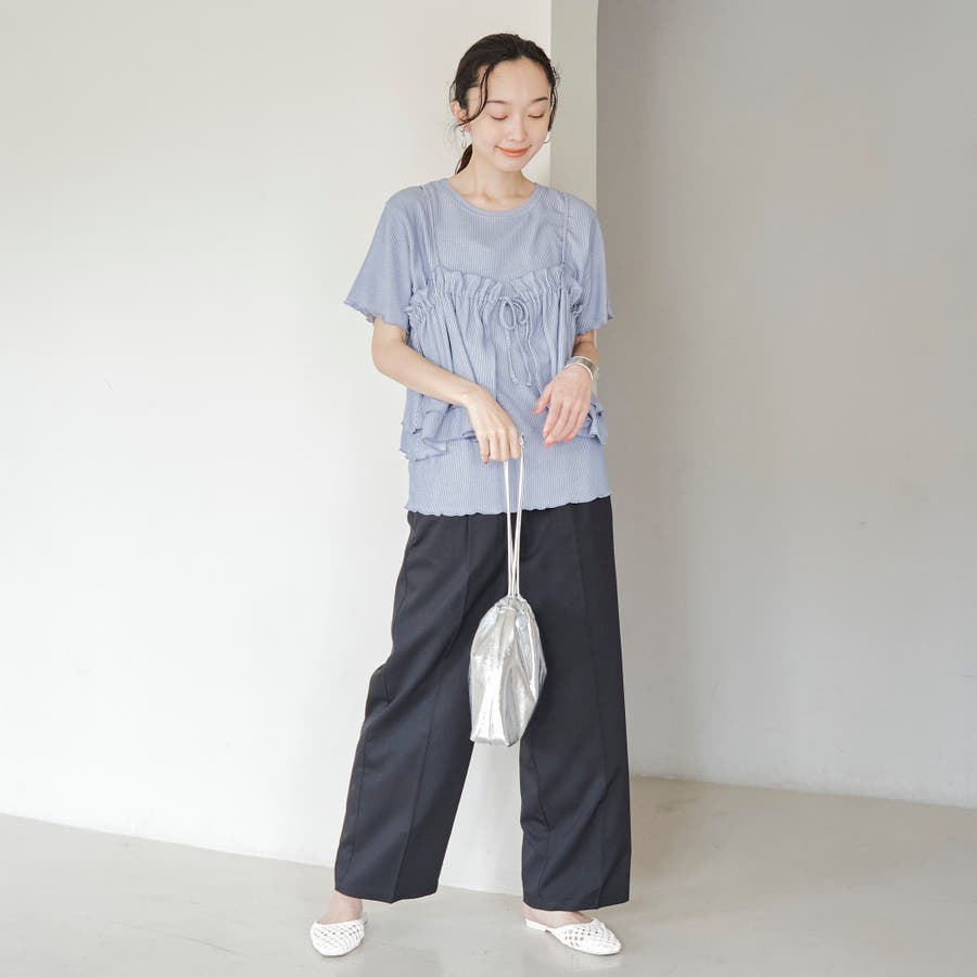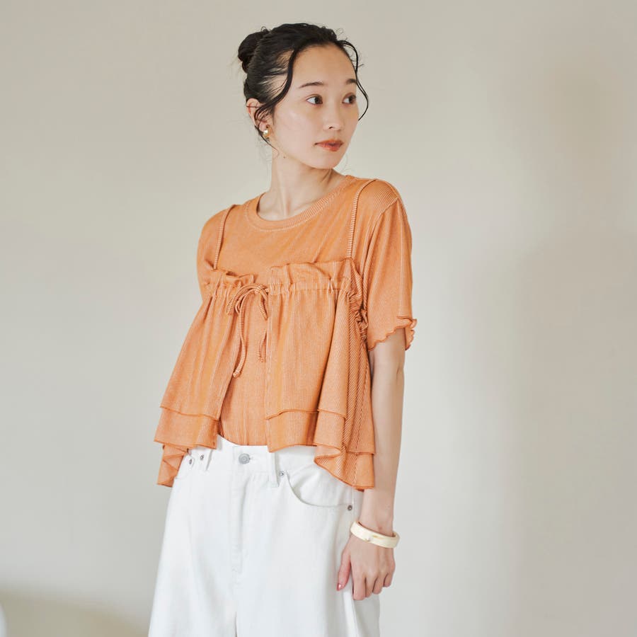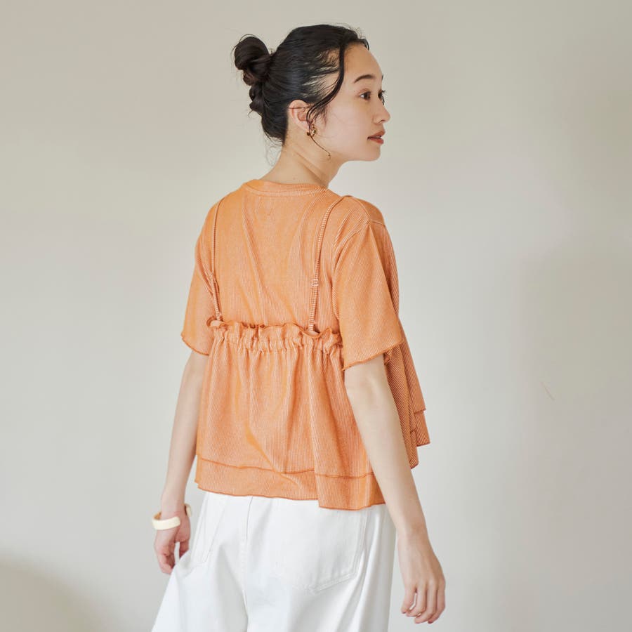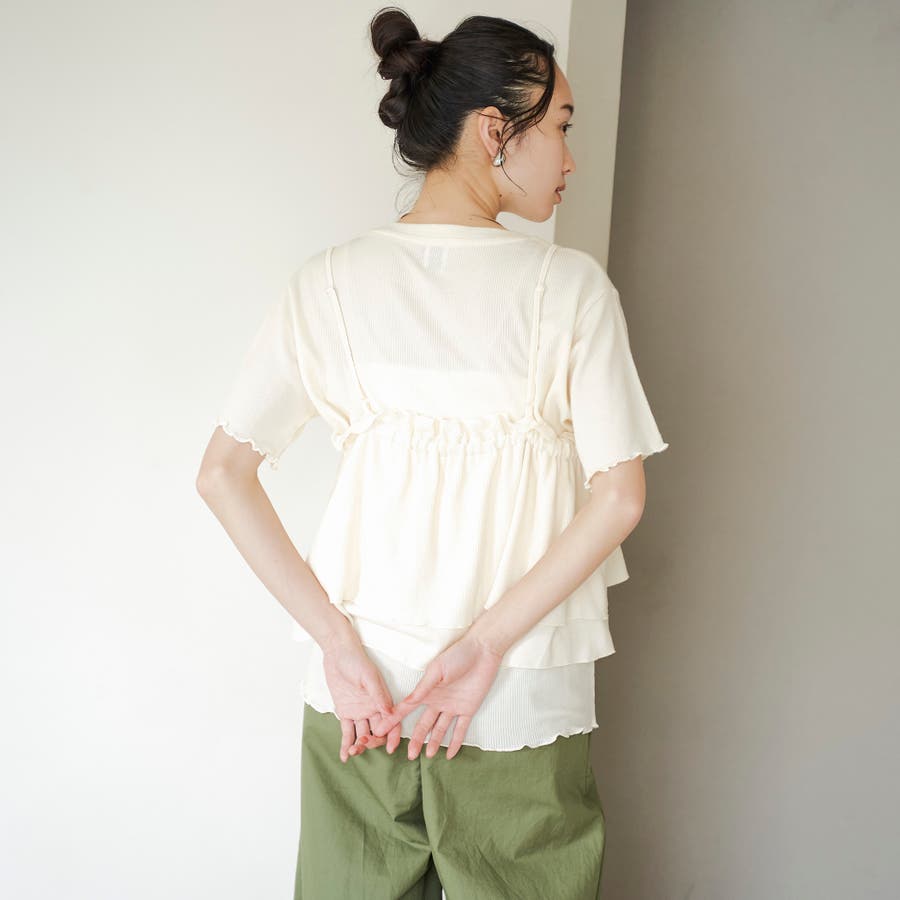 やわらかく伸びの良い細リブカットソーを使用したベーシックなTシャツと、前後2WAYで使えるフリルキャミソールのセットアイテム。