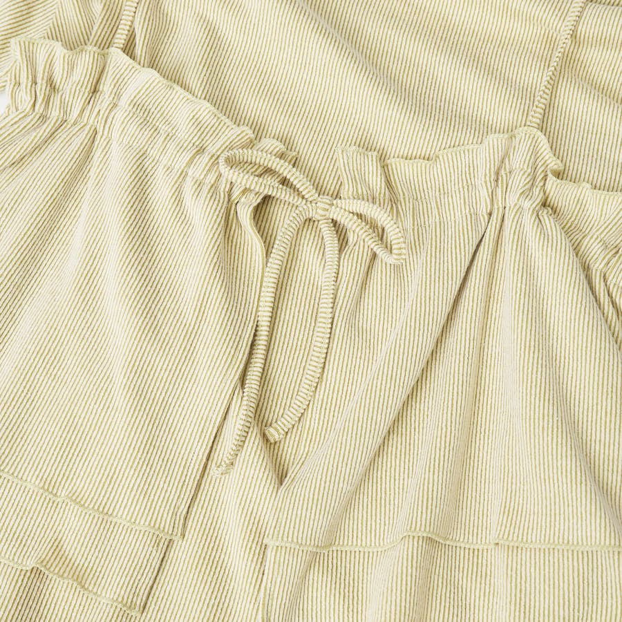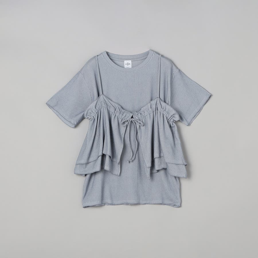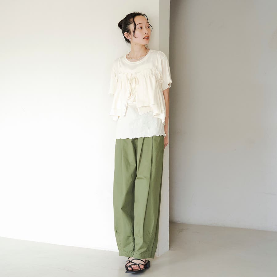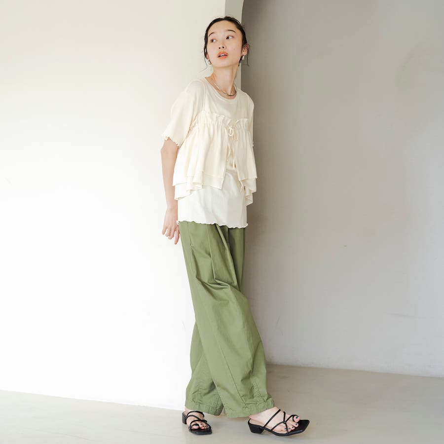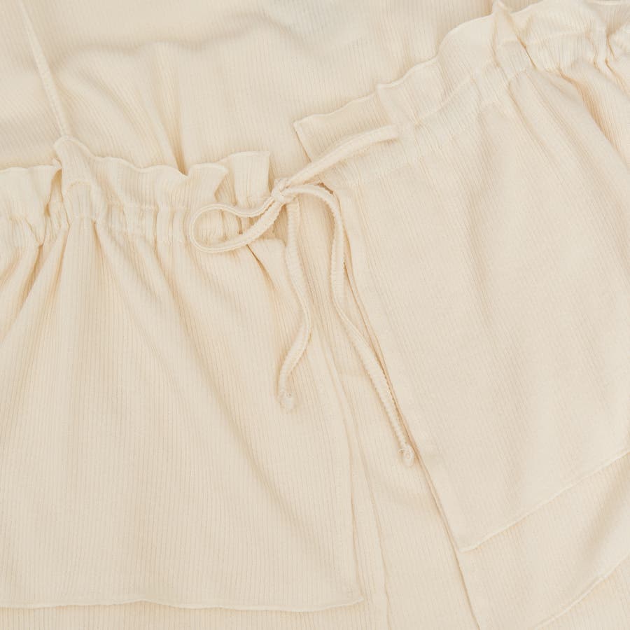 やわらかく伸びの良い細リブカットソーを使用したベーシックなTシャツと、前後2WAYで使えるフリルキャミソールのセットアイテム。