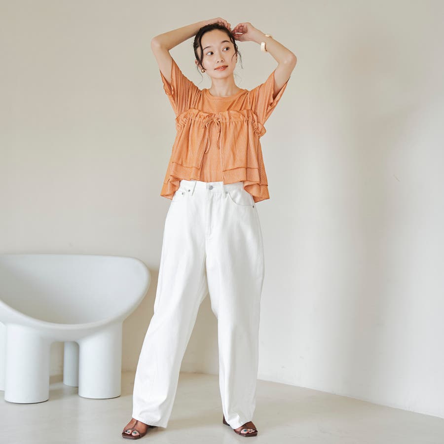 シンプルなTシャツに、フリルキャミを重ねて甘さをプラスすれば、カジュアルながらもフェミニンな着こなしに。