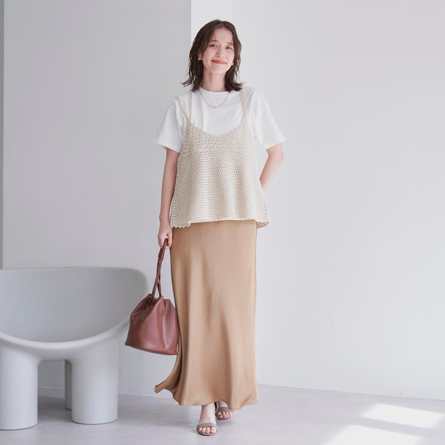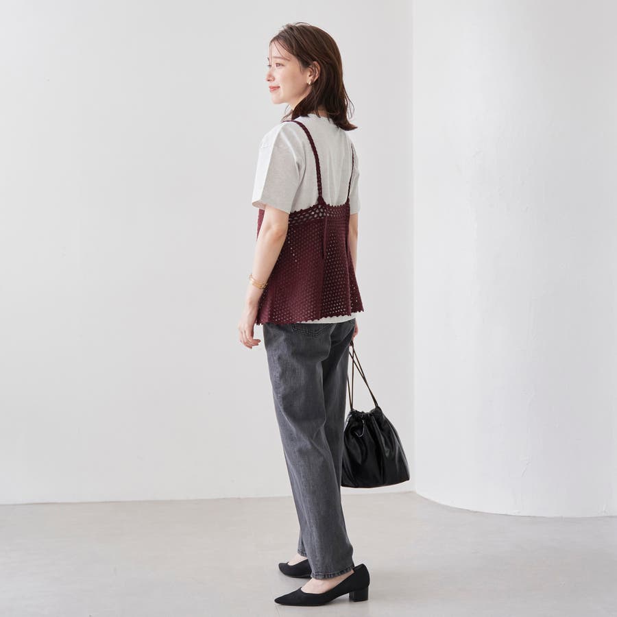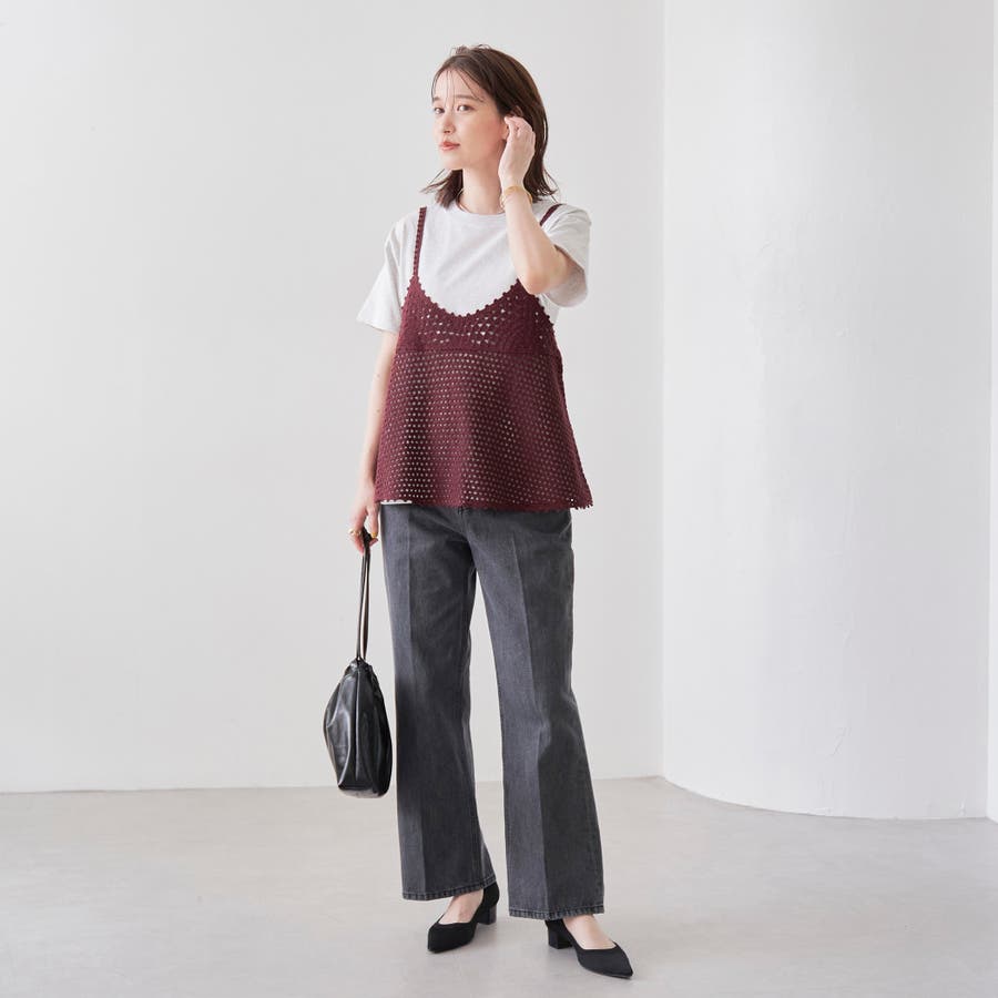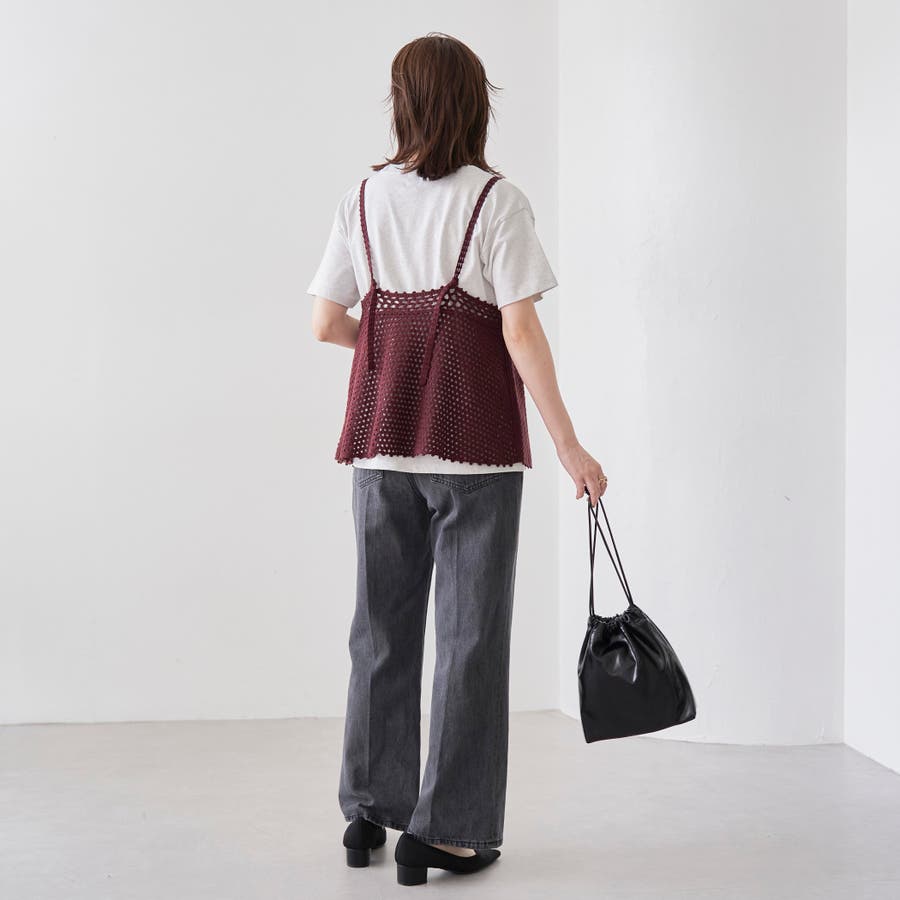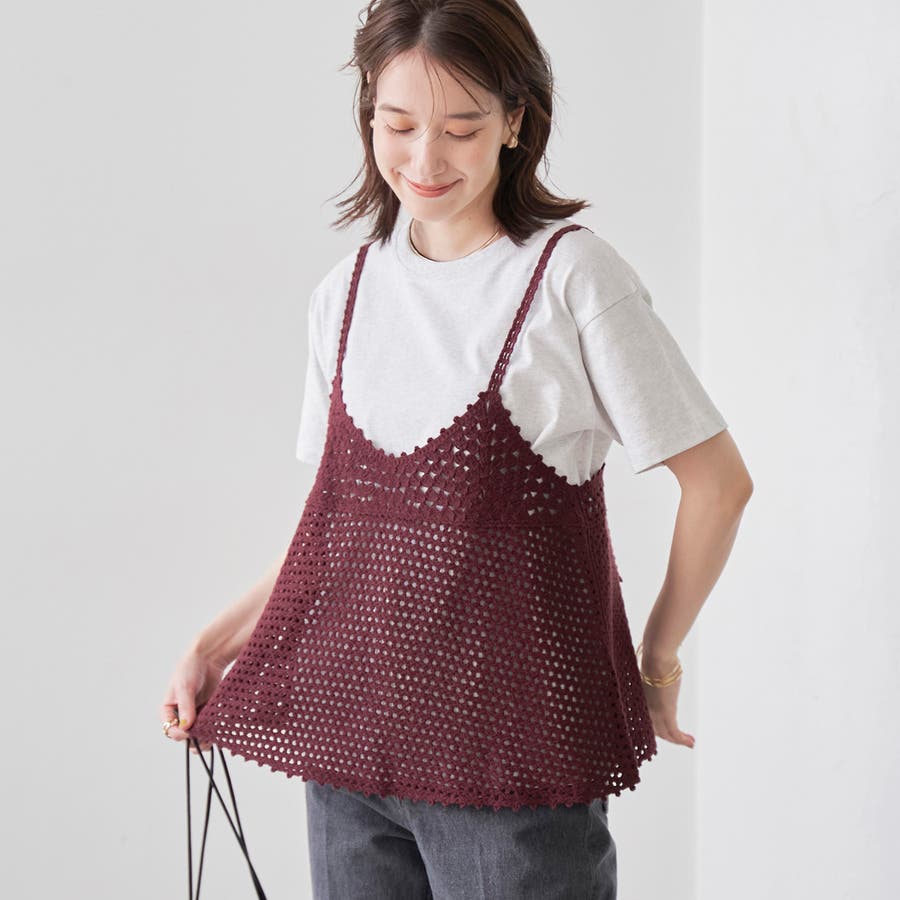 キャミは繊細な編み目が魅力のクロシェ編みで、レイヤードするだけでトレンド感のあるスタイリングに。
