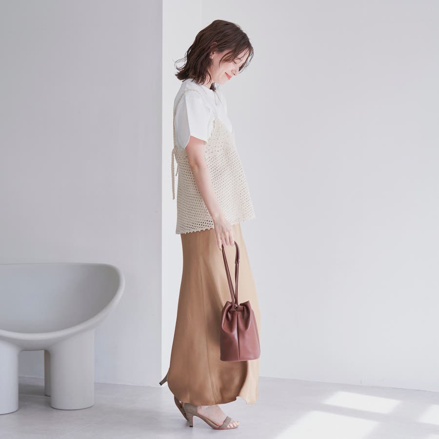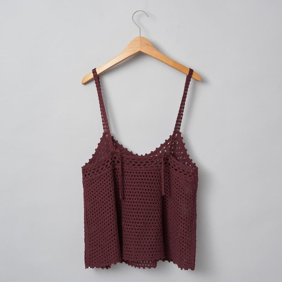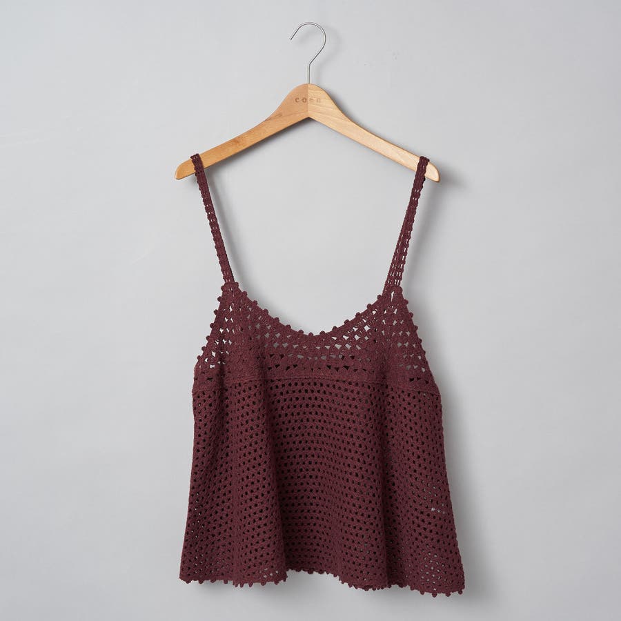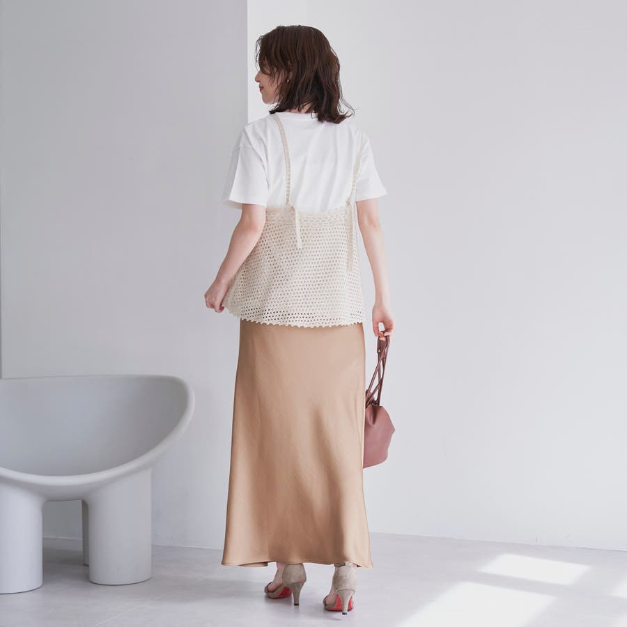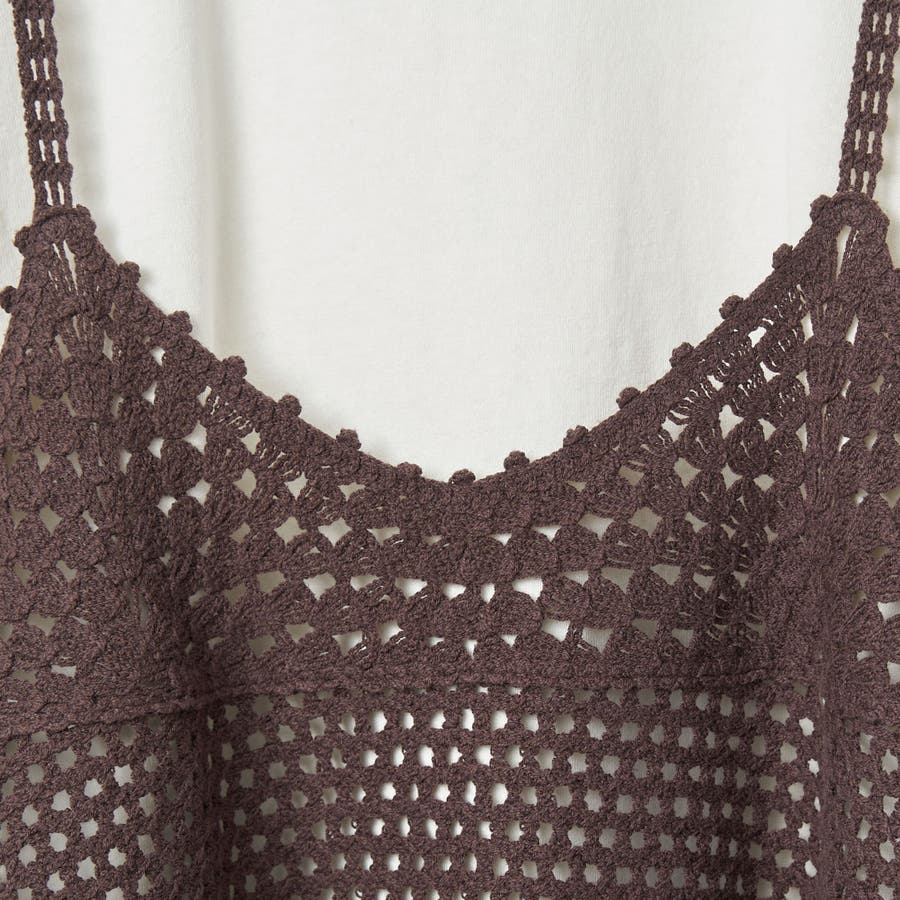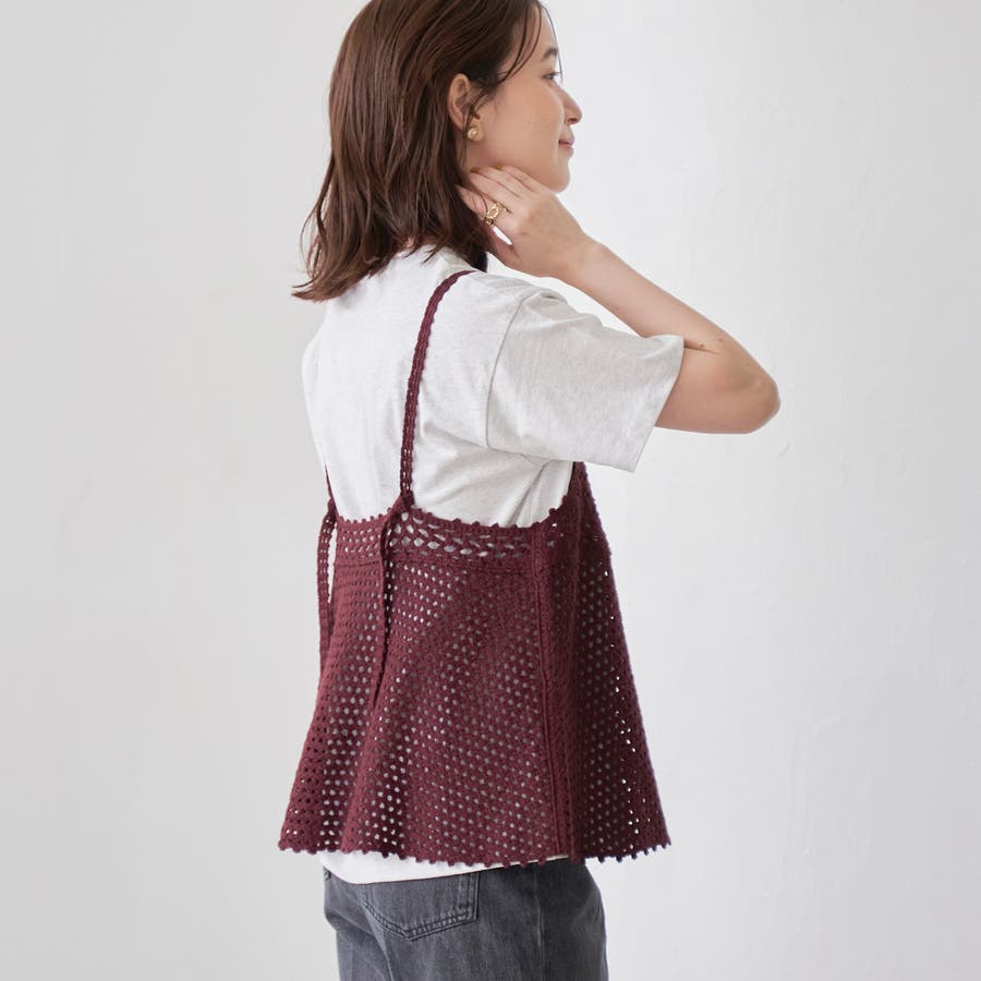 キャミは繊細な編み目が魅力のクロシェ編みで、レイヤードするだけでトレンド感のあるスタイリングに。