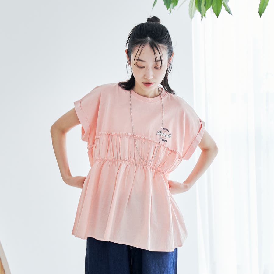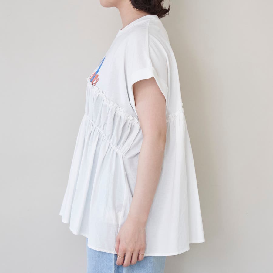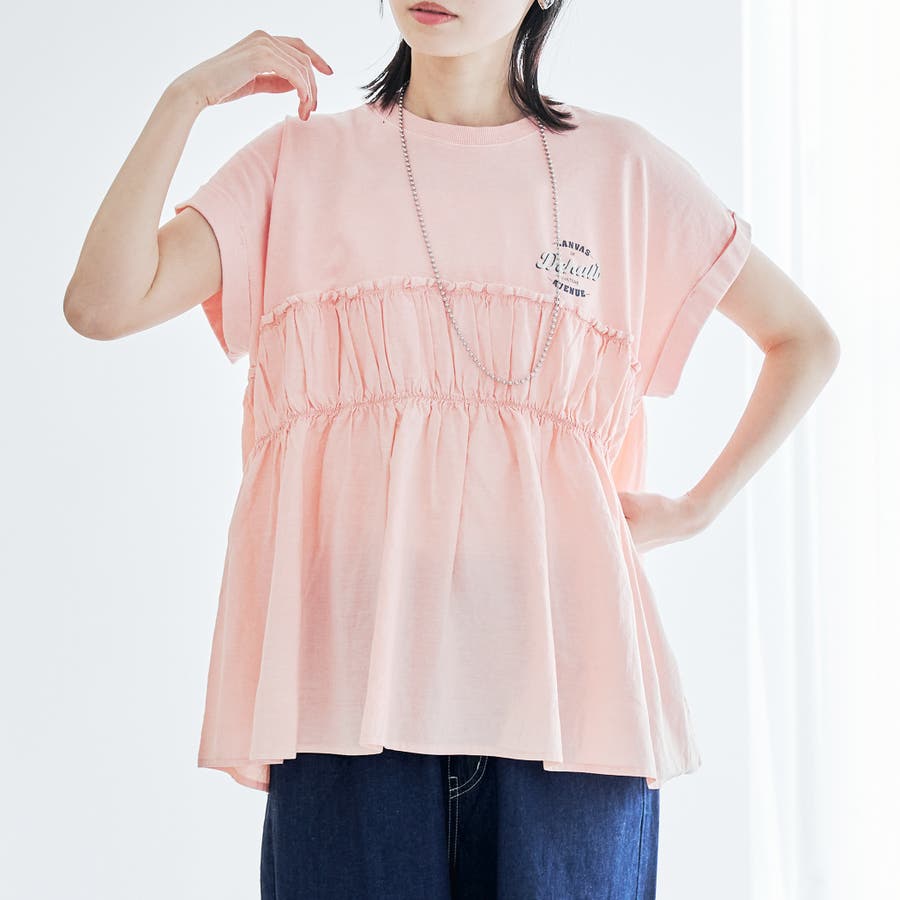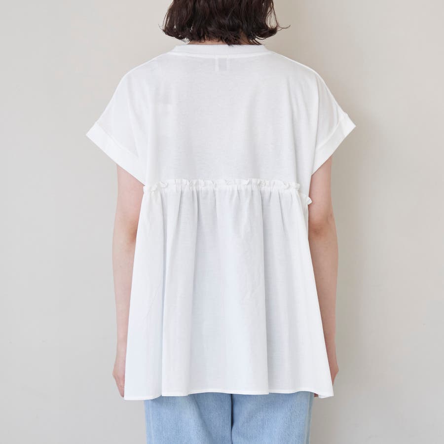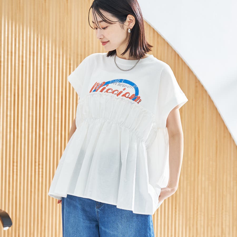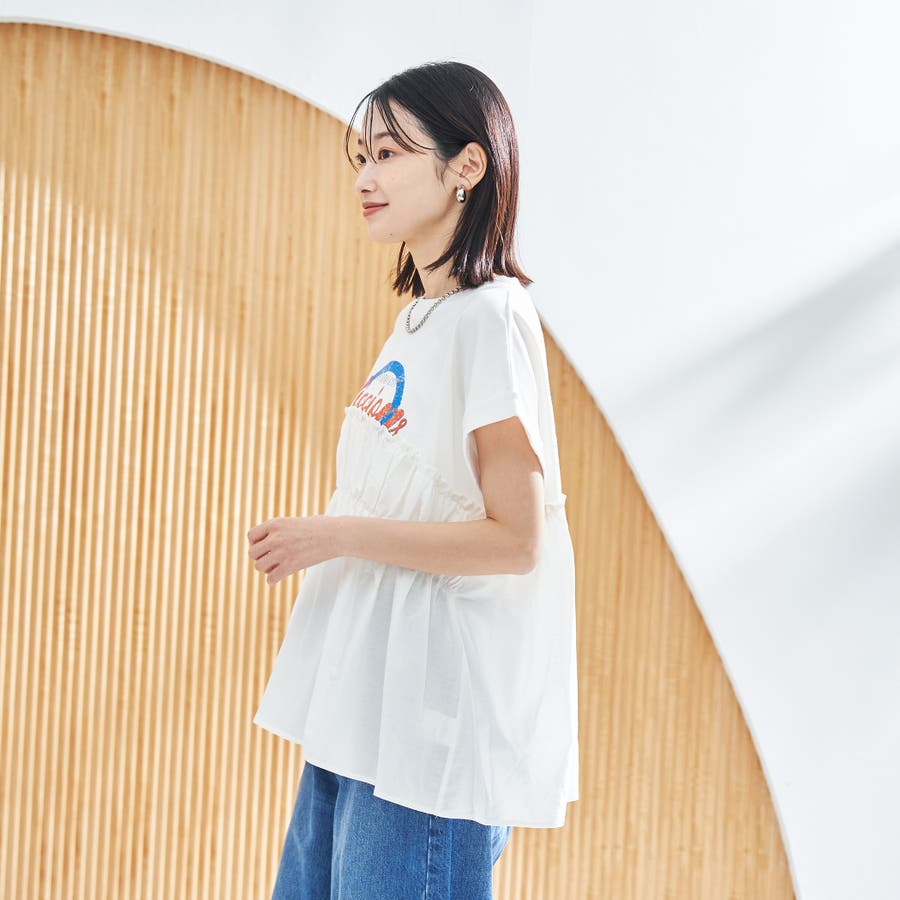 胸から下を布帛で切り替えたドッキングTシャツは、一枚でスタイルが決まる夏にぴったりのアイテム。