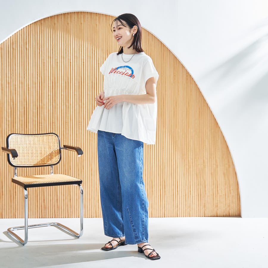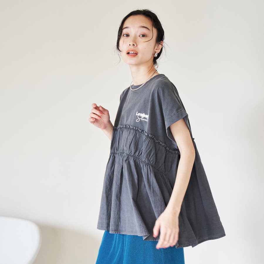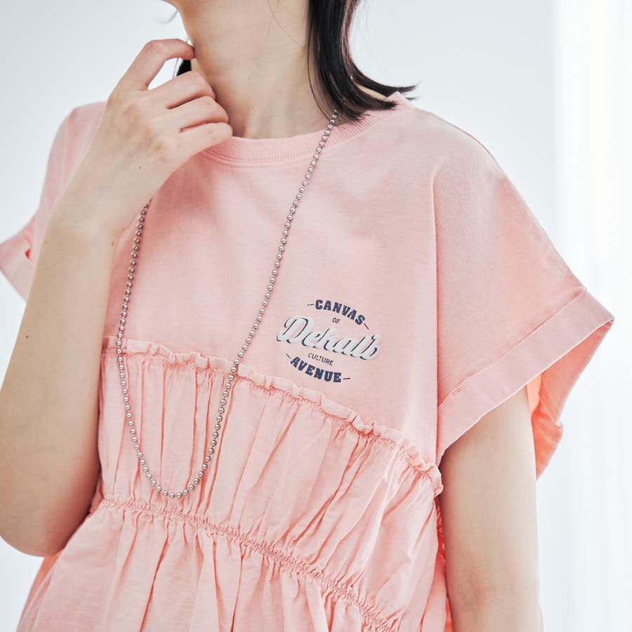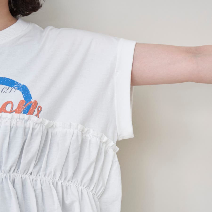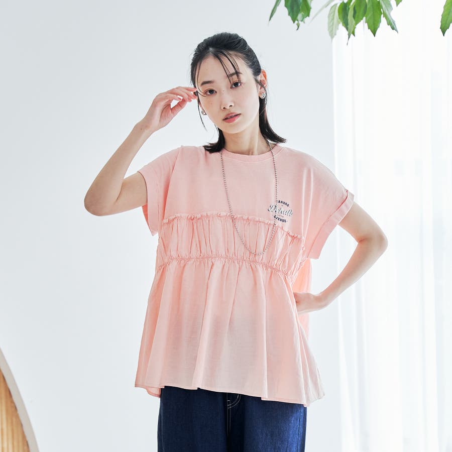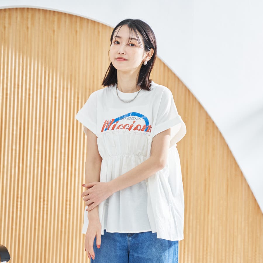 胸から下を布帛で切り替えたドッキングTシャツは、一枚でスタイルが決まる夏にぴったりのアイテム。