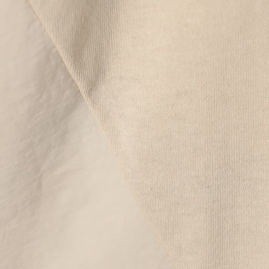 コットンの柔らかさとナイロンの軽やかさを組み合わせた布帛ドッキングデザインで、カジュアルながらもひと味違う表情に仕上げています。