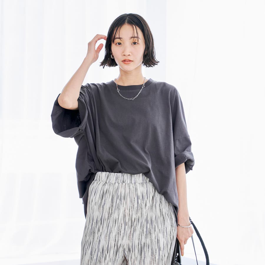 たっぷりとしたシルエットなので、柔らかい素材のパンツやナロースカートとのコーディネートがおすすめ。