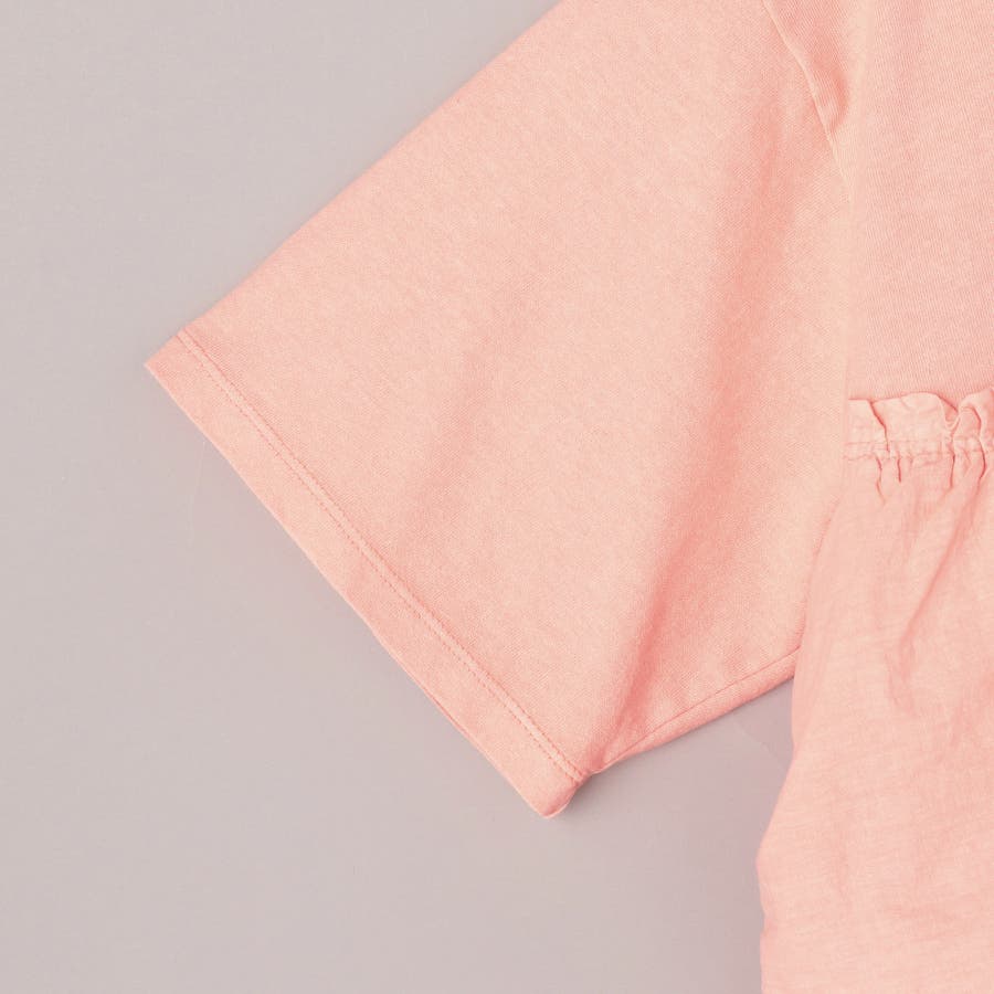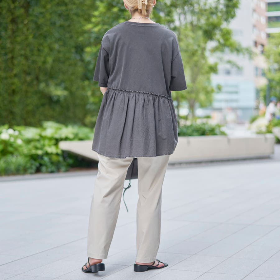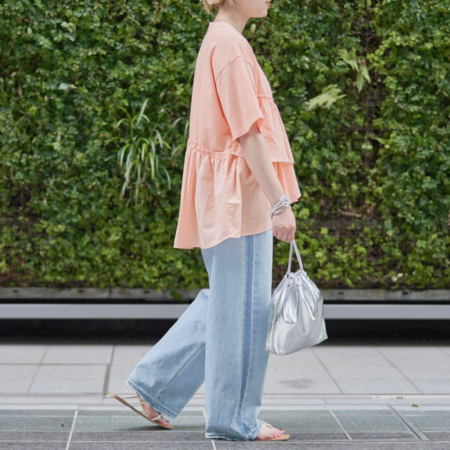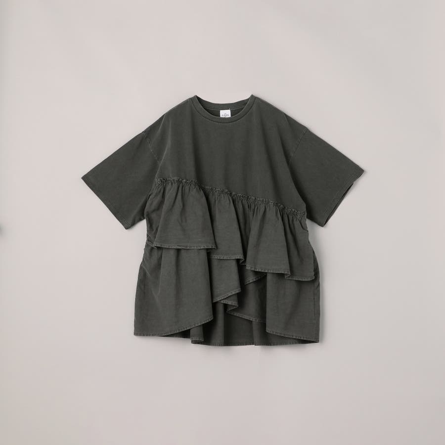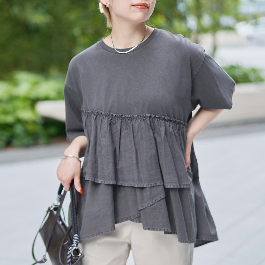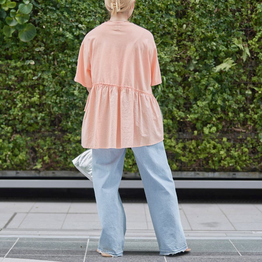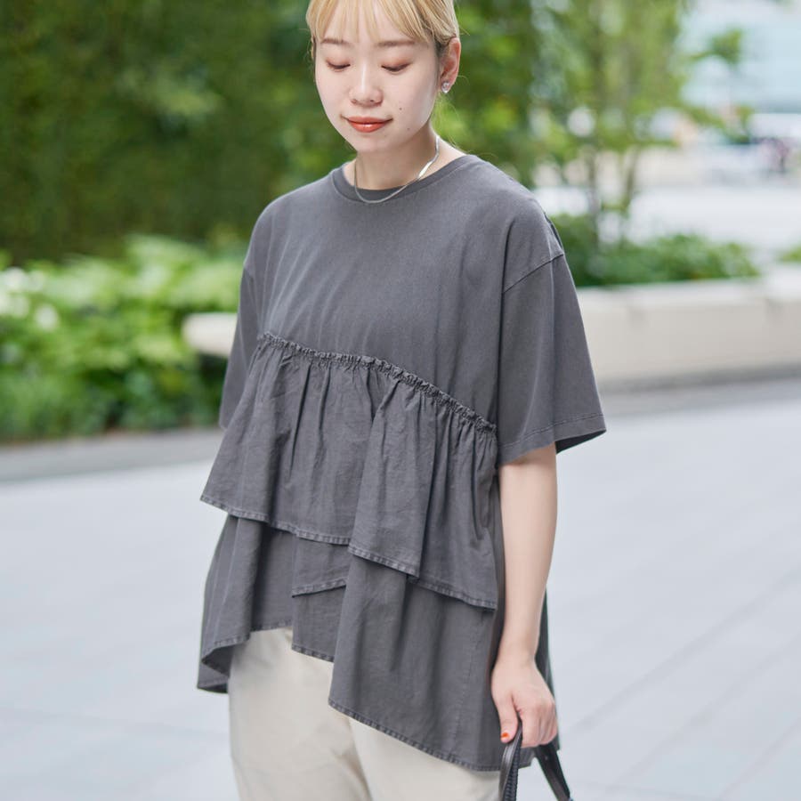 ヴィンテージ感のあるピグメント加工に、ふんわりとしたフリルがドッキングされたデザインで、大人カジュアルにほんのり甘さをプラス。