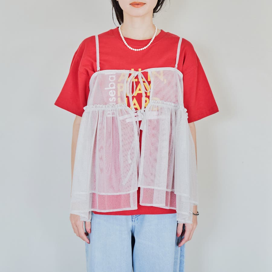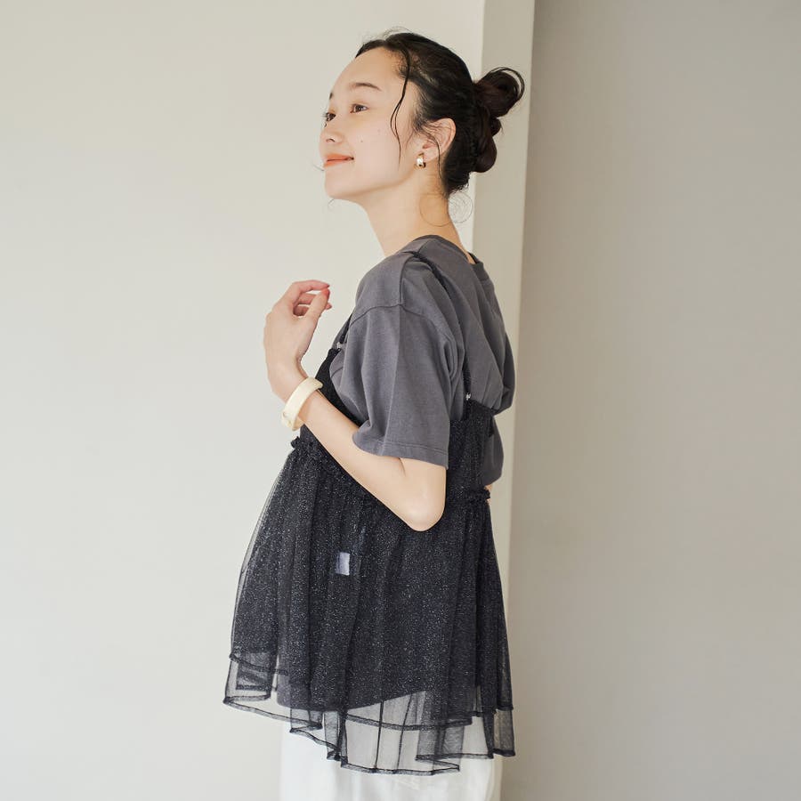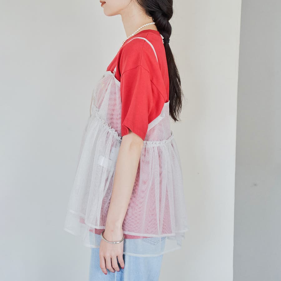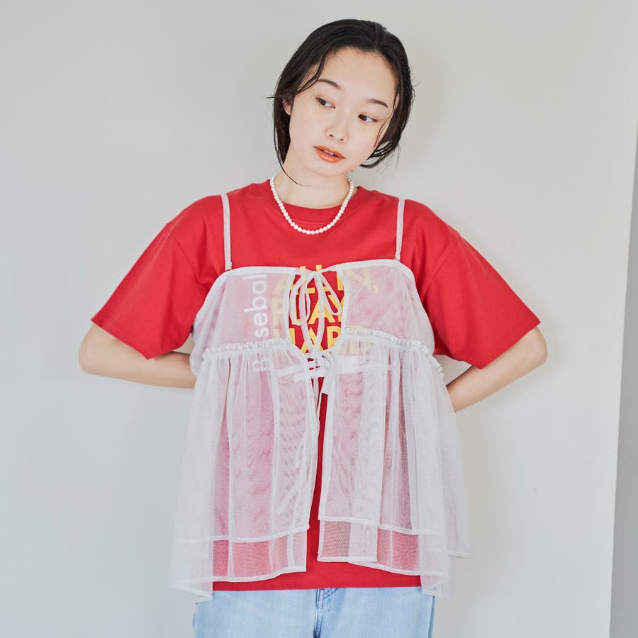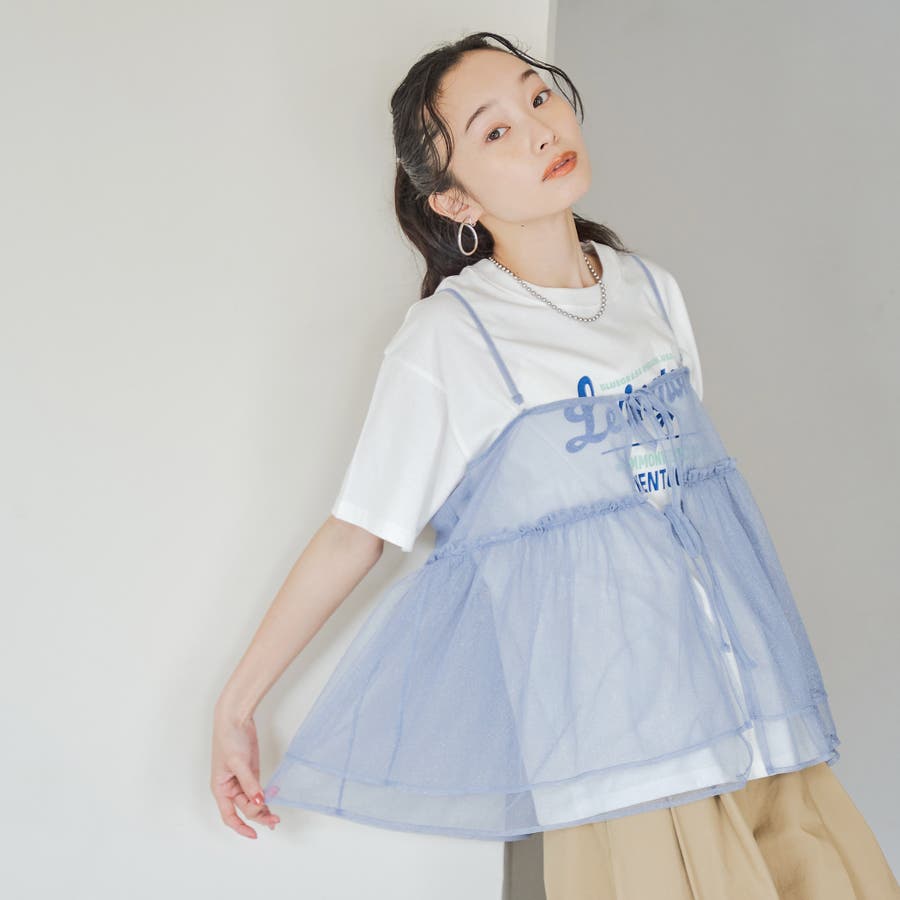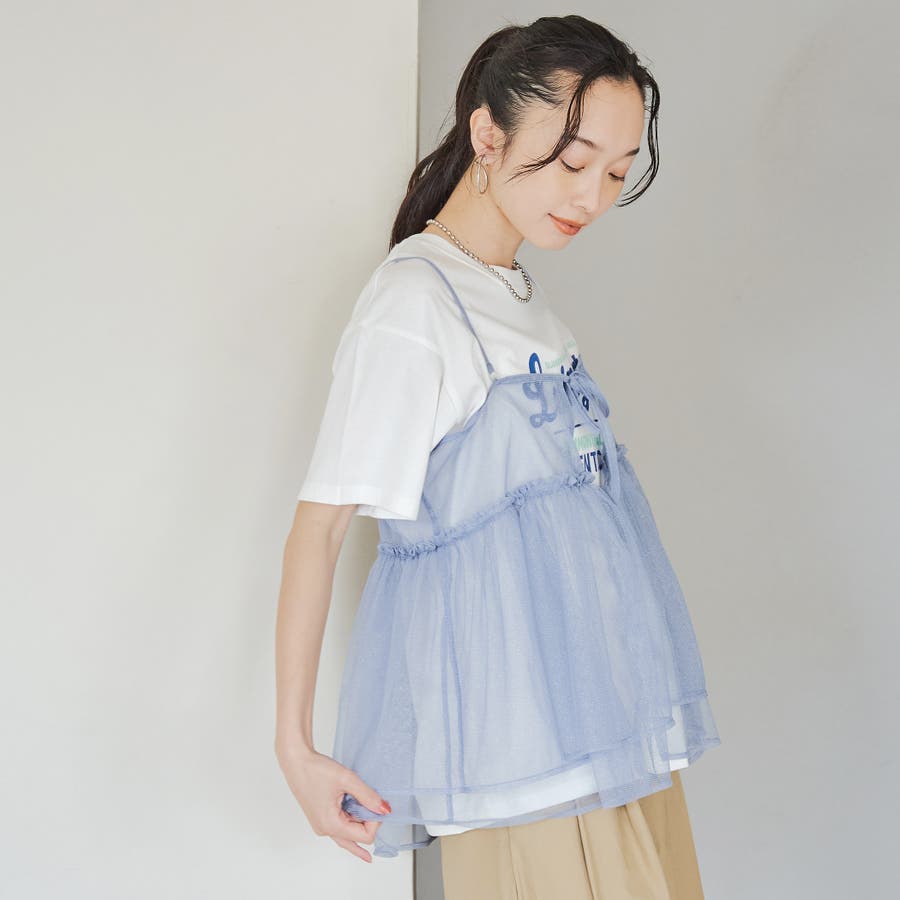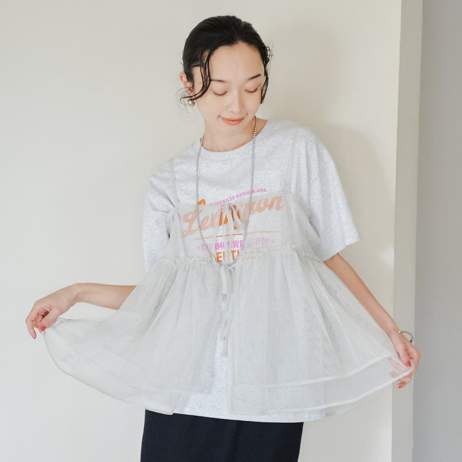エアリーなチュールレースのキャミソールをTシャツに重ねた、レイヤード風のセットアイテム。