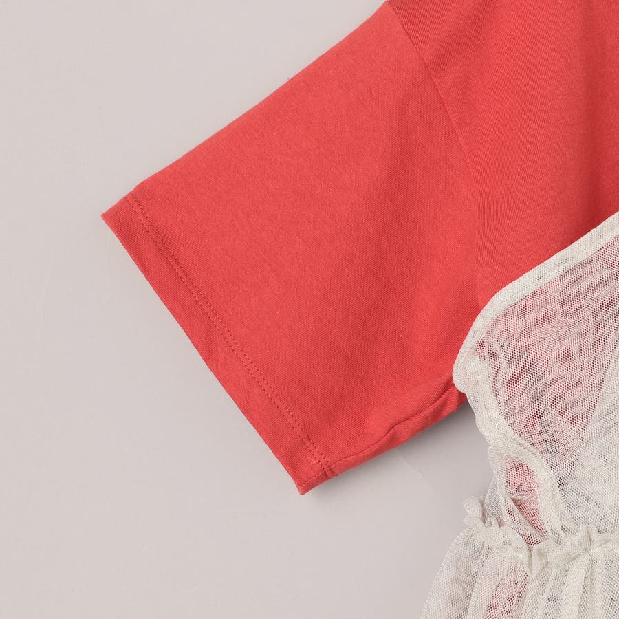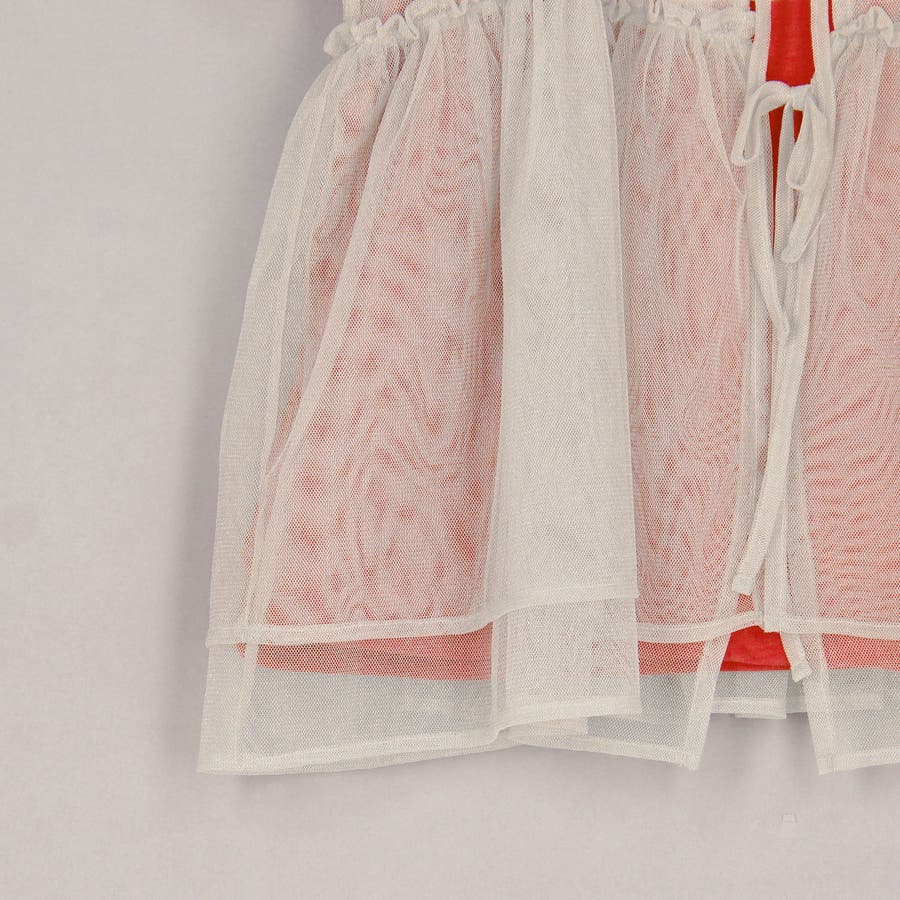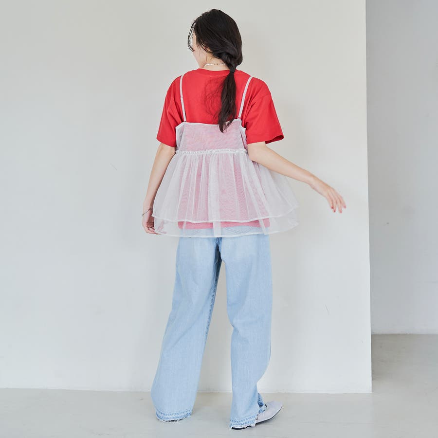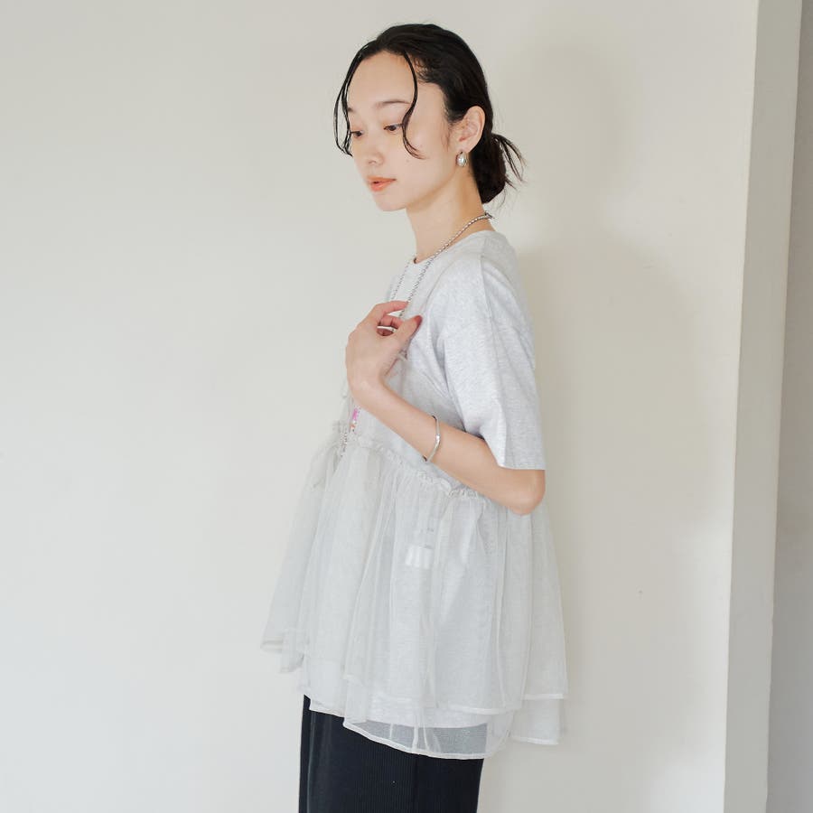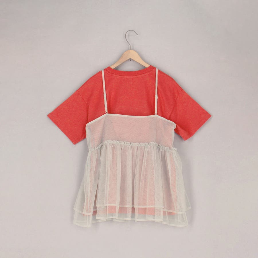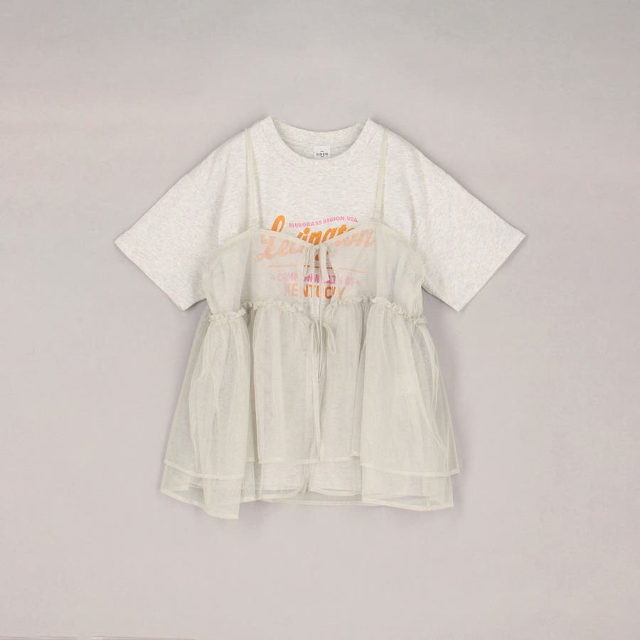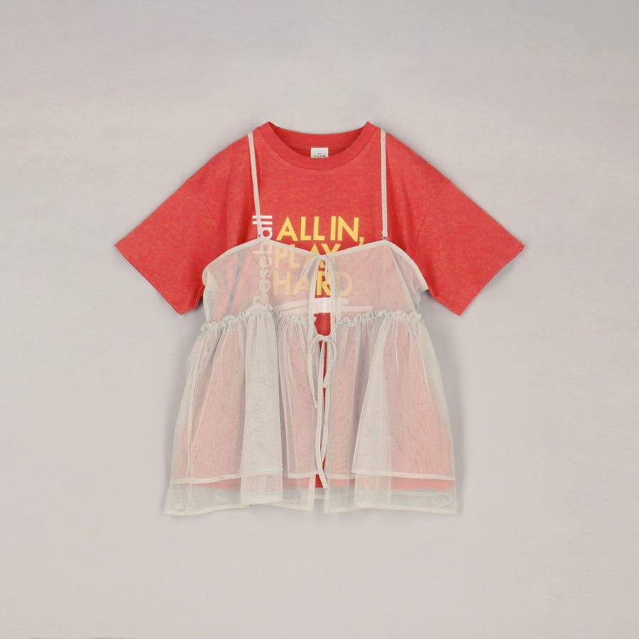 エアリーなチュールレースのキャミソールをTシャツに重ねた、レイヤード風のセットアイテム。