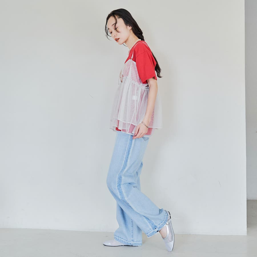 キャミソールは軽やかで透け感のあるチュールレース素材で、動くたびに表情の出るデザインです。