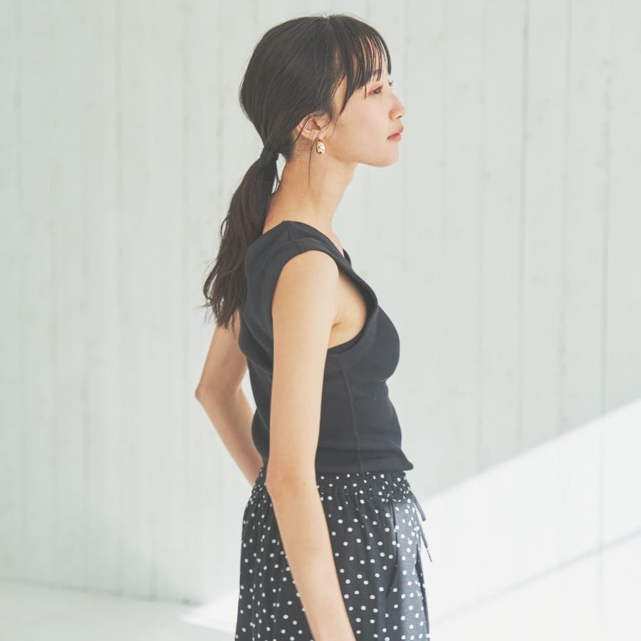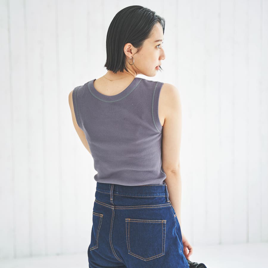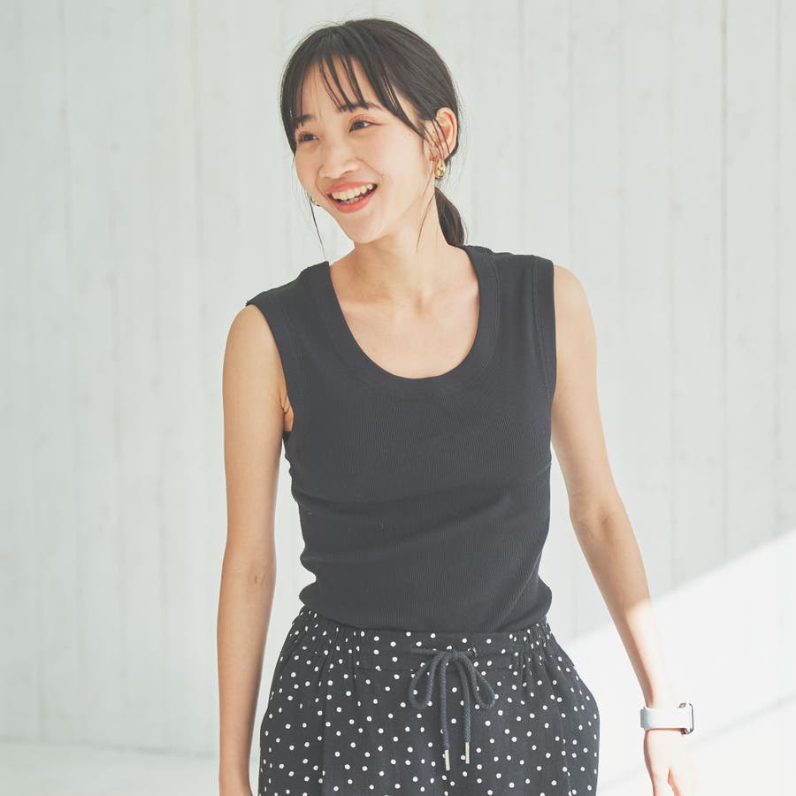 前後に深く開いたネックラインや、襟ぐりと袖ぐりの幅広リブがポイントの定番タンクトップ。