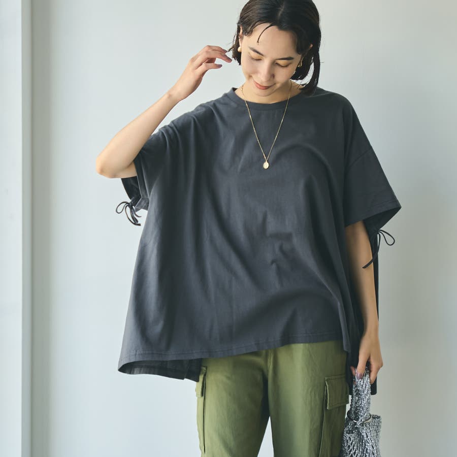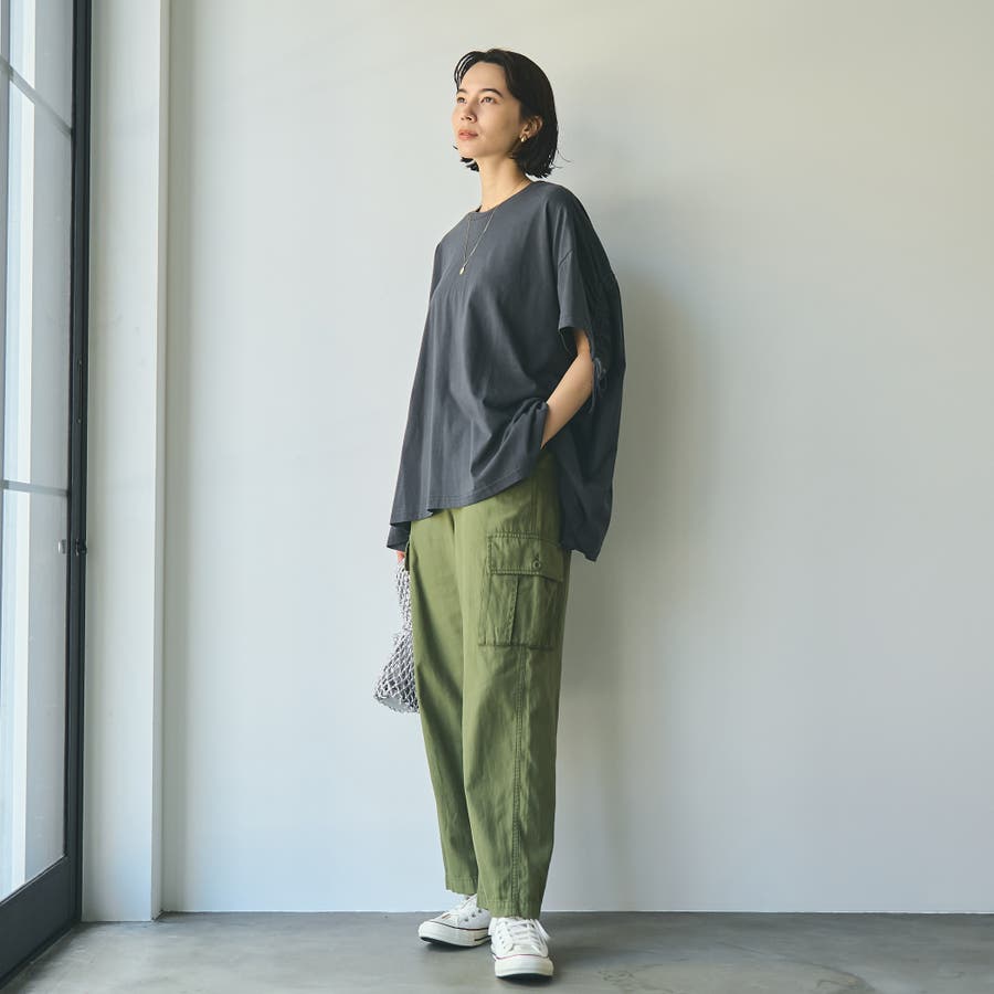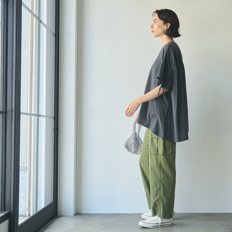 身幅やお袖周りなどをルーズに仕上げることで、らくちんな着心地だけでなくスタイルカバーにも◎