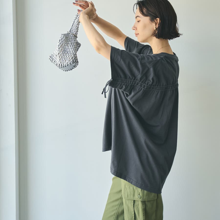 フロントはゆったりとしたシルエットのシンプルなデザインに、バックはドロストシャーリング仕様が今年らしい1枚。