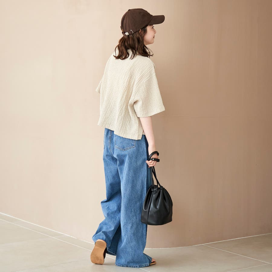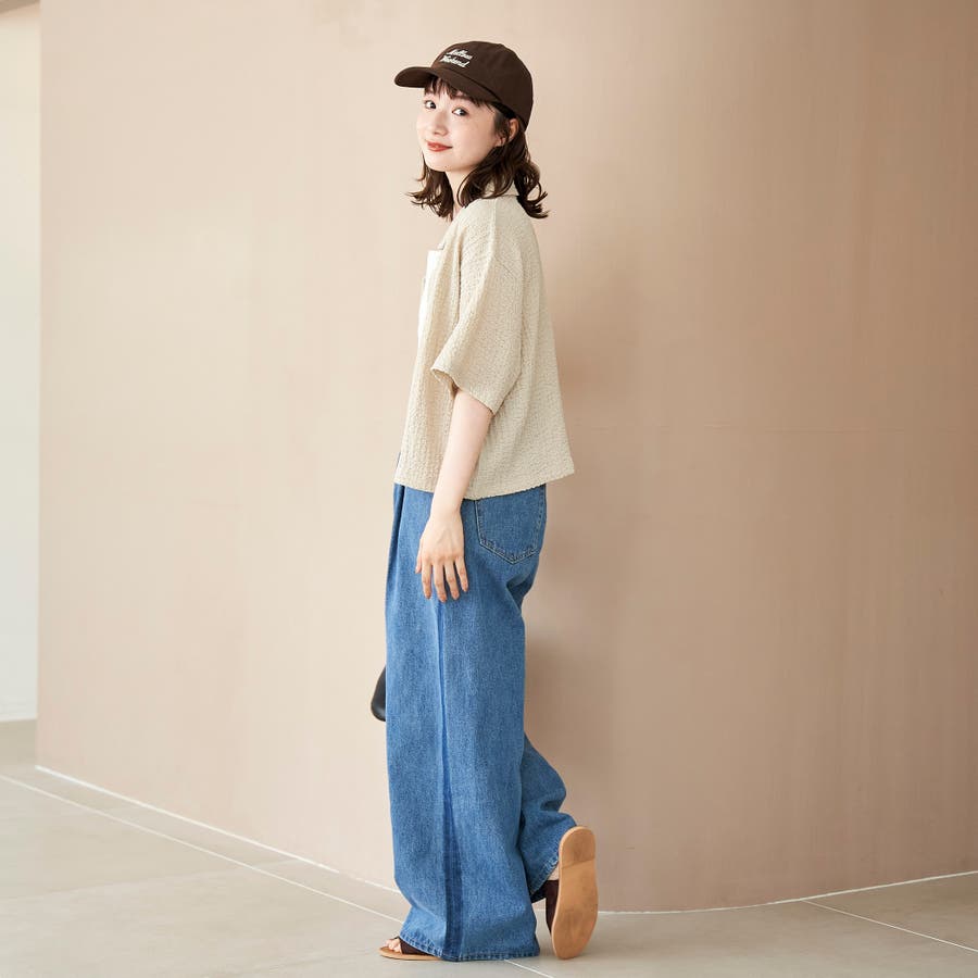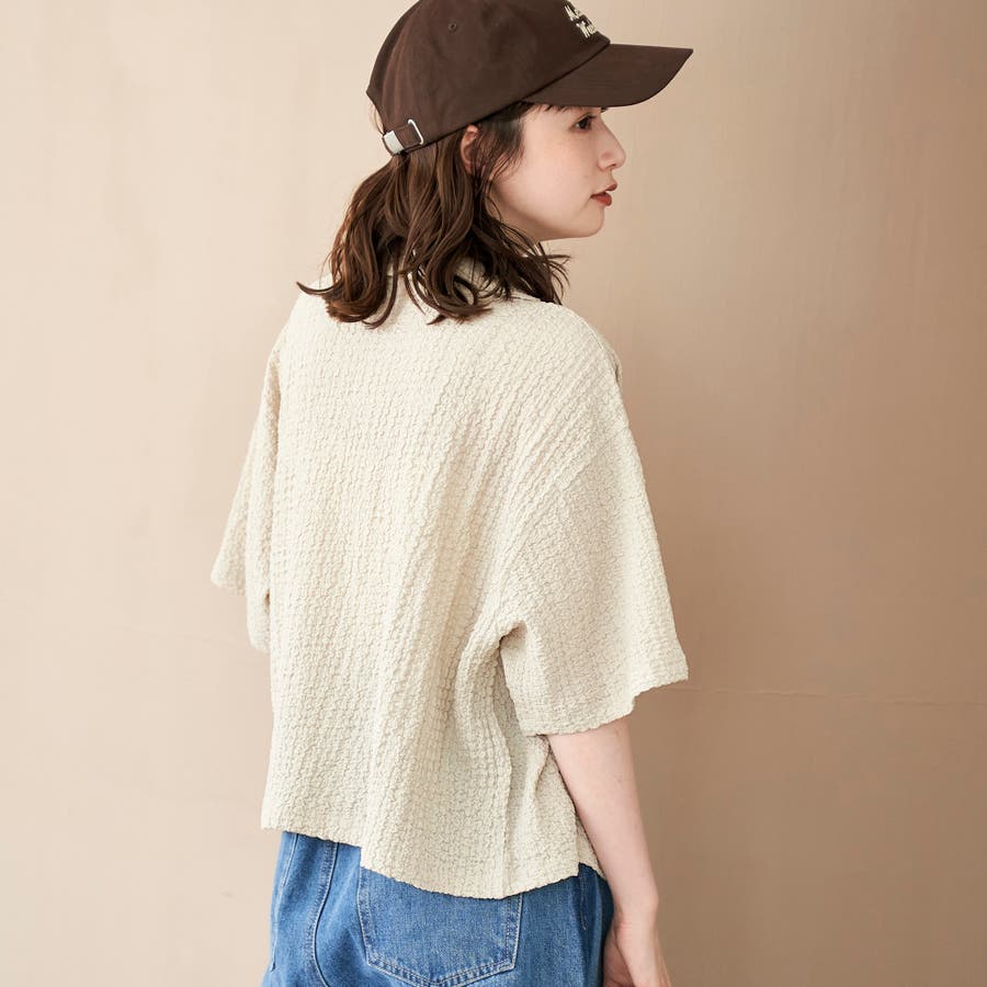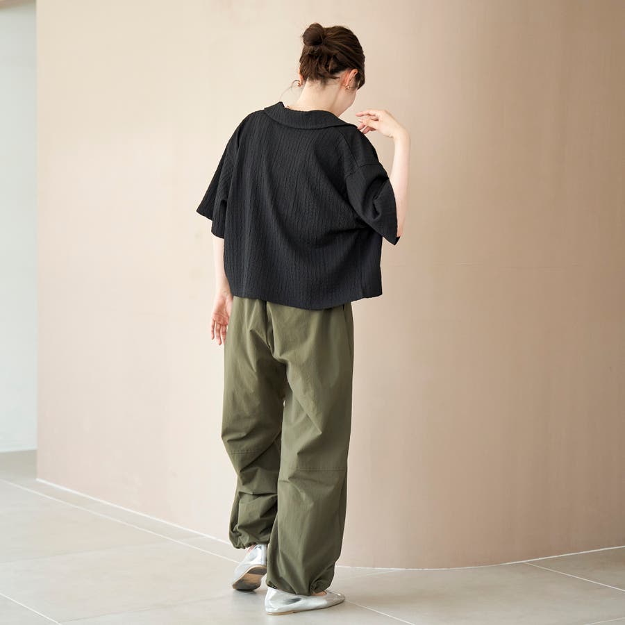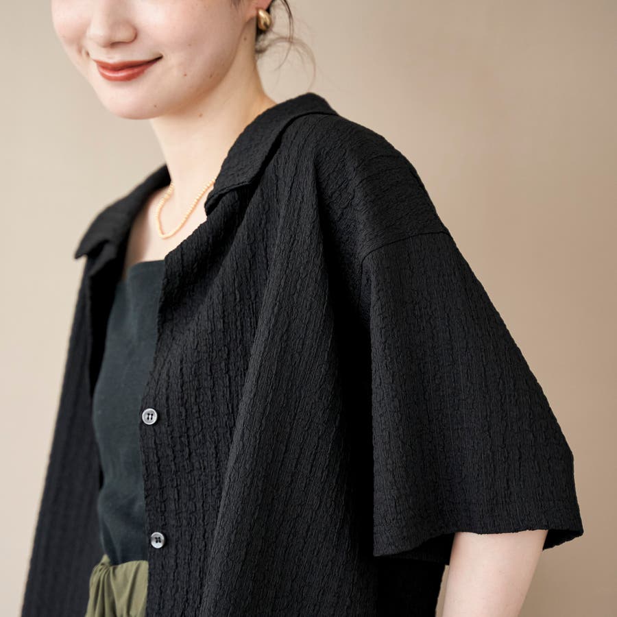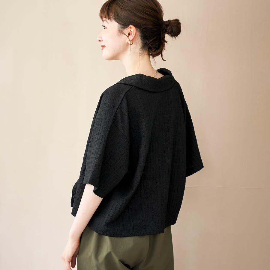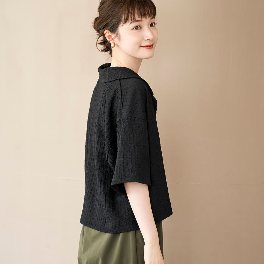 二の腕が隠れる程よいワイドシルエットの5分袖シャツ。