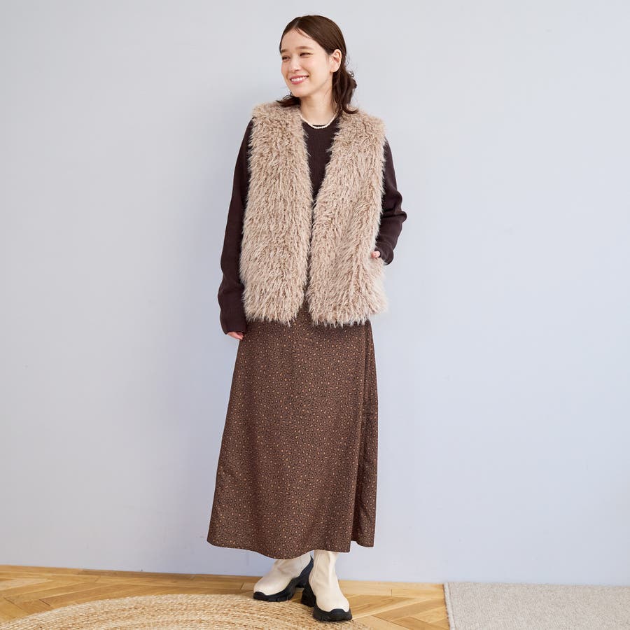 ムートンブーツを合わせると、足元まであたたかい季節感たっぷりのスタイルに。