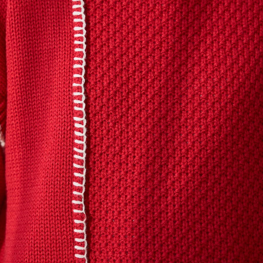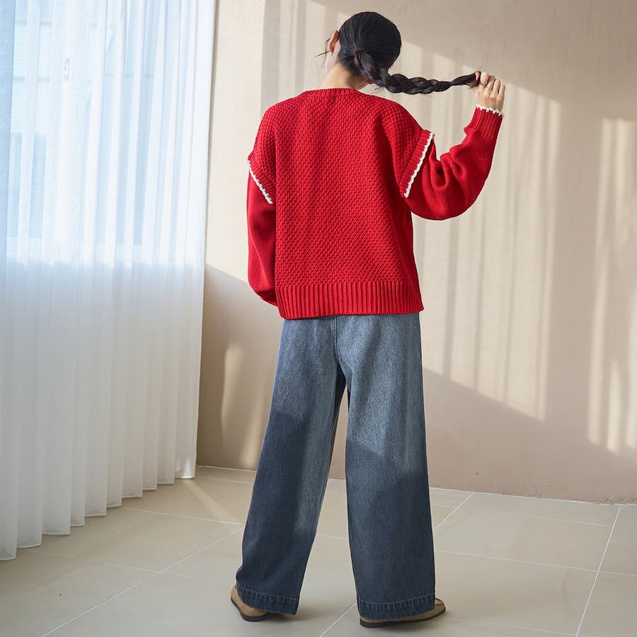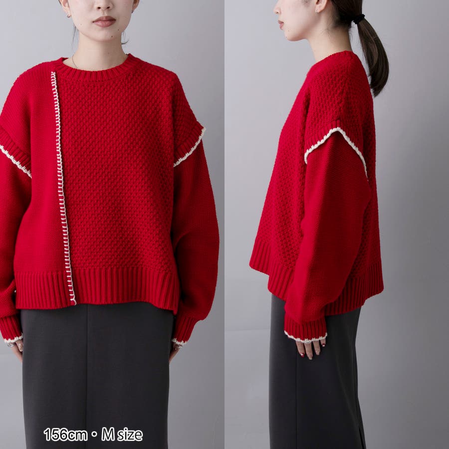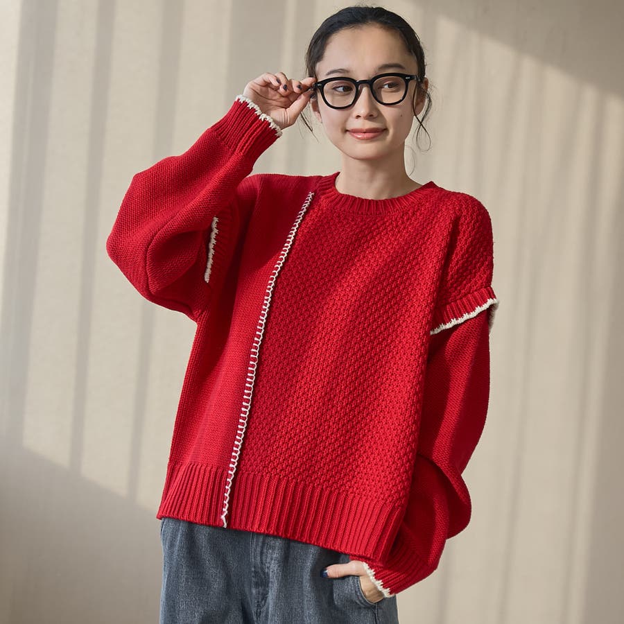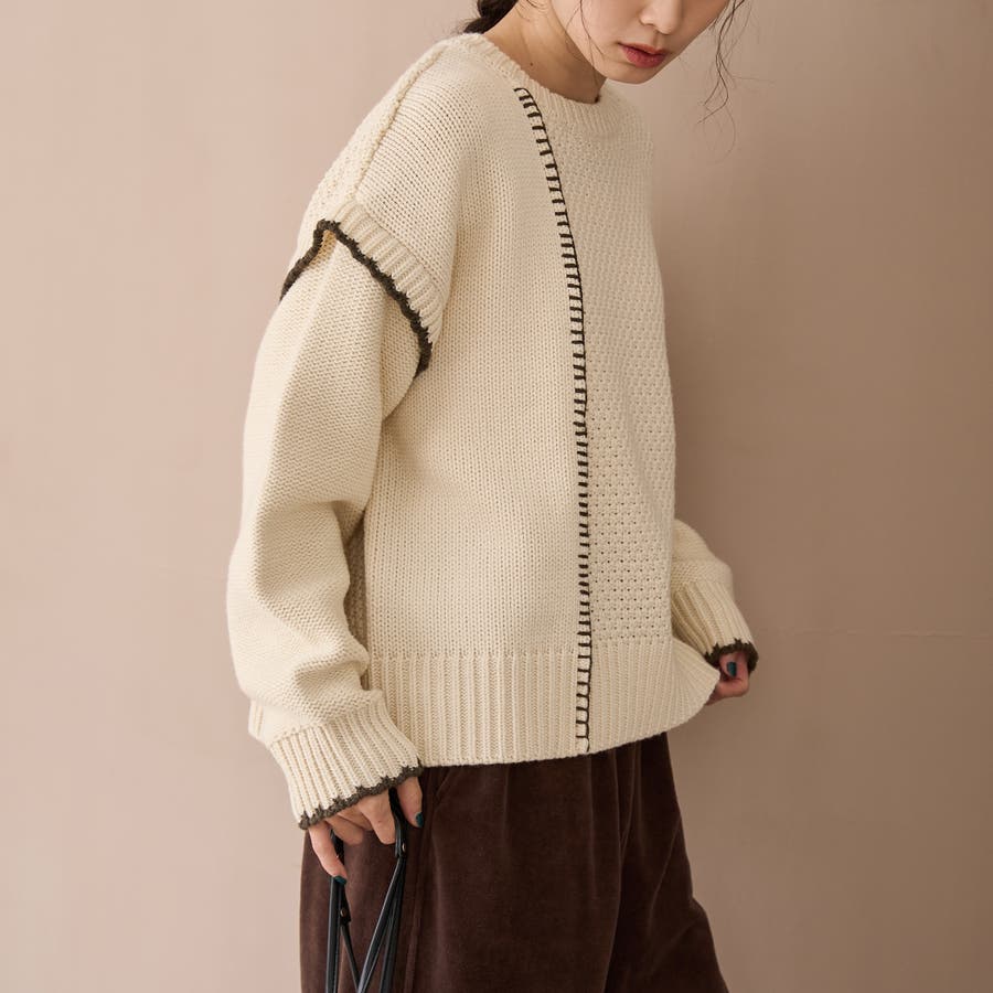 パッチワークのように編柄を切り替えたデザインと、配色ステッチが印象的な配色ステッチパッチワークニット。