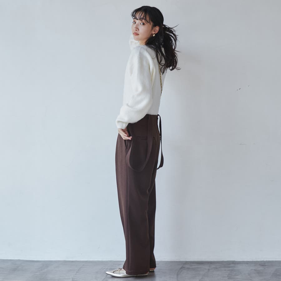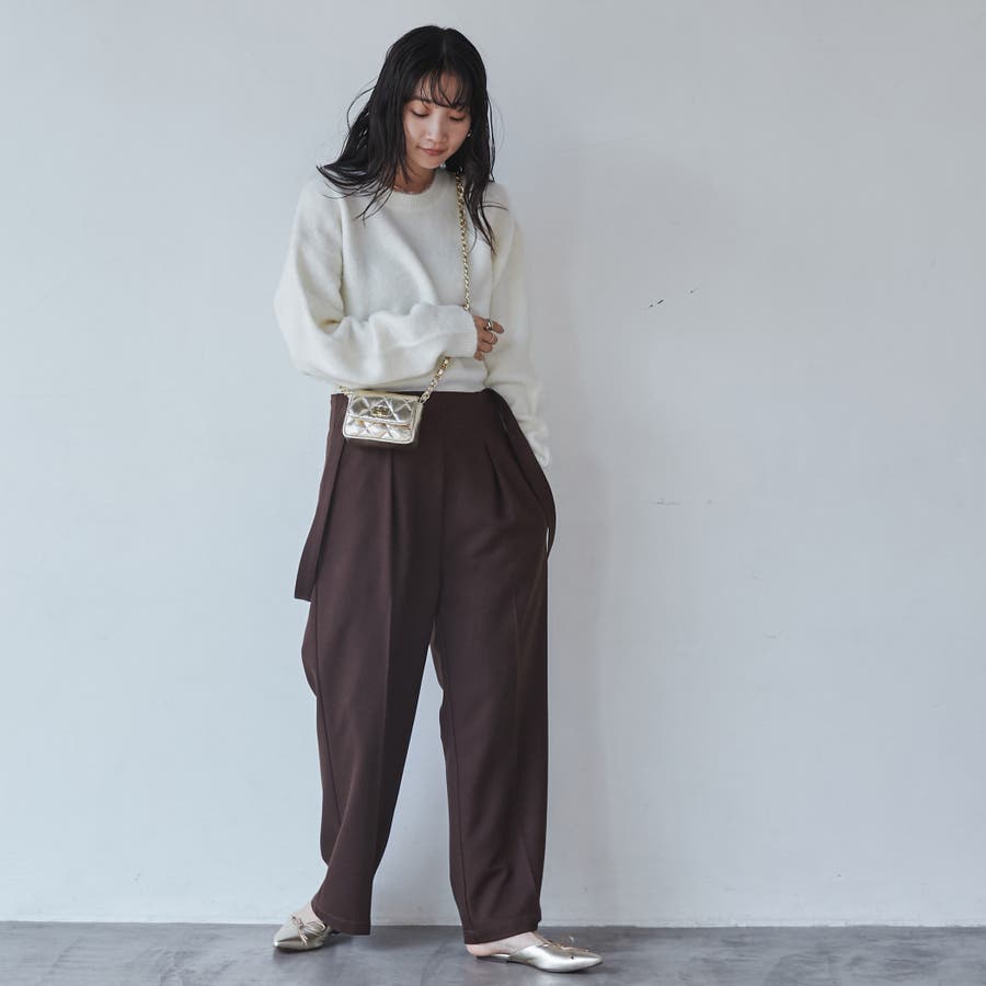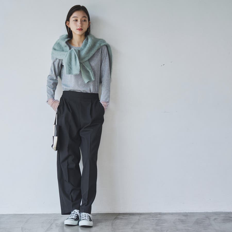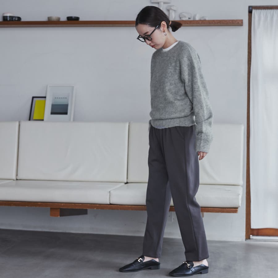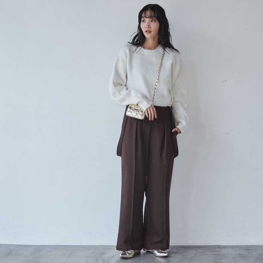 女性らしい雰囲気のあるニットなのであえてのスラックスパンツなどに合わせたり、インナーにはメロータートルやシャツ衿をのぞかせてのコーデがおすすめです。