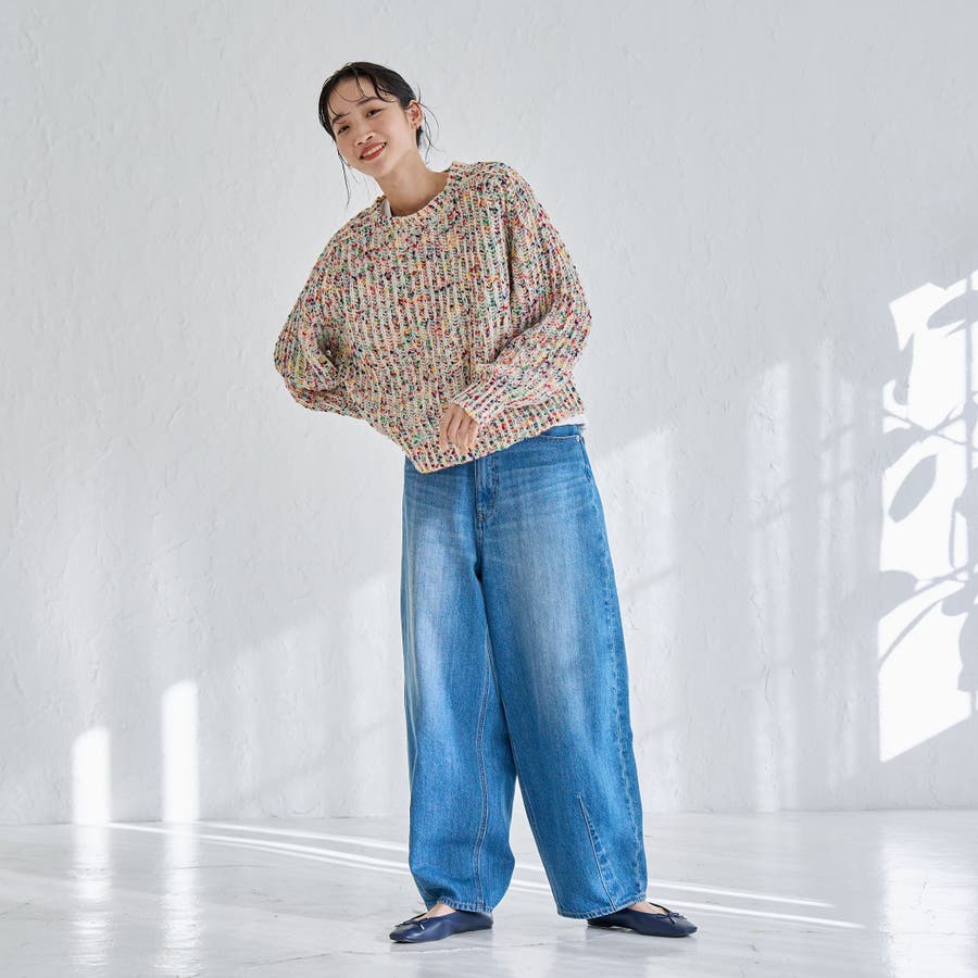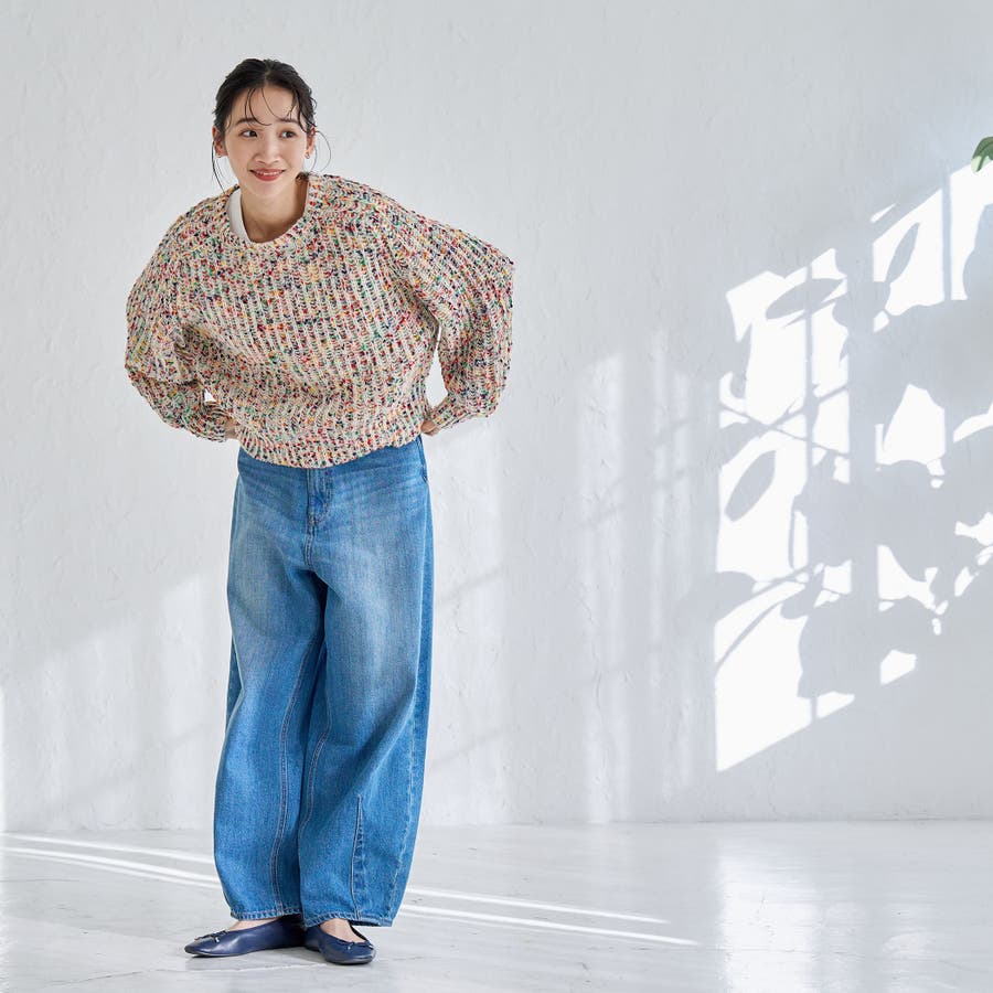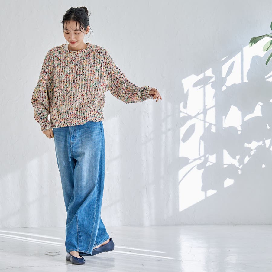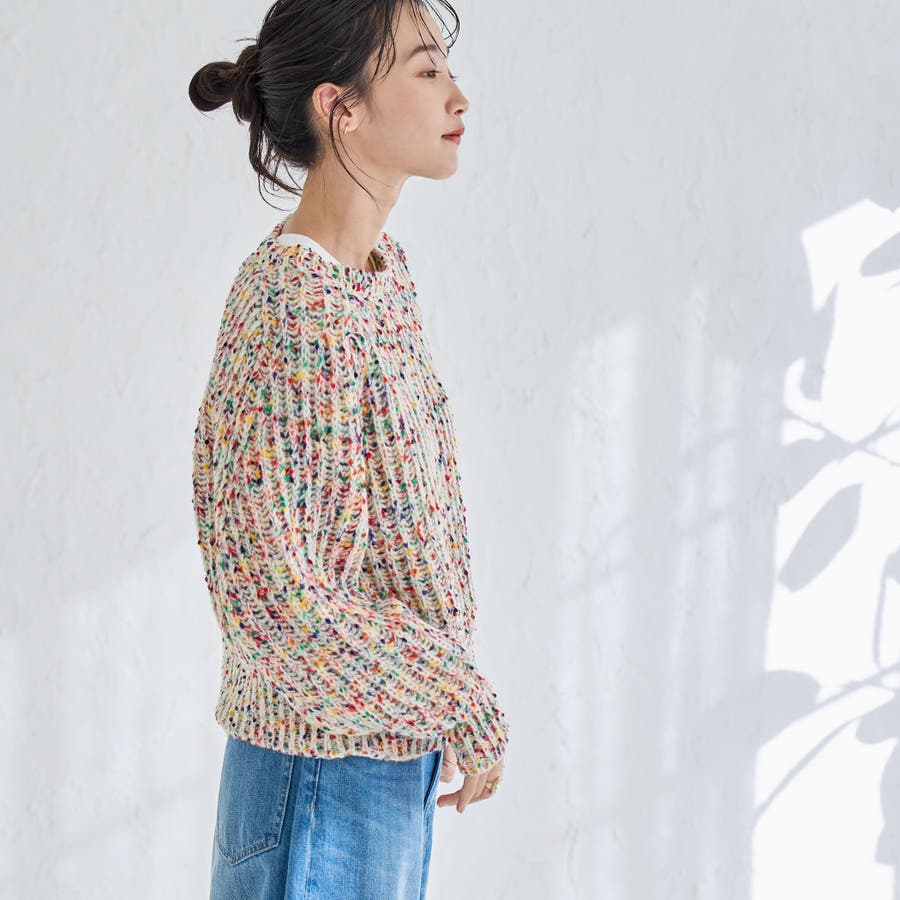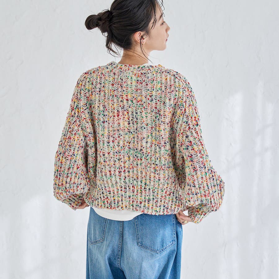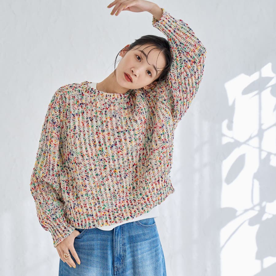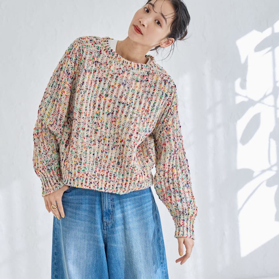 ざっくり編みの多色使いミックスニットは、ボリューム袖のふっくらとしたシルエットで女性らしく映してくれる一枚に。