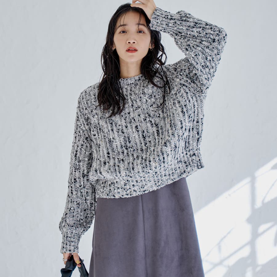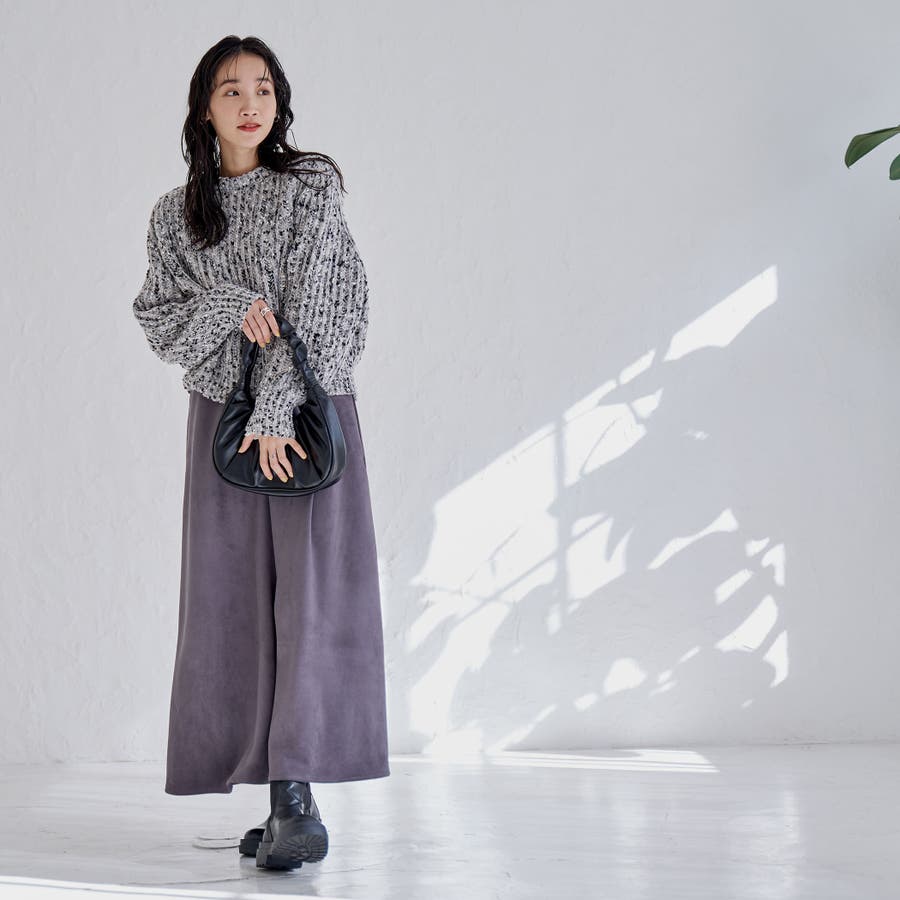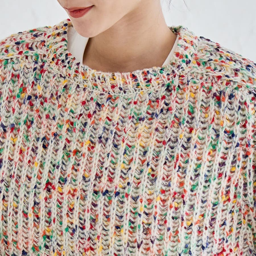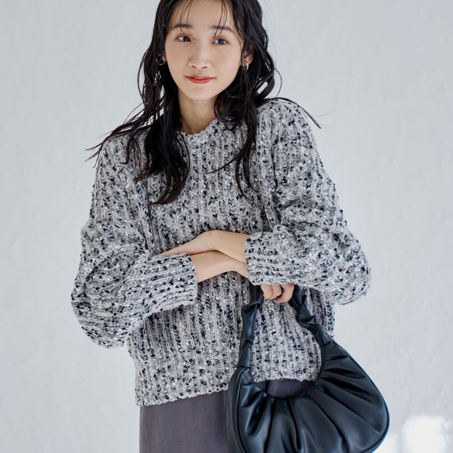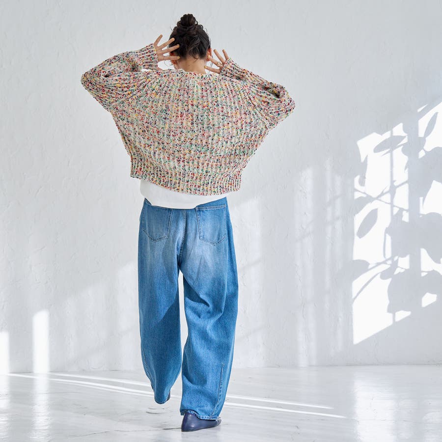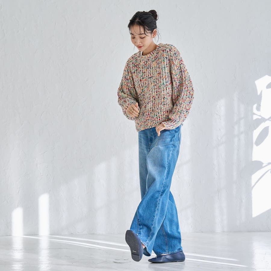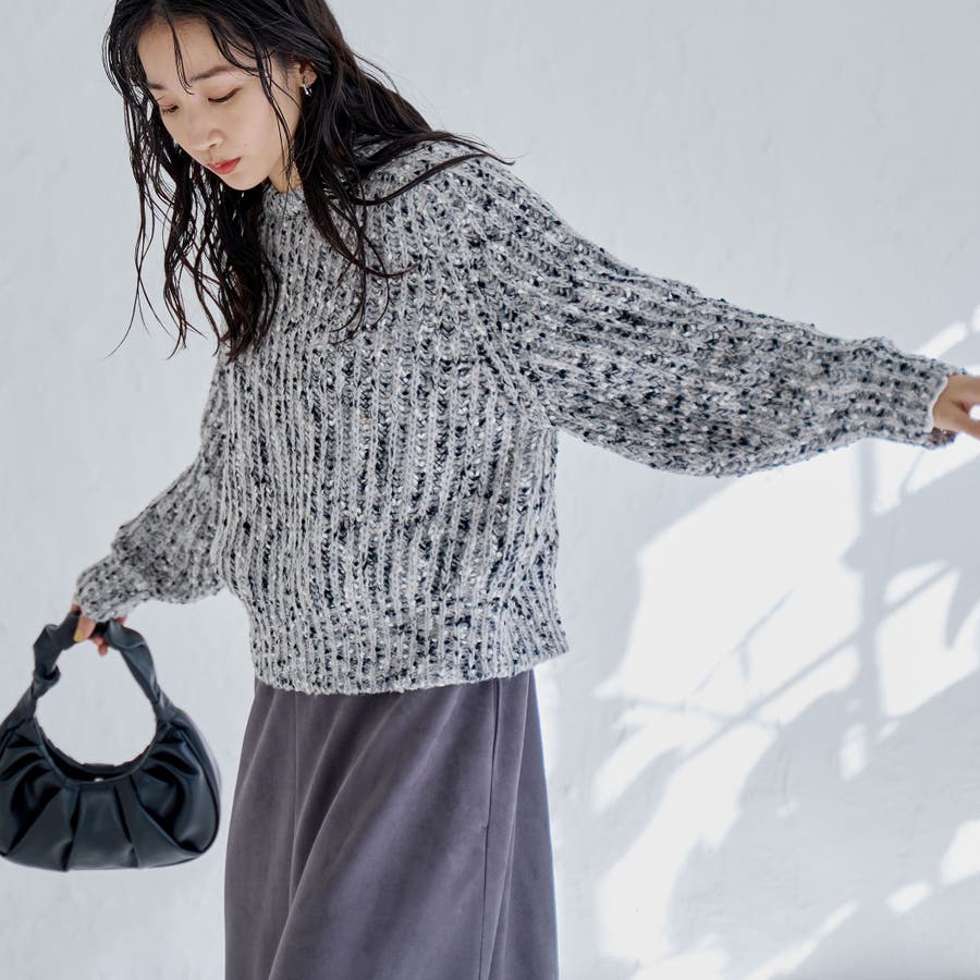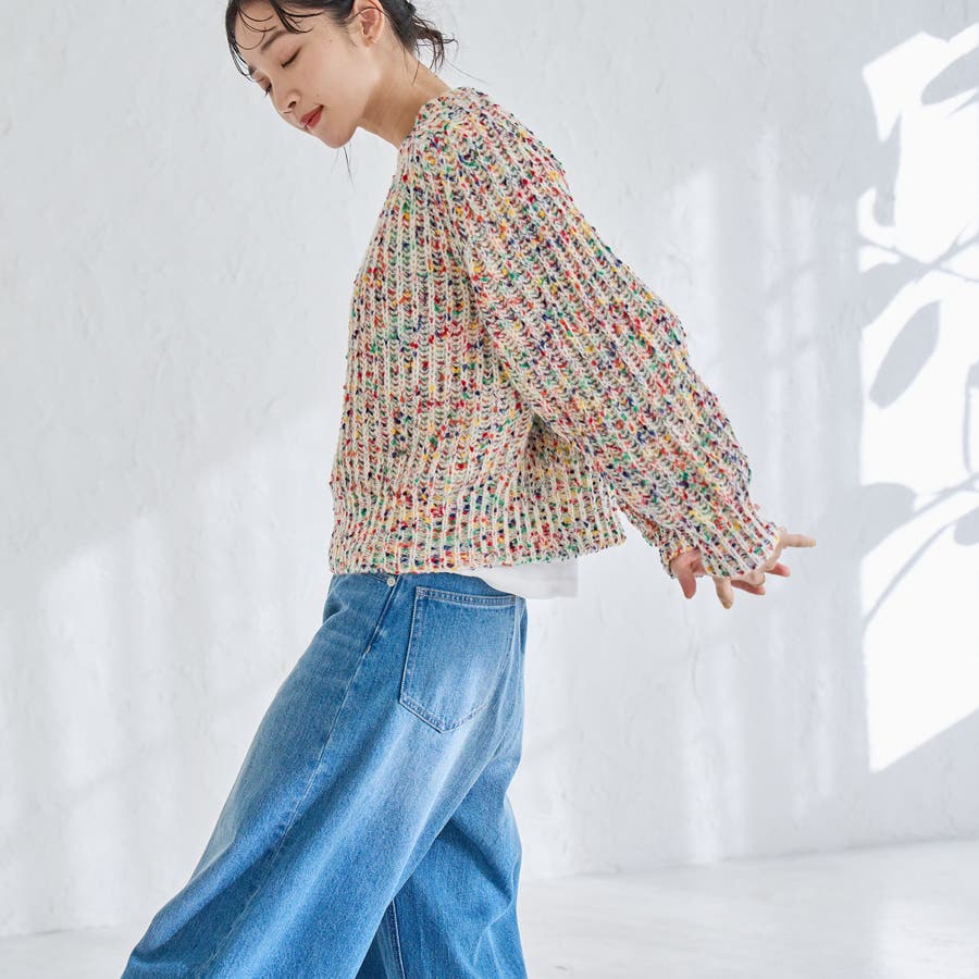 ざっくり編みの多色使いミックスニットは、ボリューム袖のふっくらとしたシルエットで女性らしく映してくれる一枚に。