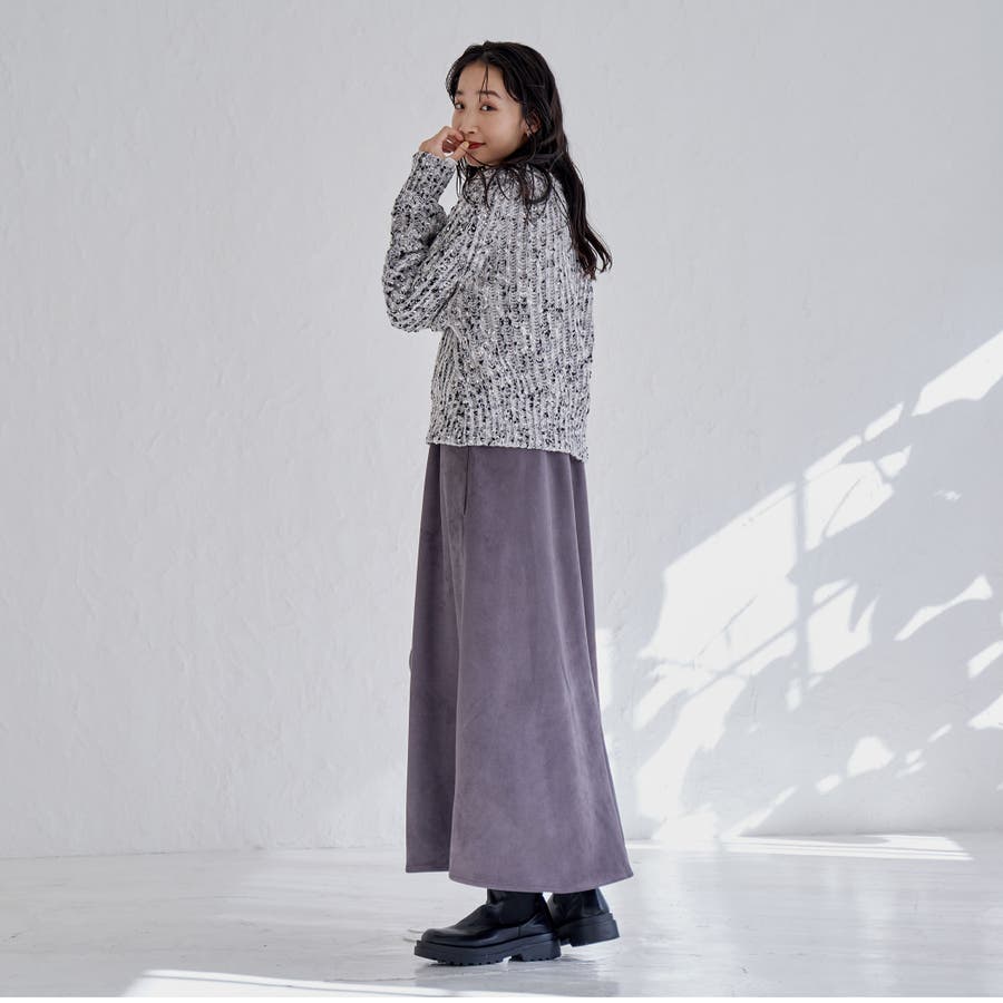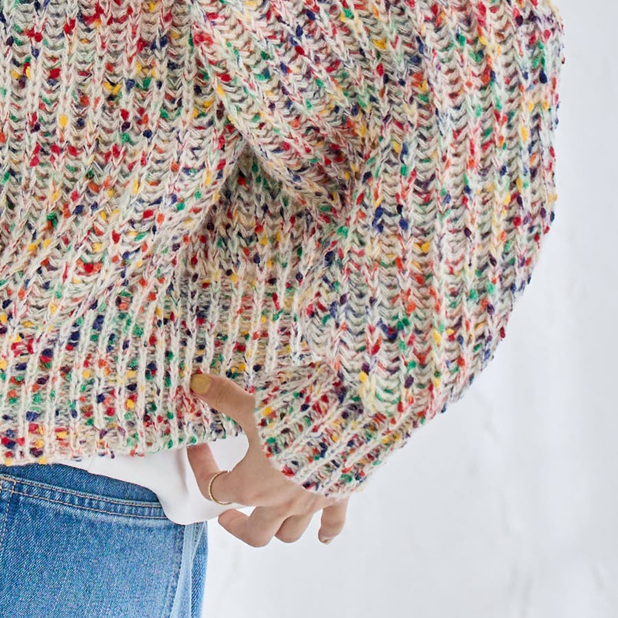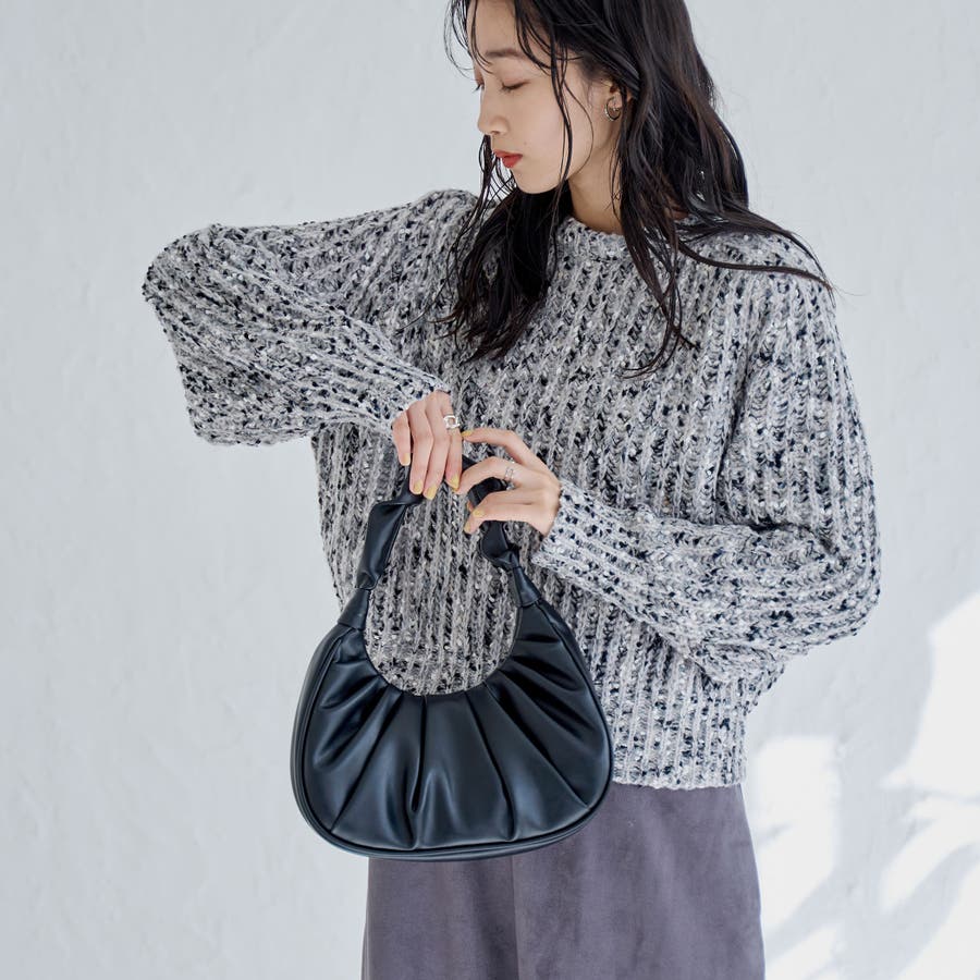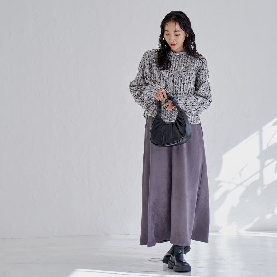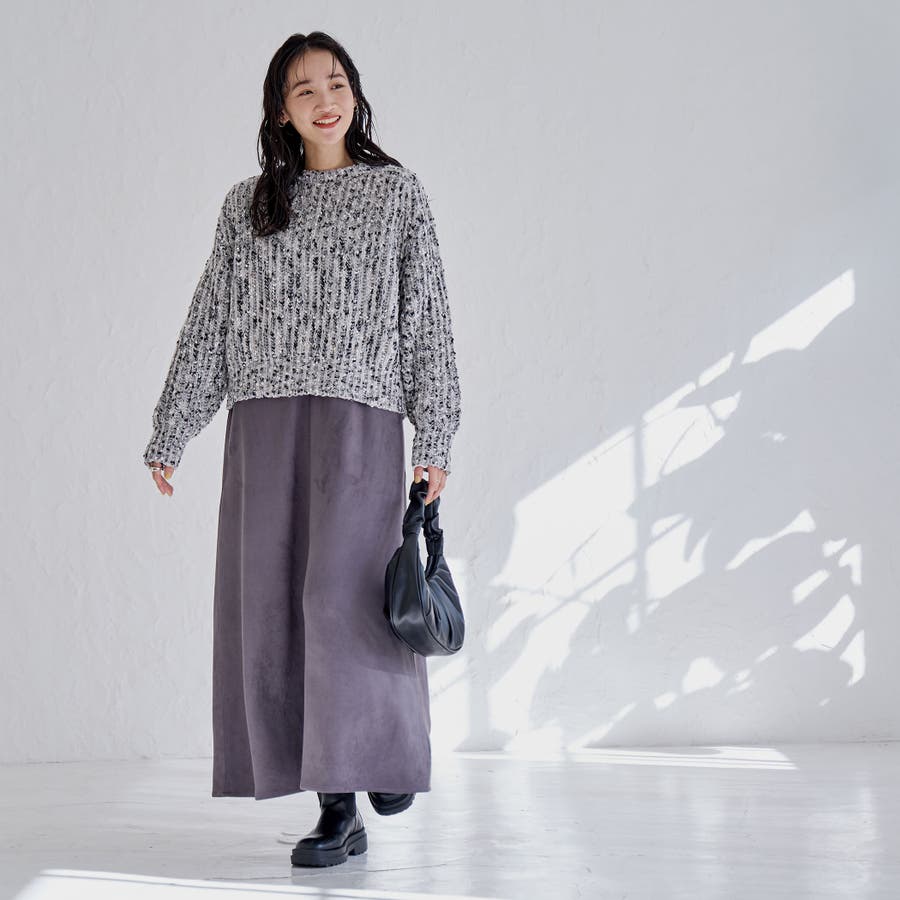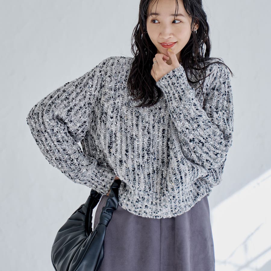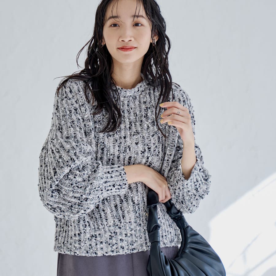ざっくり編みの多色使いミックスニットは、ボリューム袖のふっくらとしたシルエットで女性らしく映してくれる一枚に。