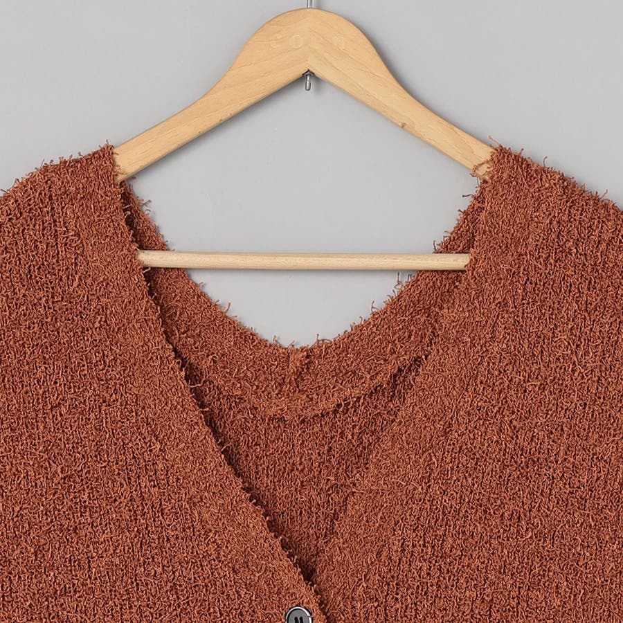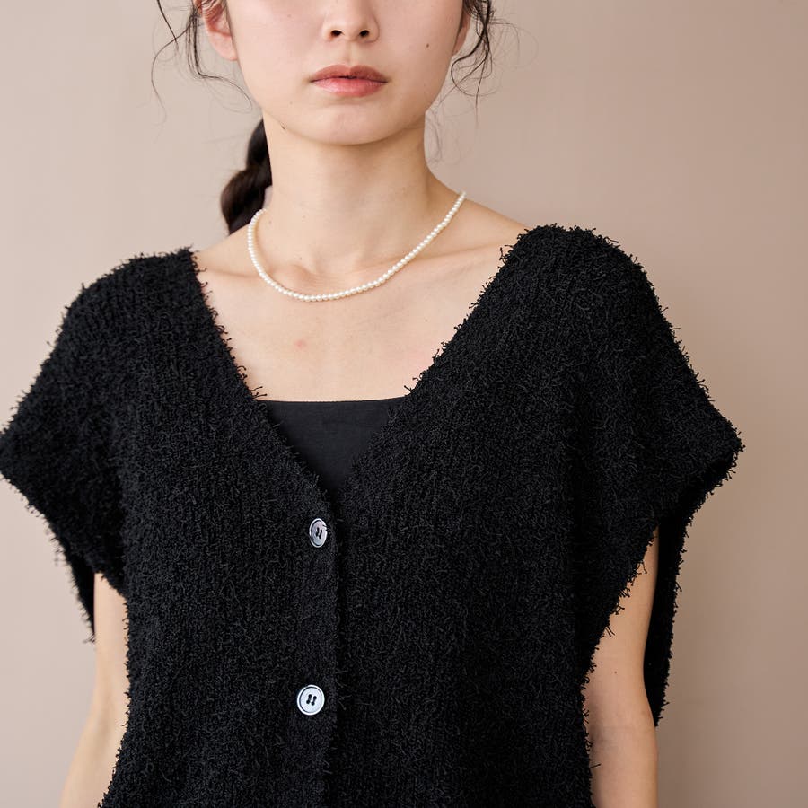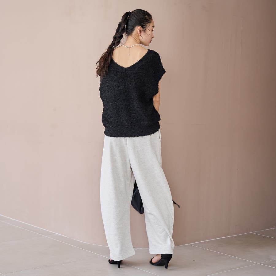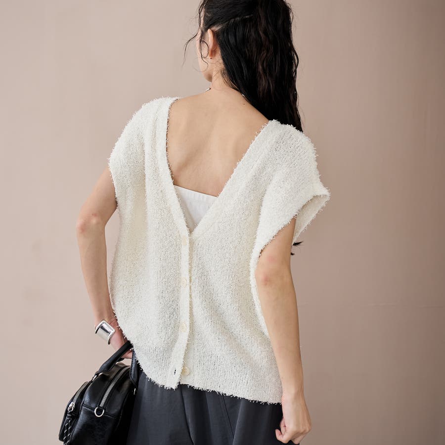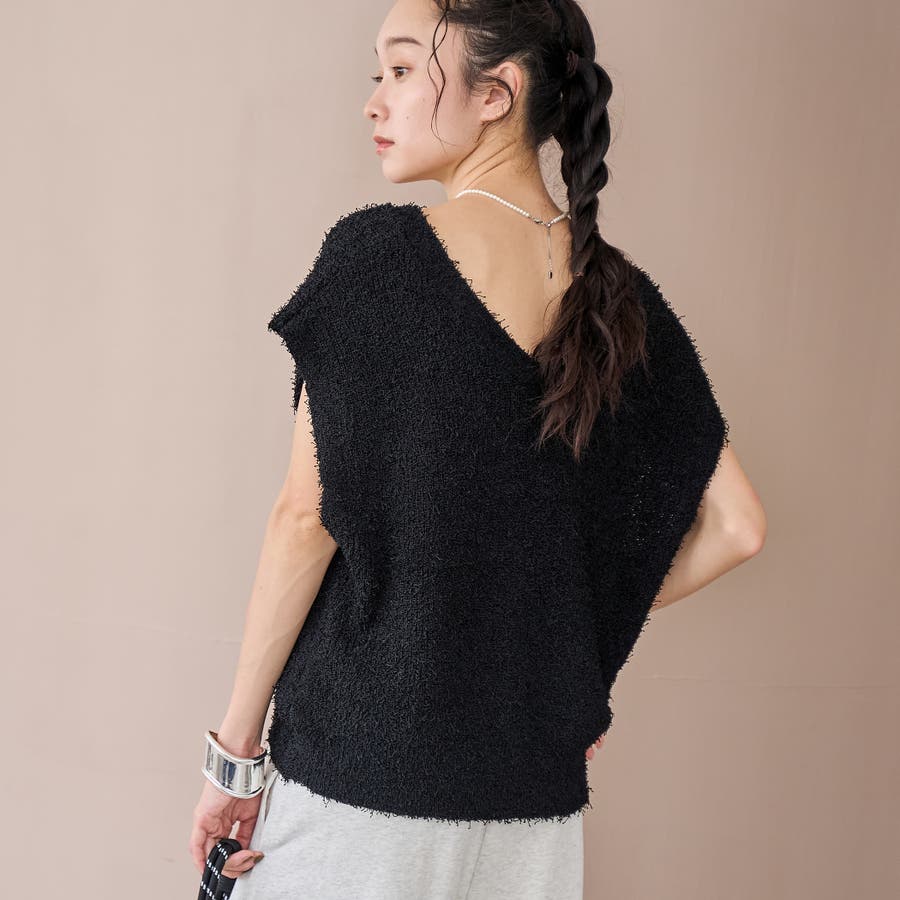 フロントの深めVネックが顔まわりをすっきり見せてくれる大人の抜け感デザインです。
