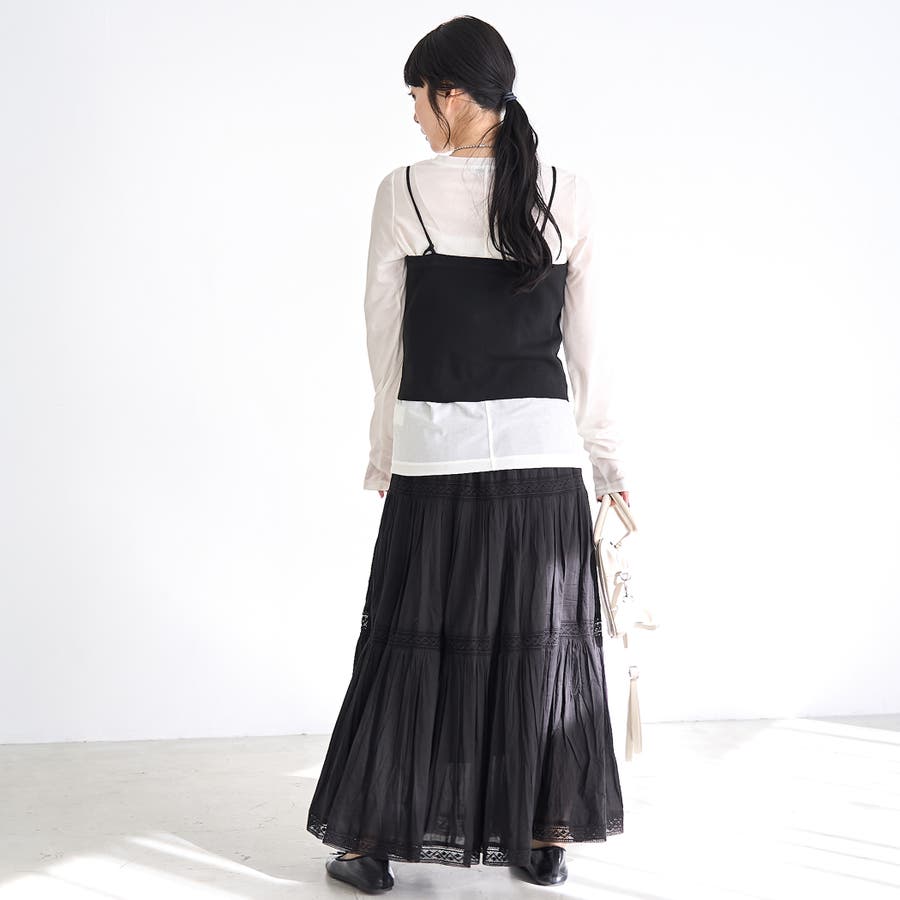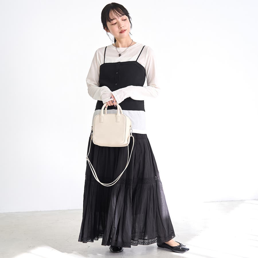 細めの肩紐がデコルテ周りをすっきり見せ、シンプルなコーデにもさりげない華やかさをプラスします。