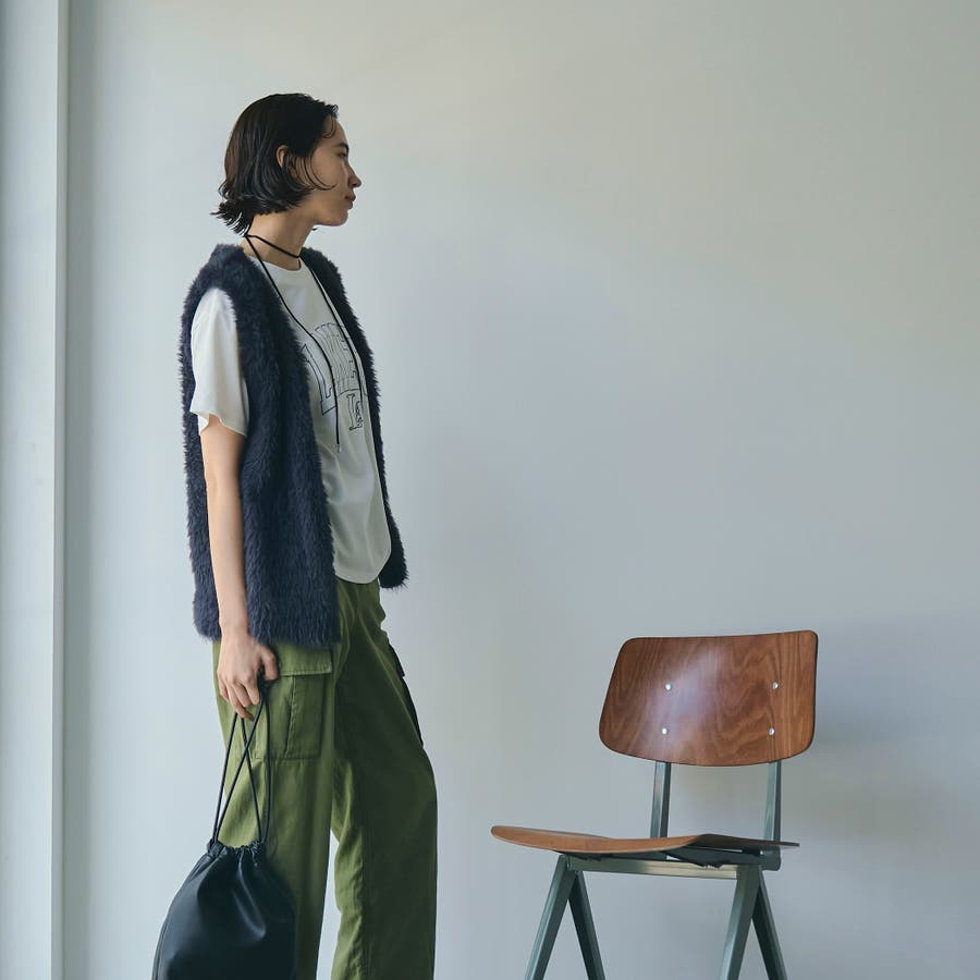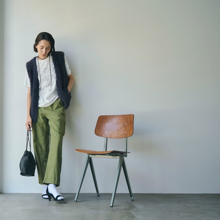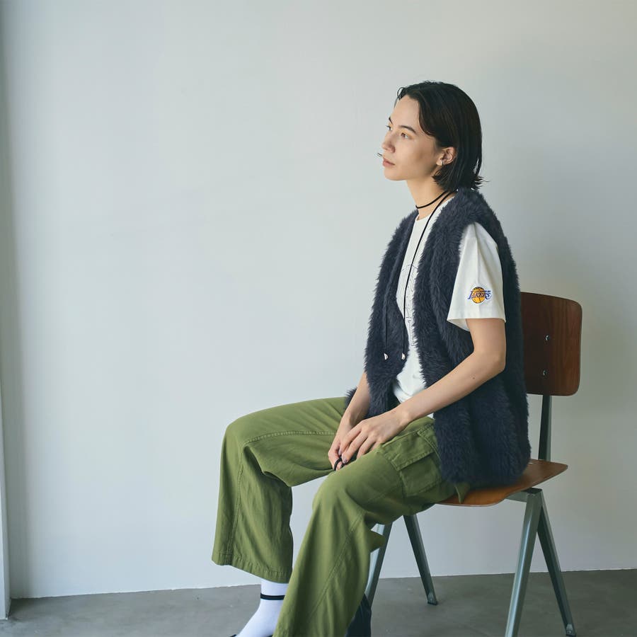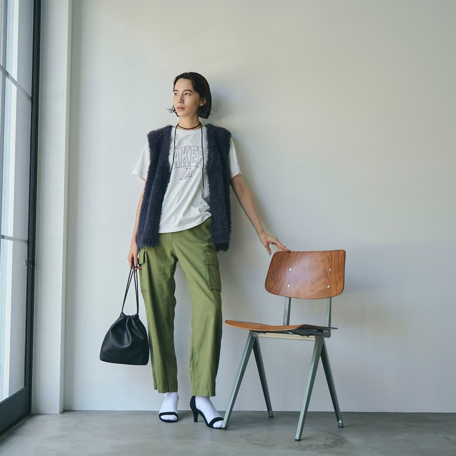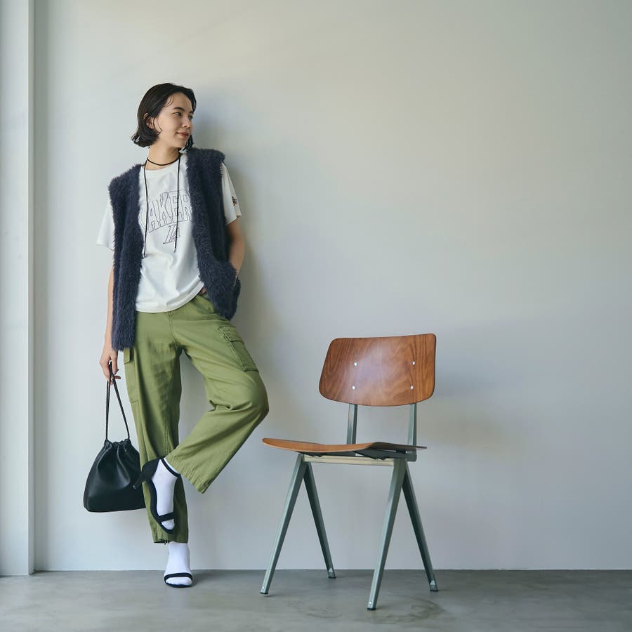カーブデニムやカーゴパンツなどメンズライクなボトムスとのコーディネートもおすすめ。