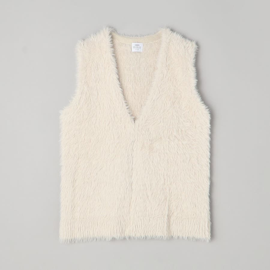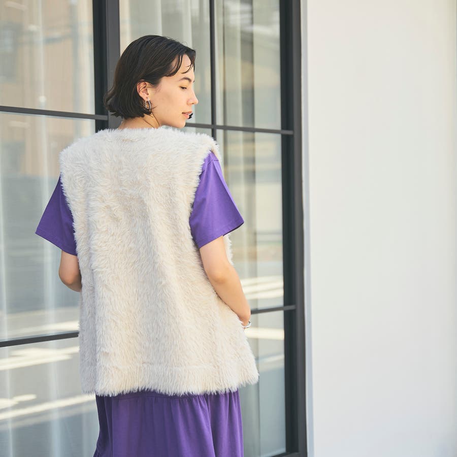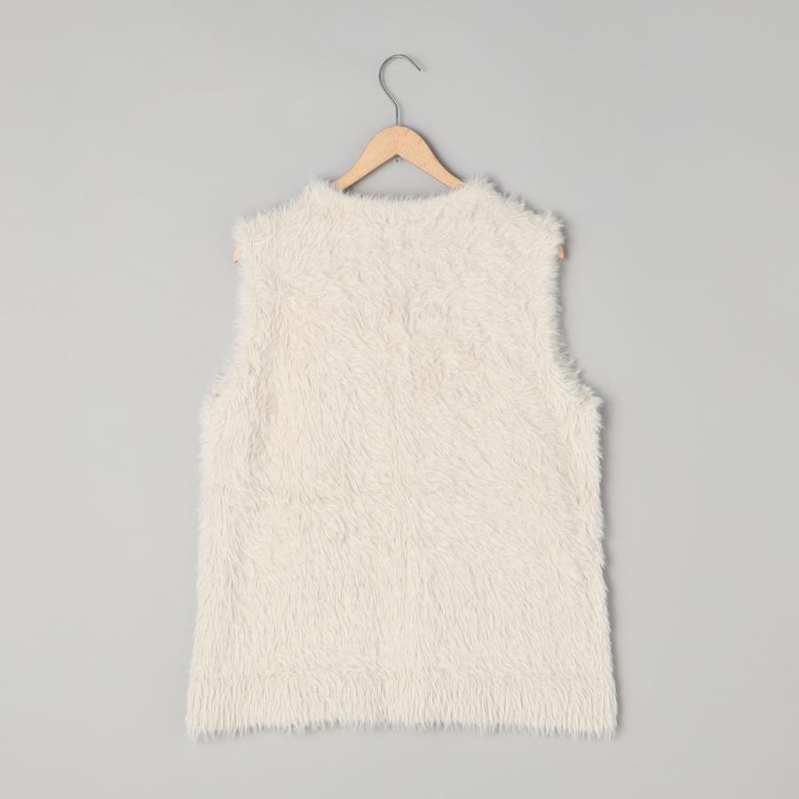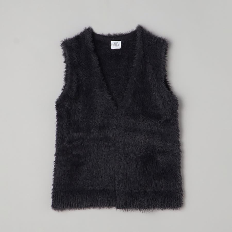 秋冬のスタイリングに華やかさと季節感をプラスするフェザーヤーンのニットベストです。