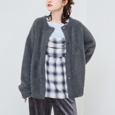 羽のように毛足が長く、ふわふわとした柔らかな見た目が特徴のフェザーヤーンニットカーディガン。