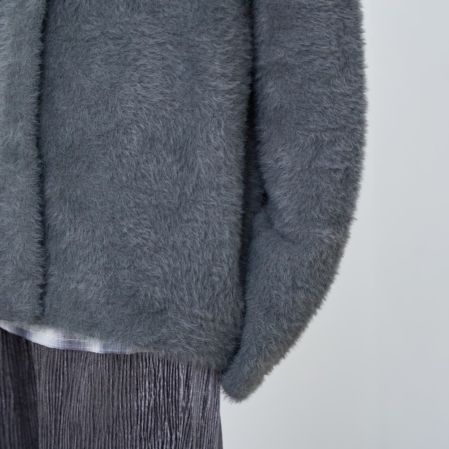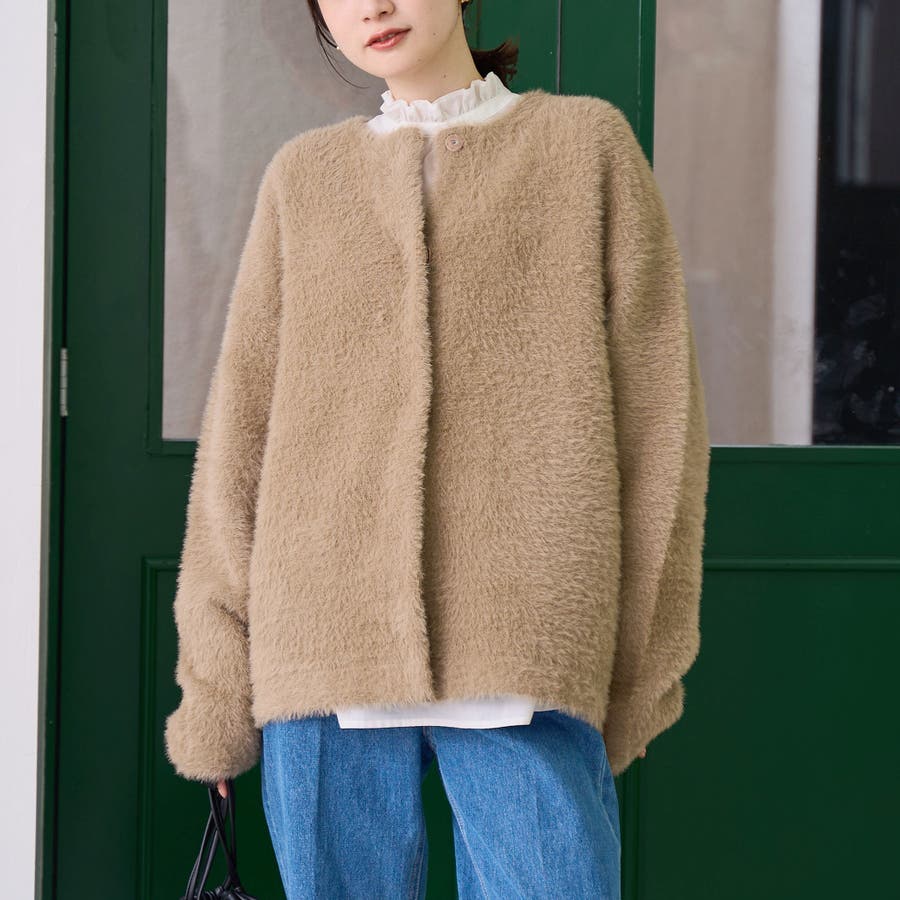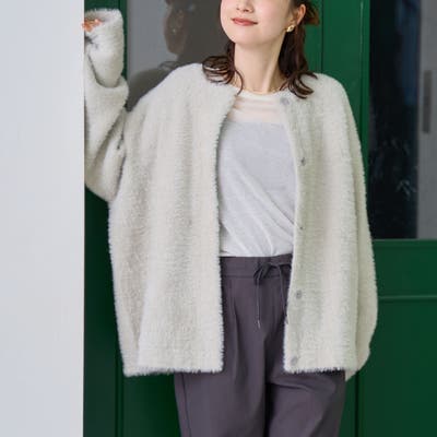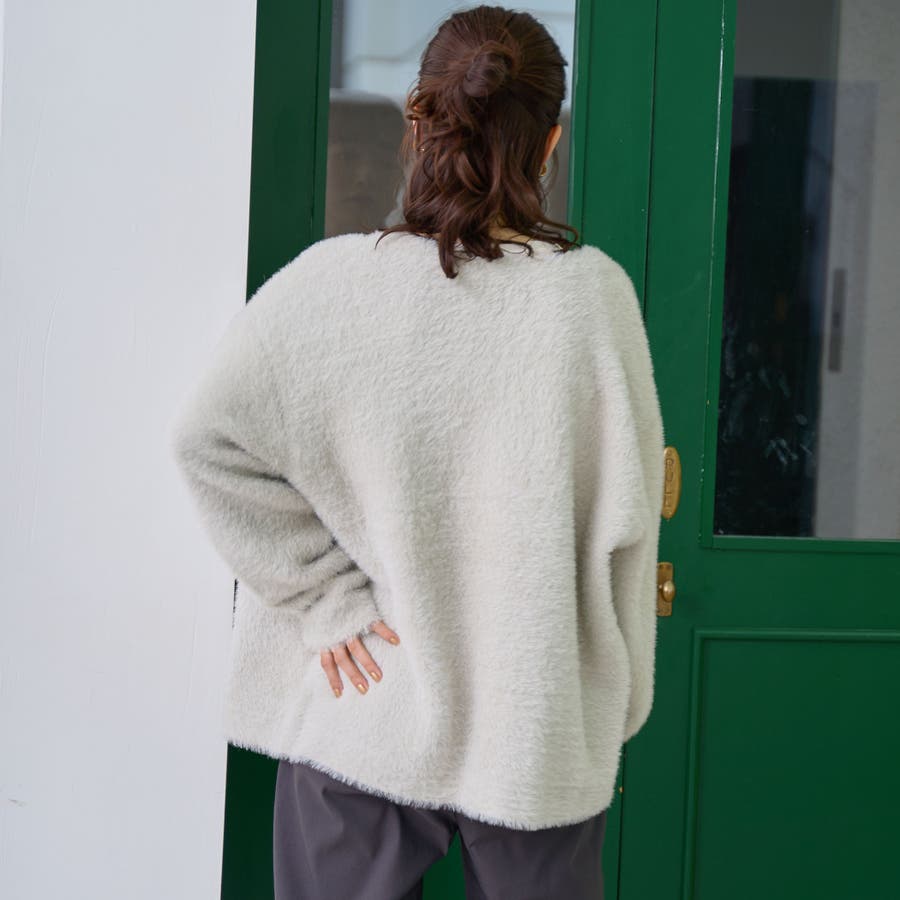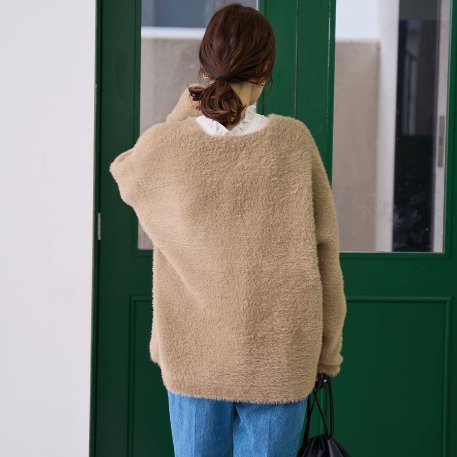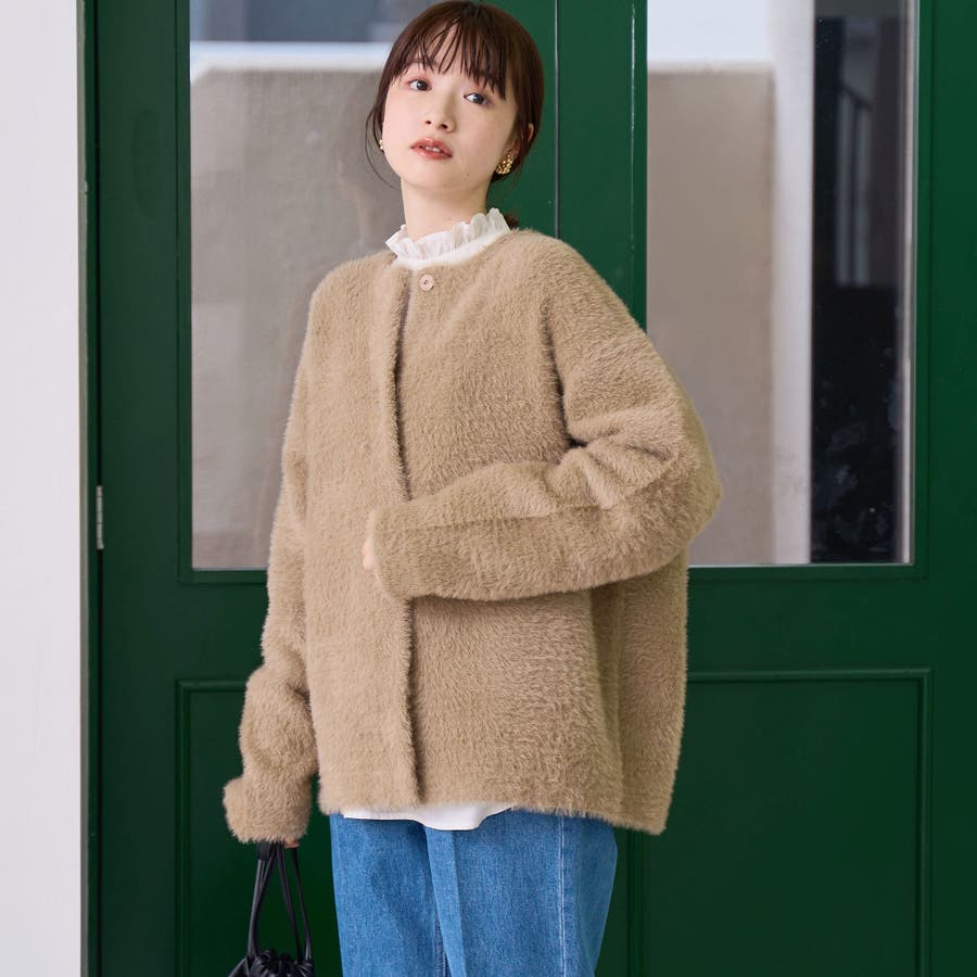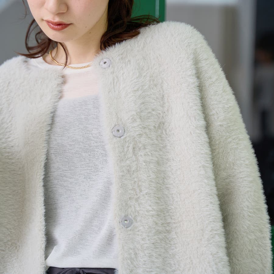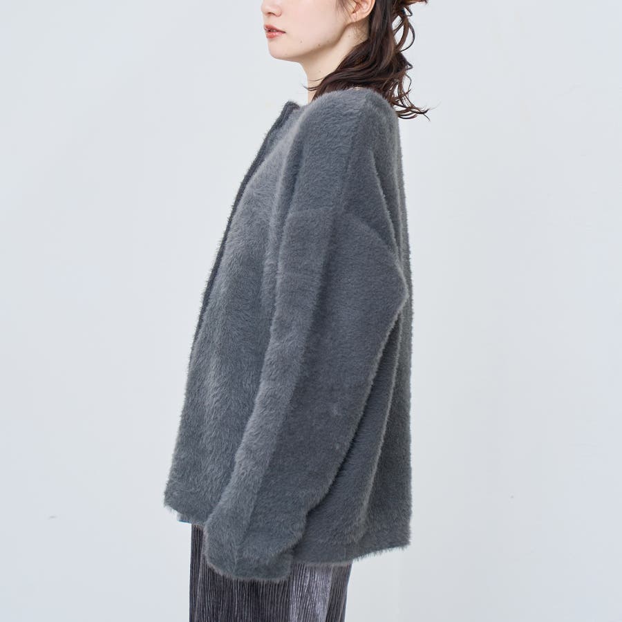 羽のように毛足が長く、ふわふわとした柔らかな見た目が特徴のフェザーヤーンニットカーディガン。