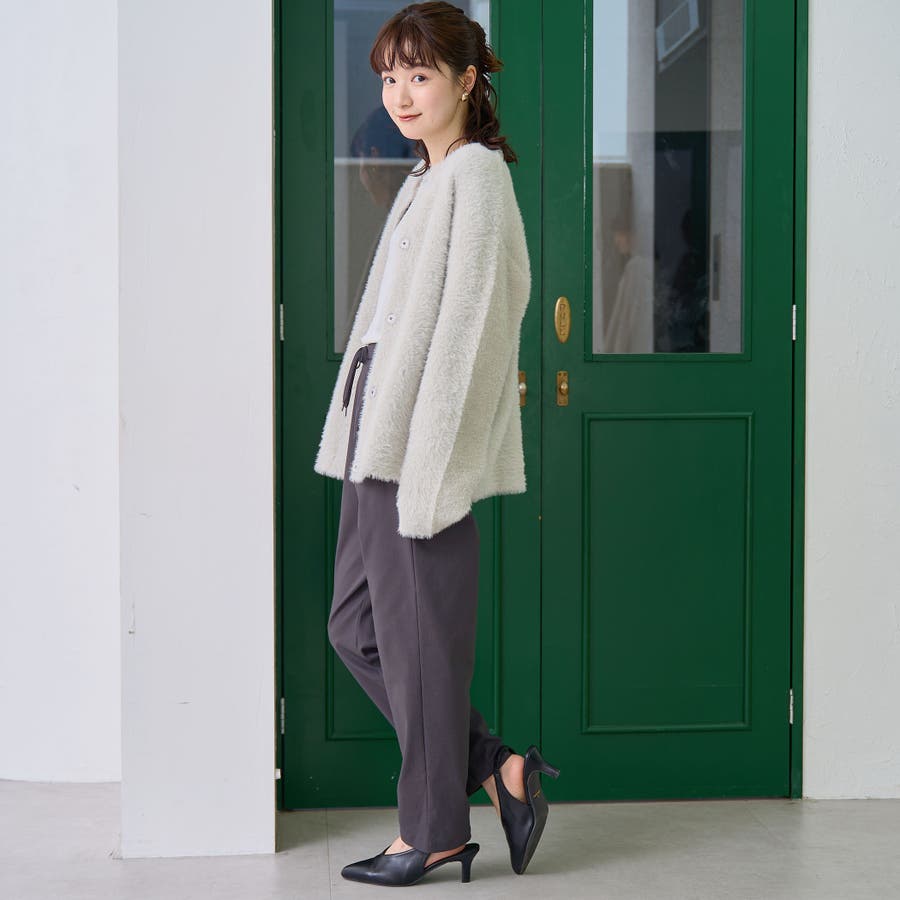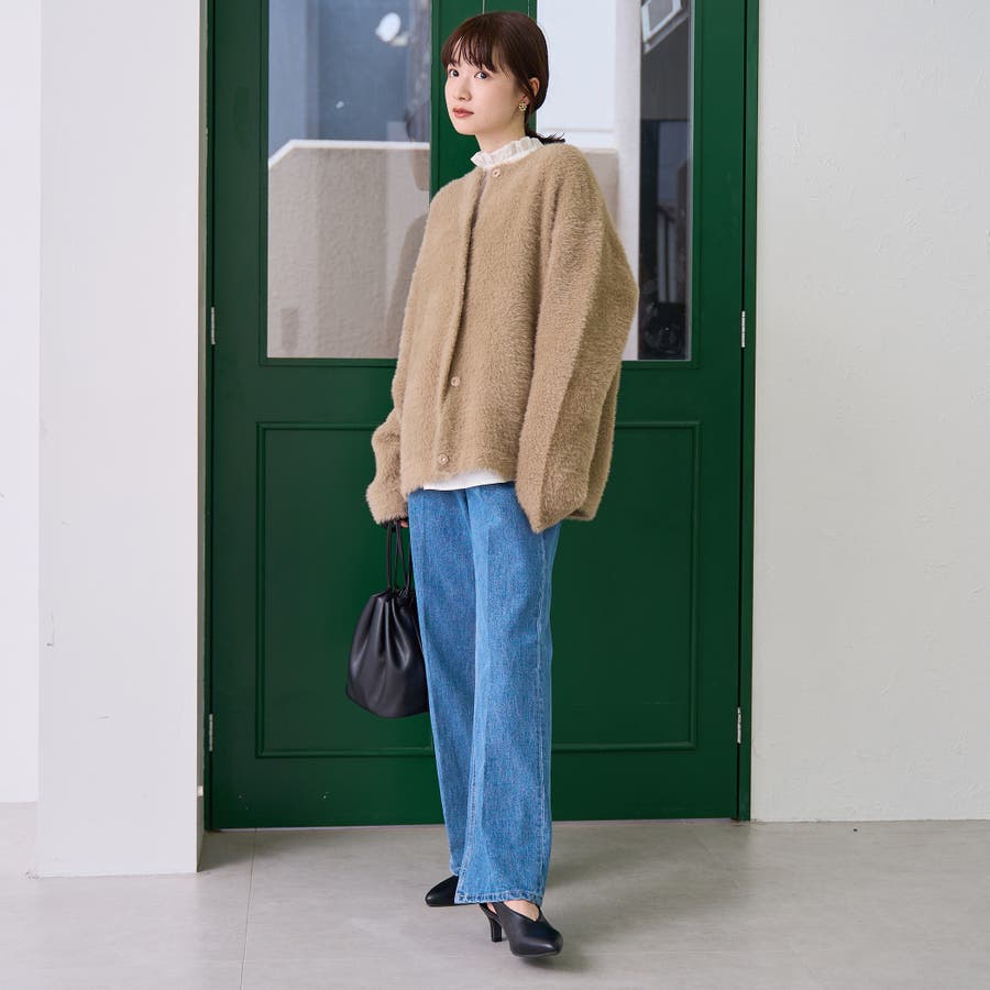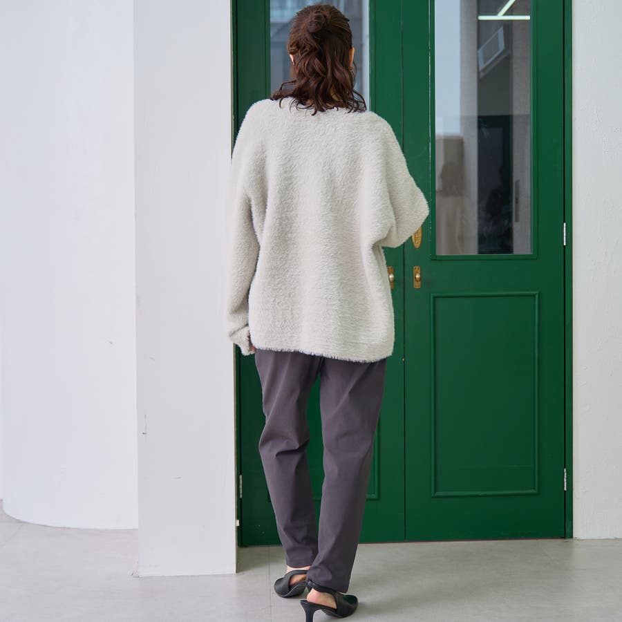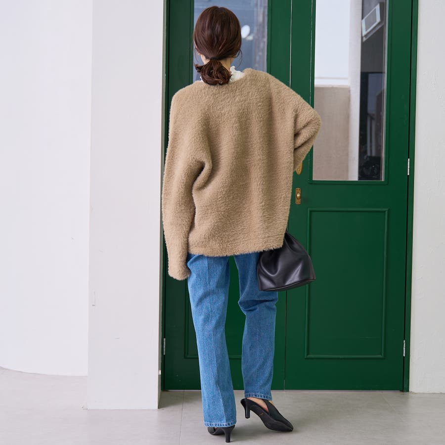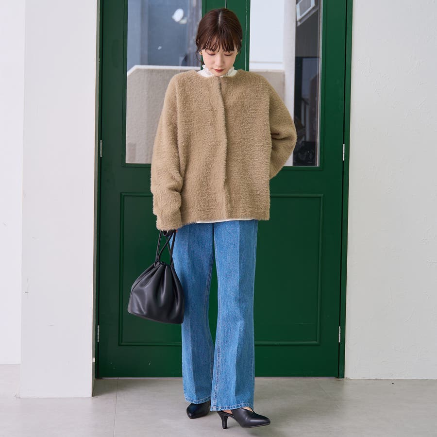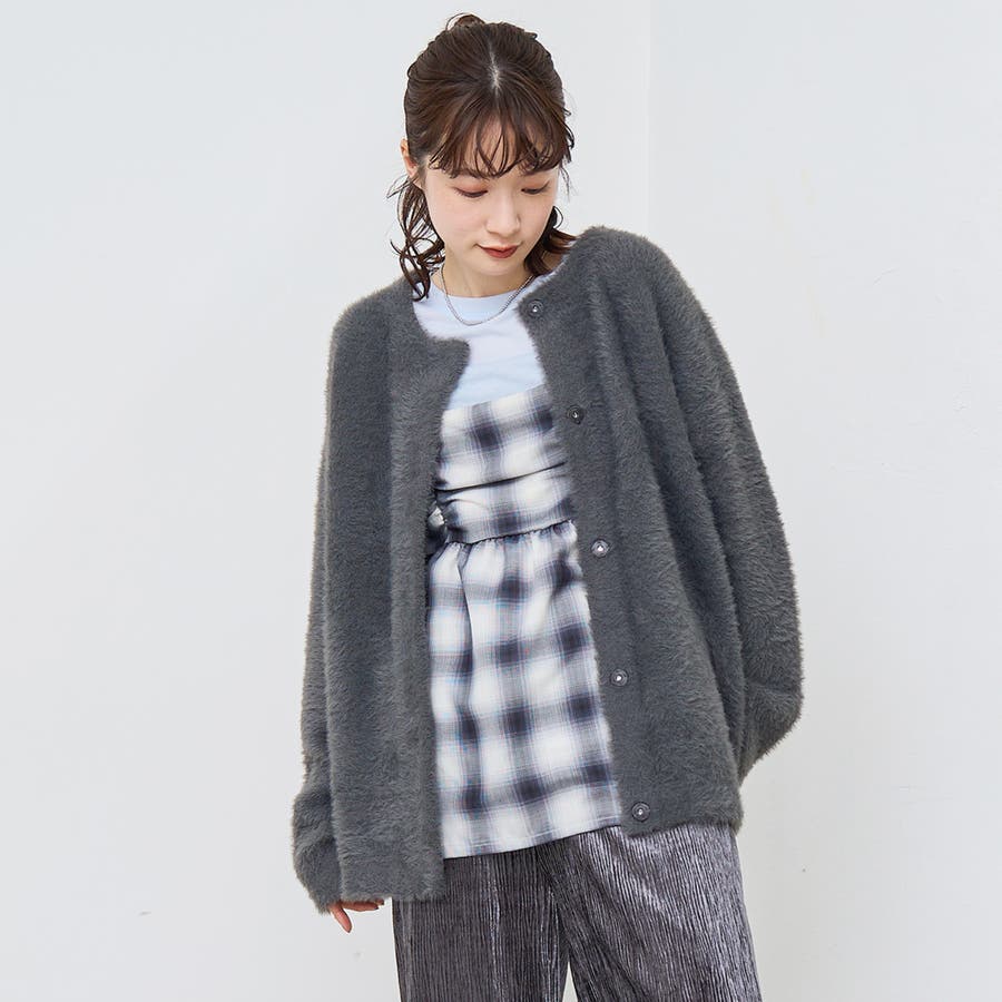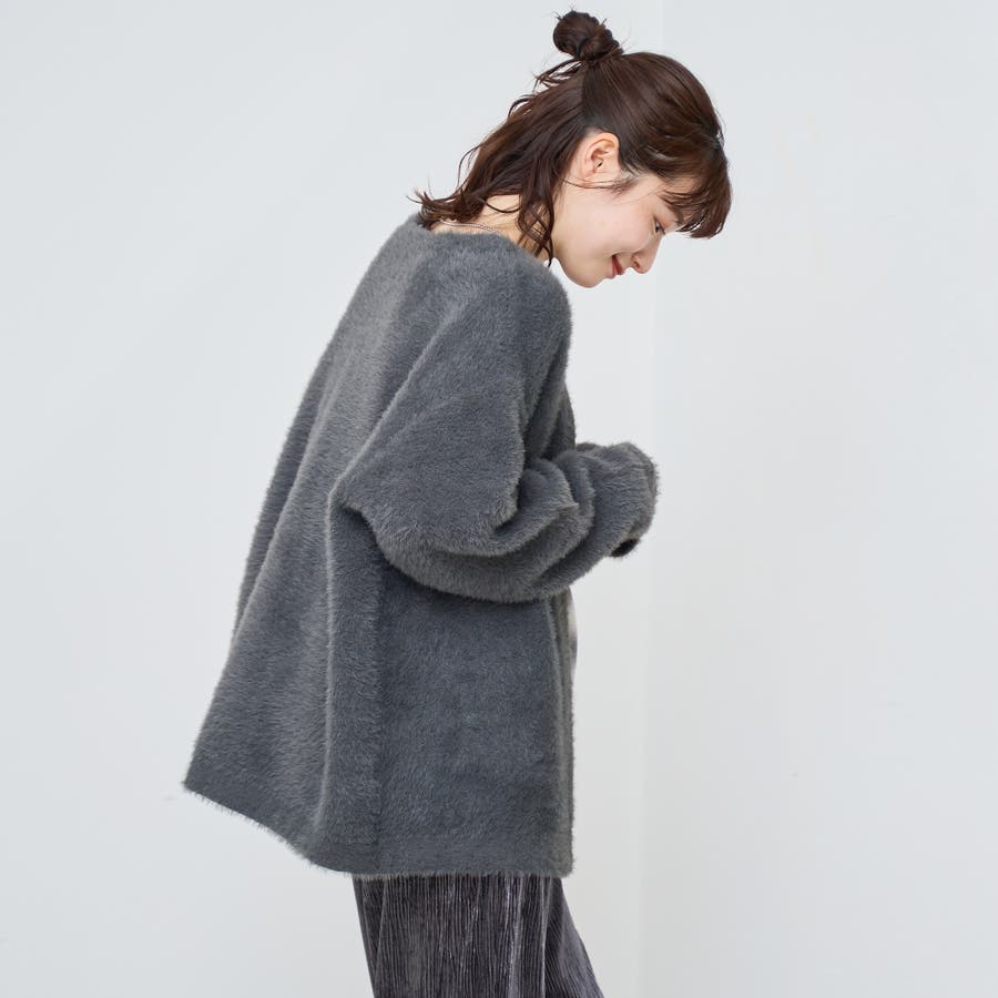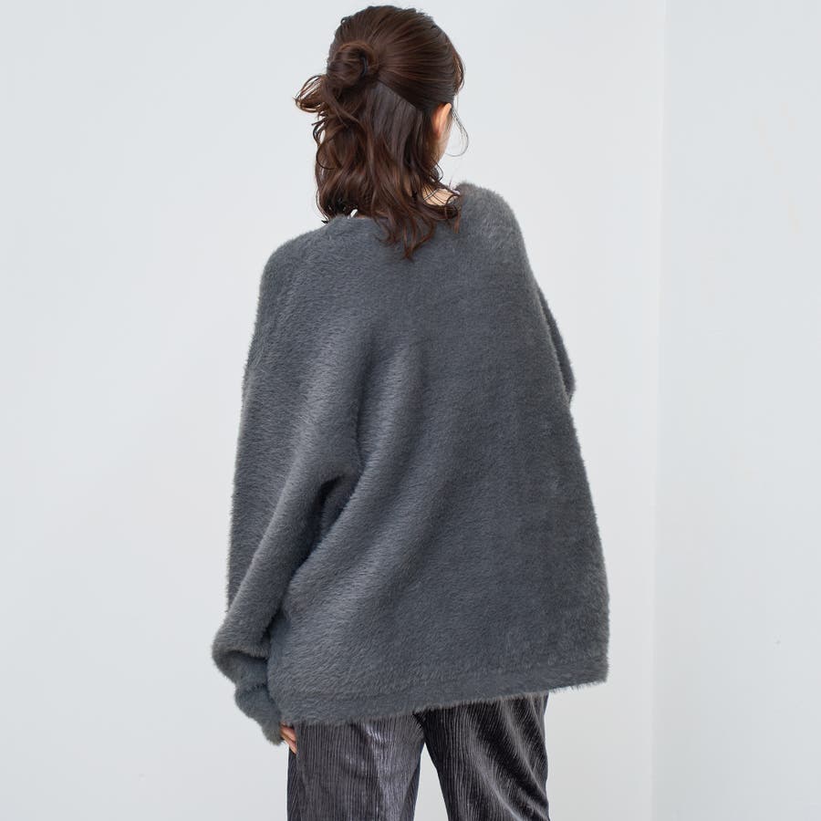 羽のように毛足が長く、ふわふわとした柔らかな見た目が特徴のフェザーヤーンニットカーディガン。
