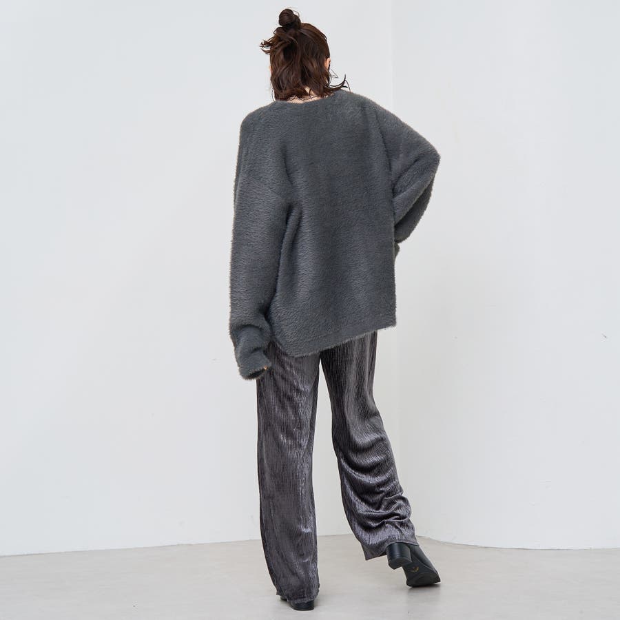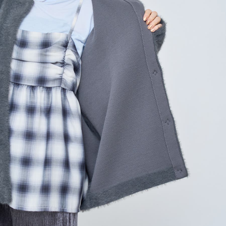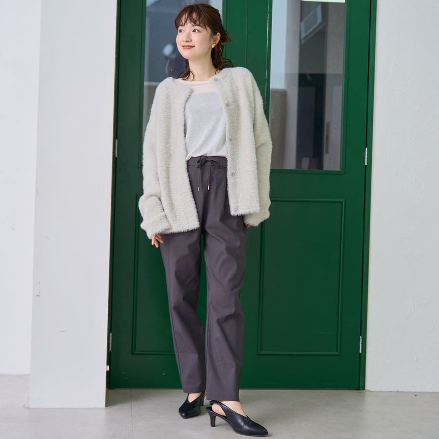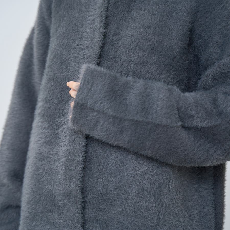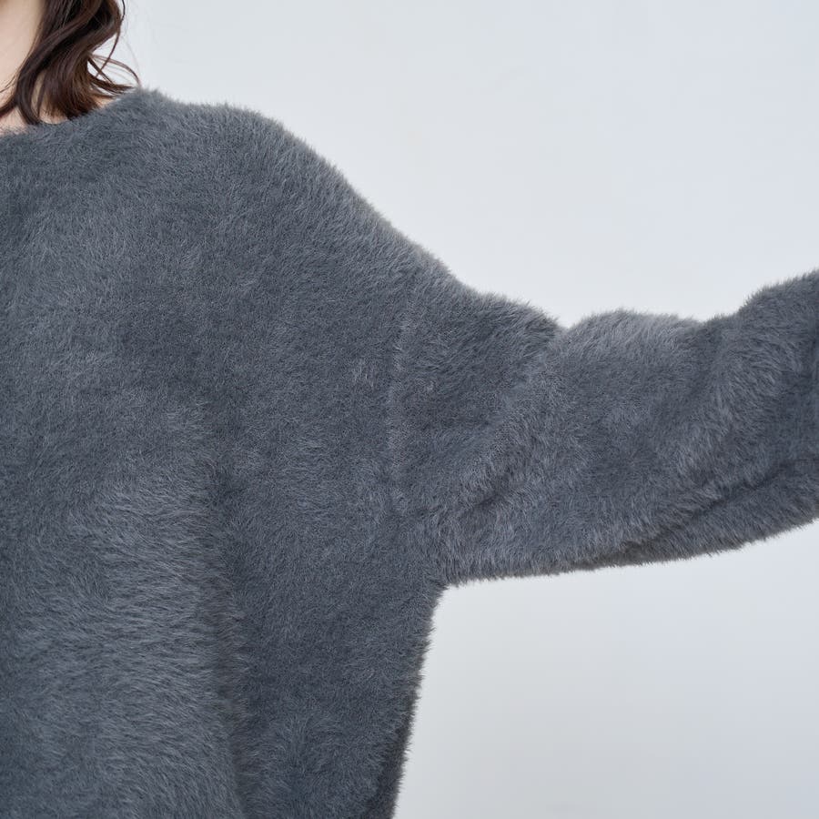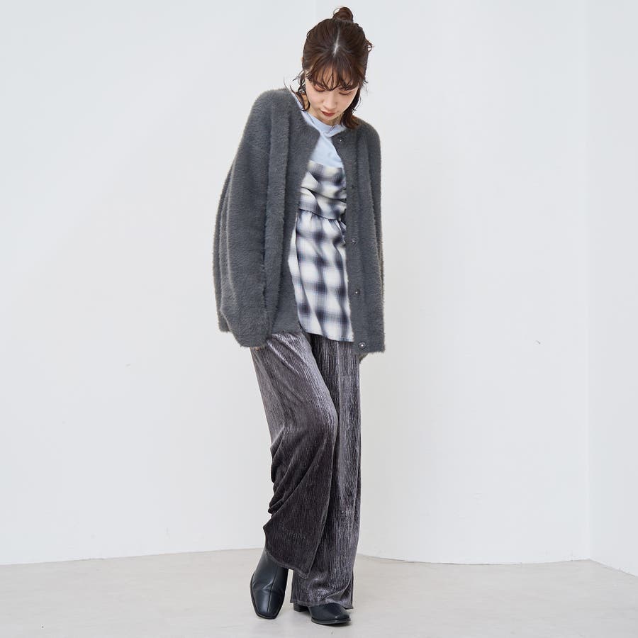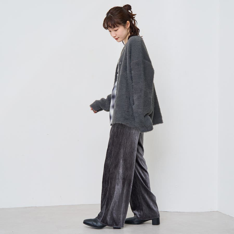 羽のように毛足が長く、ふわふわとした柔らかな見た目が特徴のフェザーヤーンニットカーディガン。