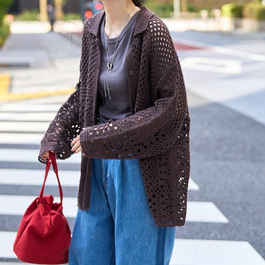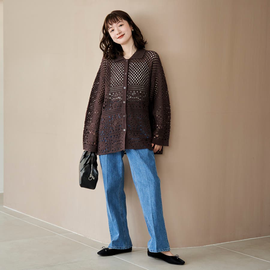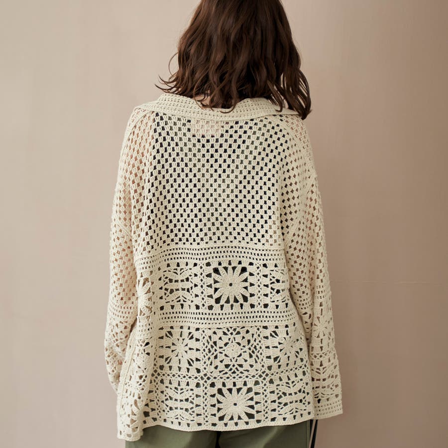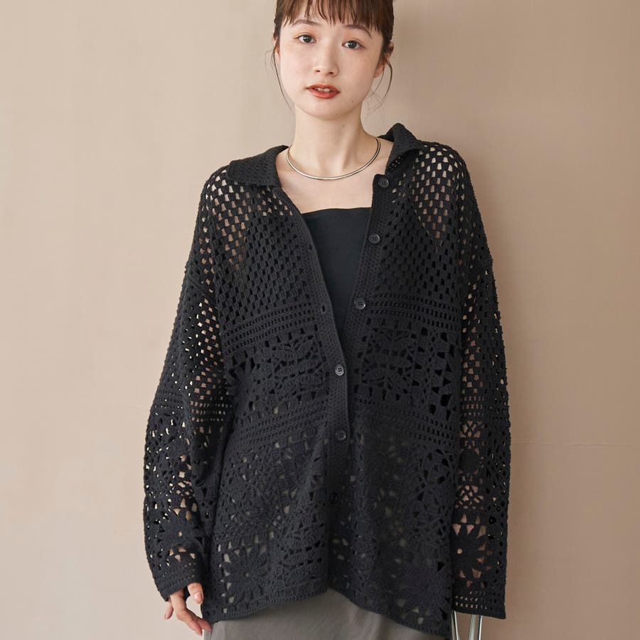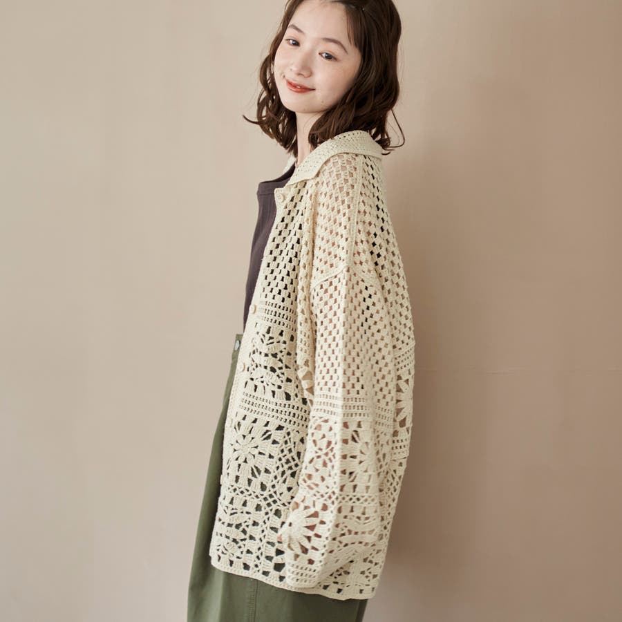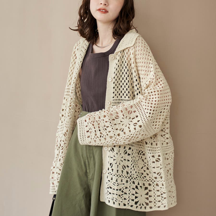 襟付きで今年らしさを感じるクロシェカーディガン。