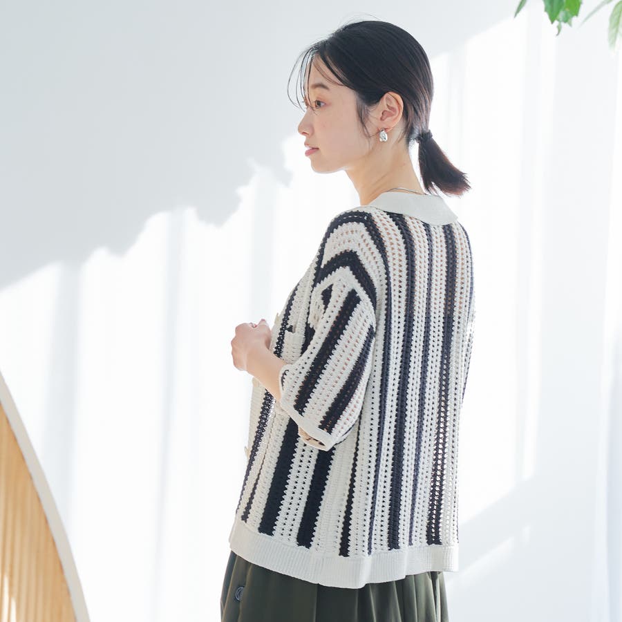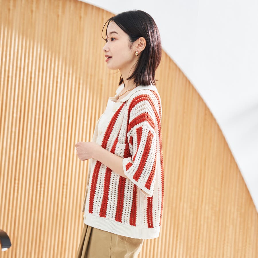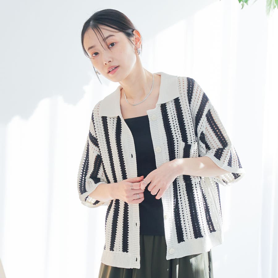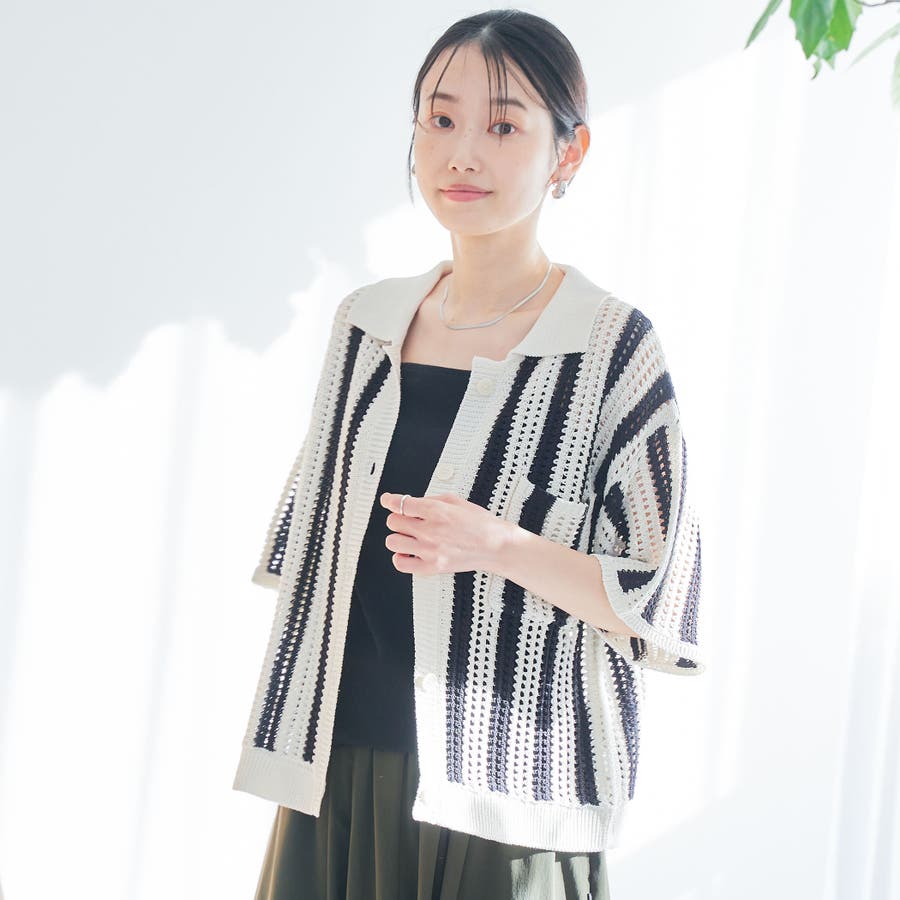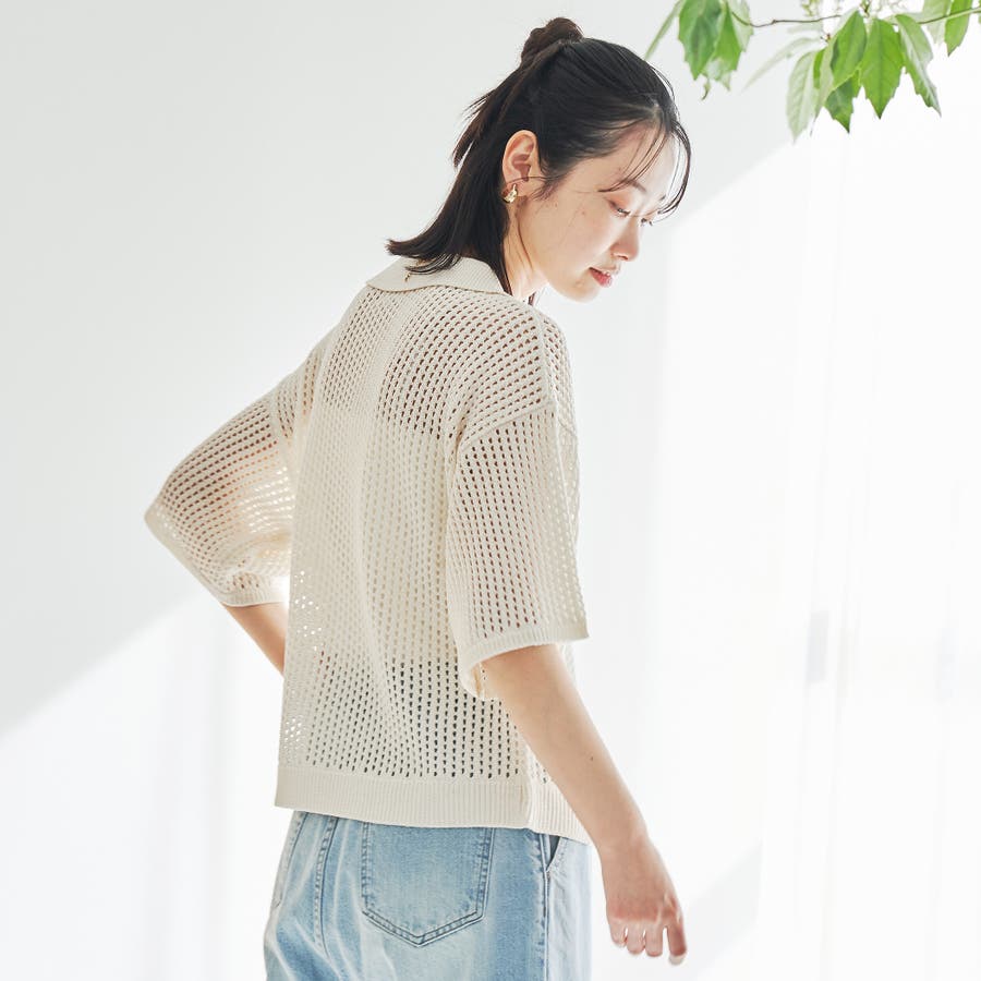 透け感のある軽やかなメッシュ編みが、今季らしい抜け感を演出するカーディガン。