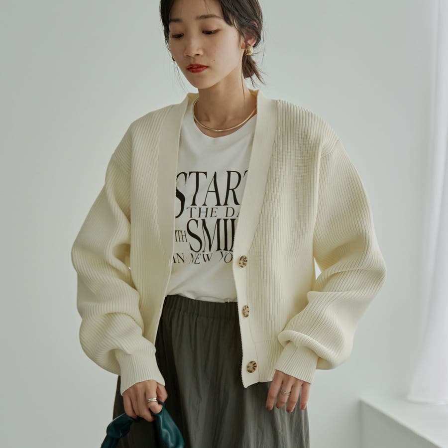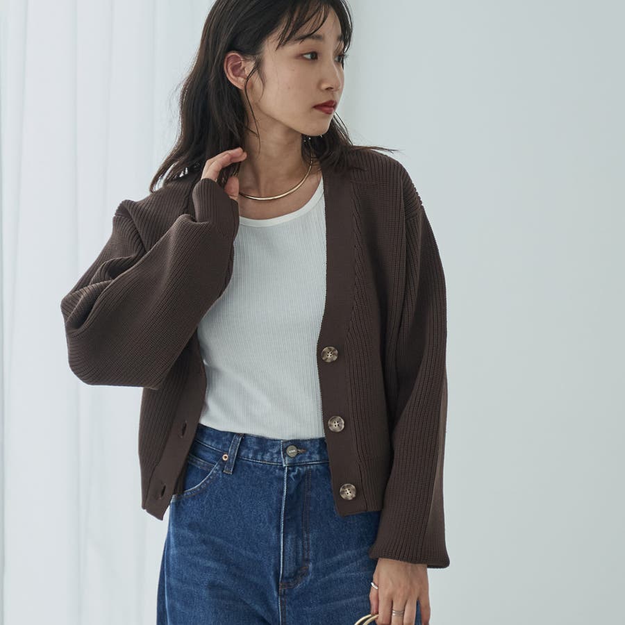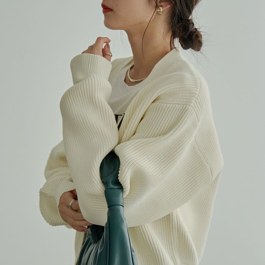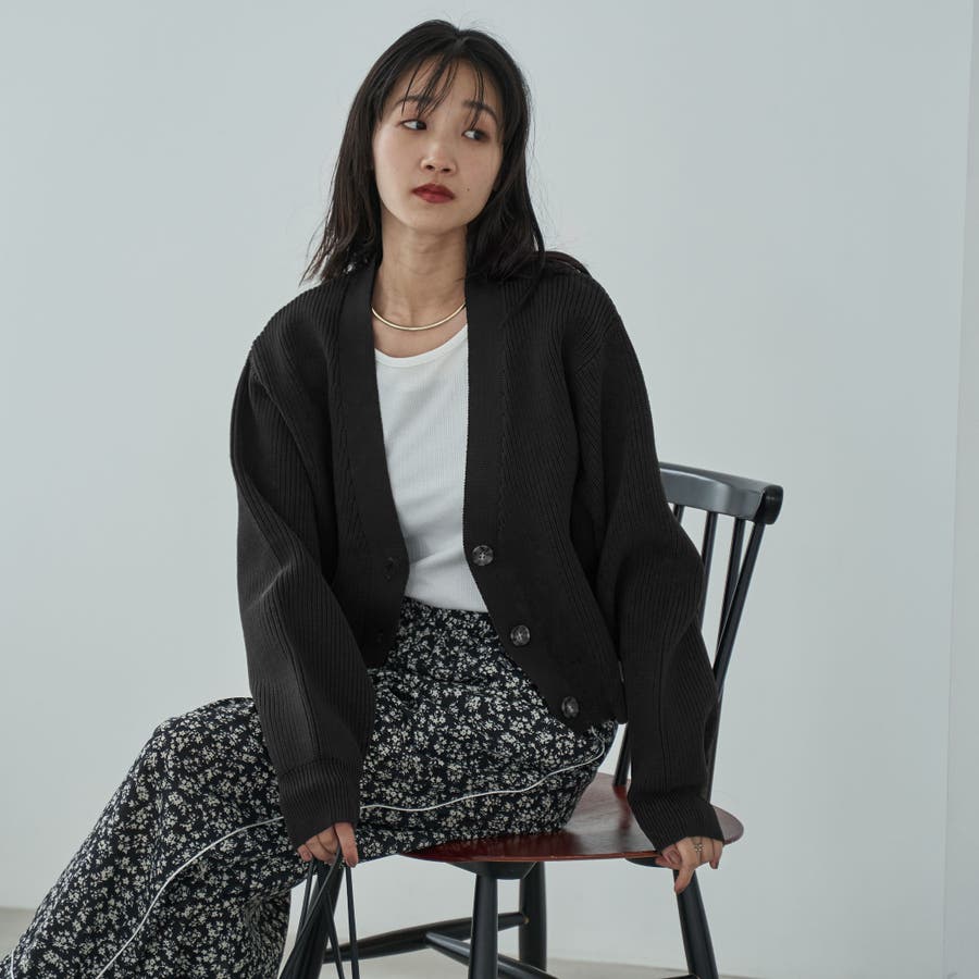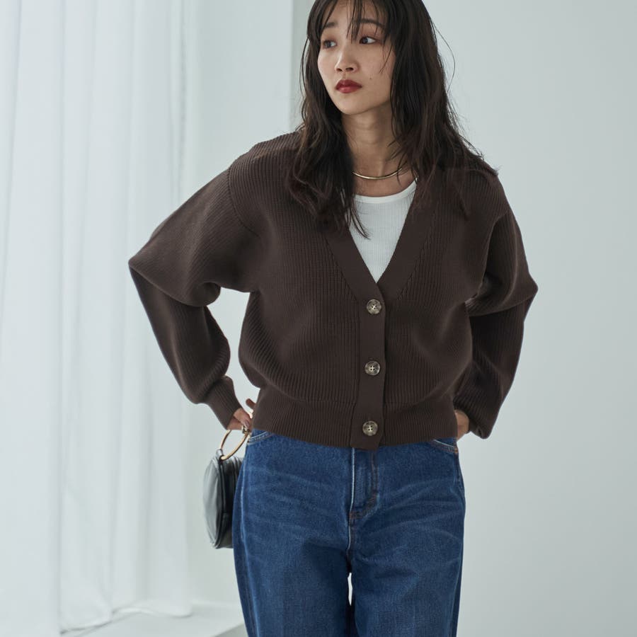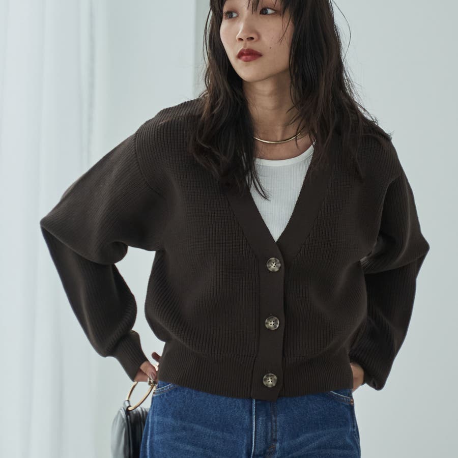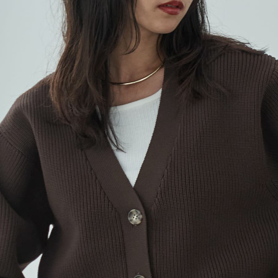 シンプルなVネックのニットカーディガンは、厚みや分量感はあるものの、着心地の軽さが魅力です。