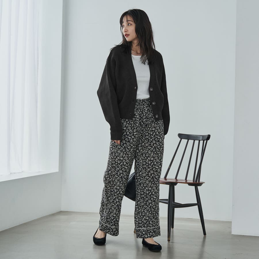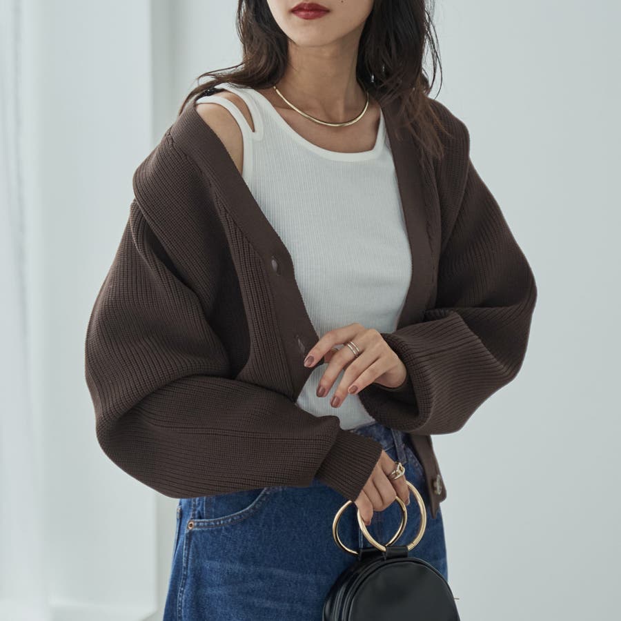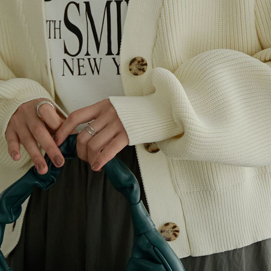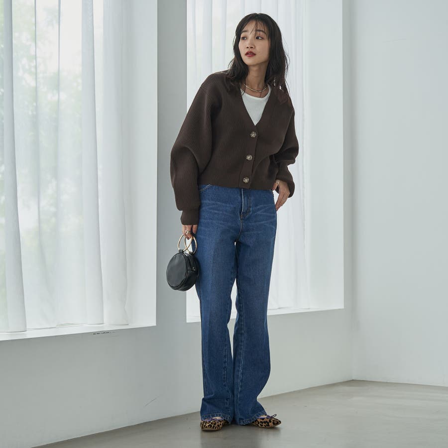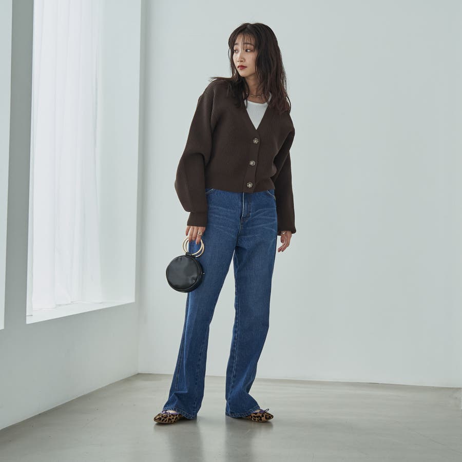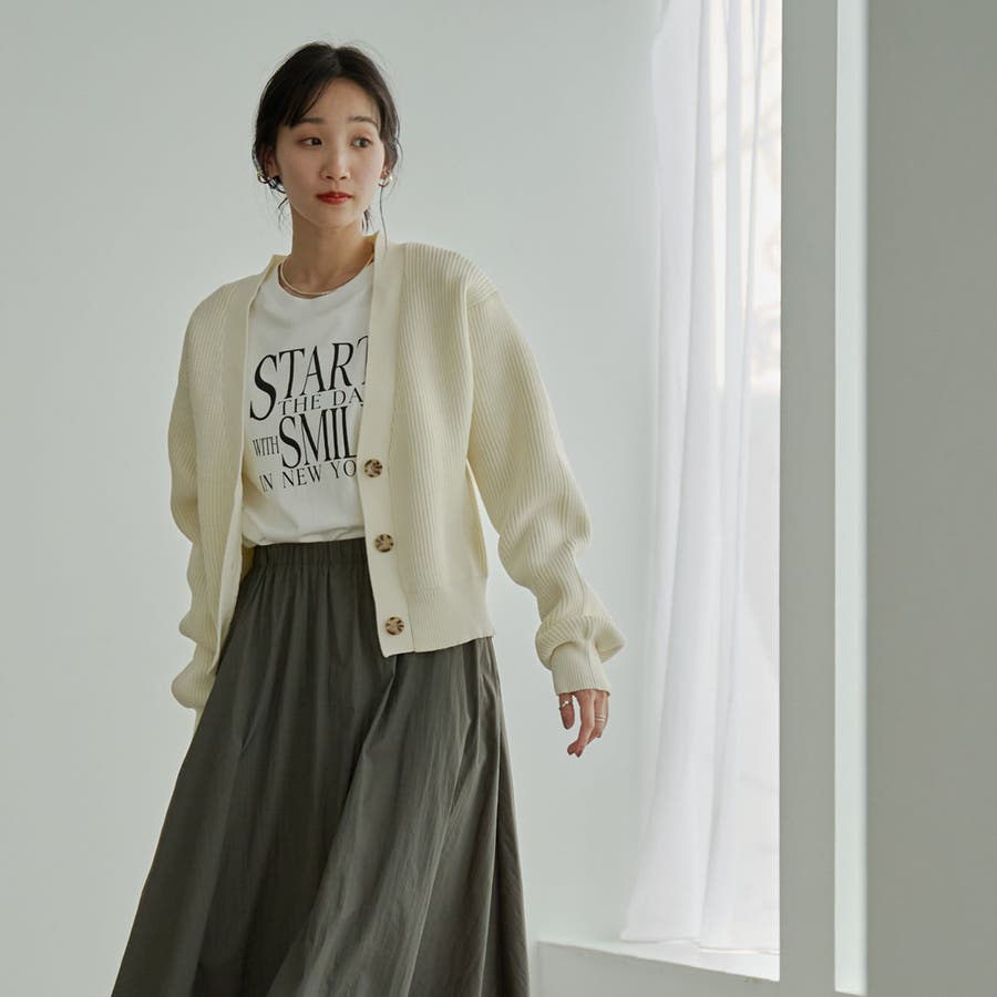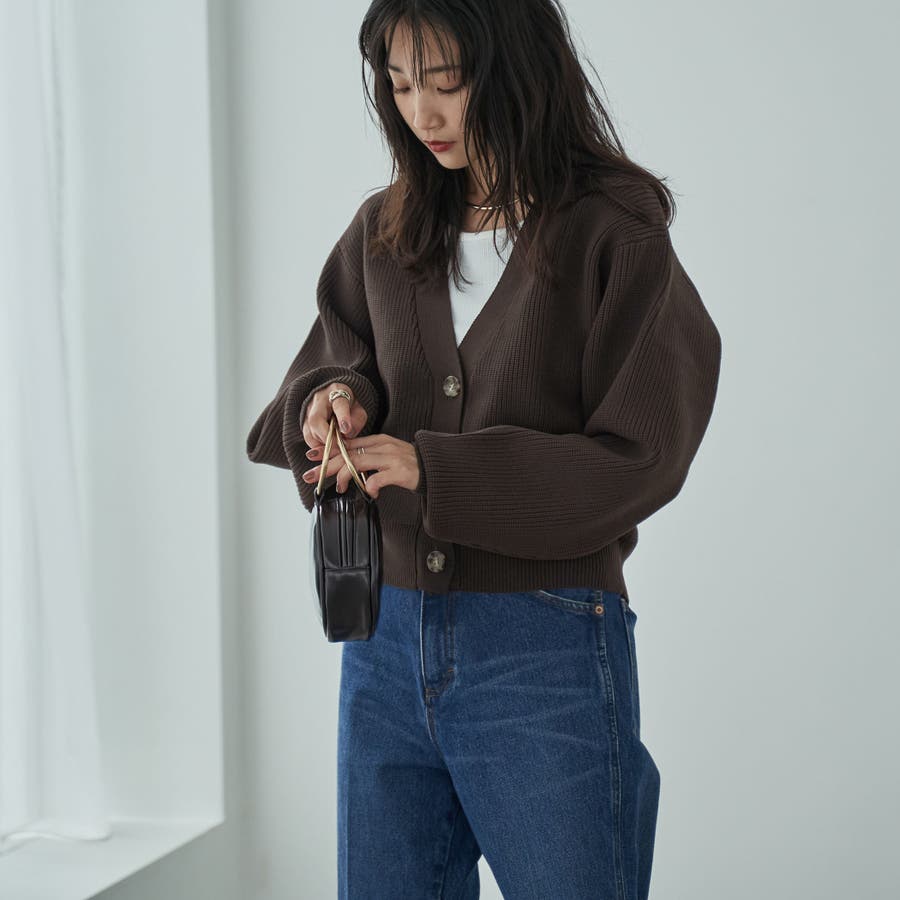 シンプルなVネックのニットカーディガンは、厚みや分量感はあるものの、着心地の軽さが魅力です。