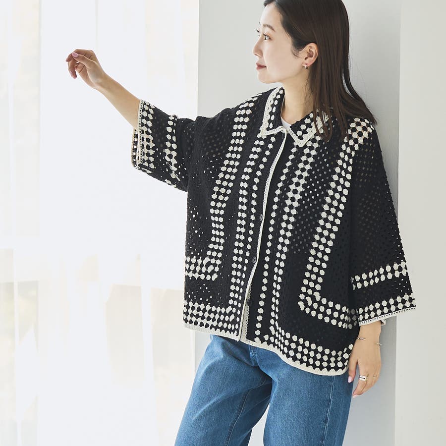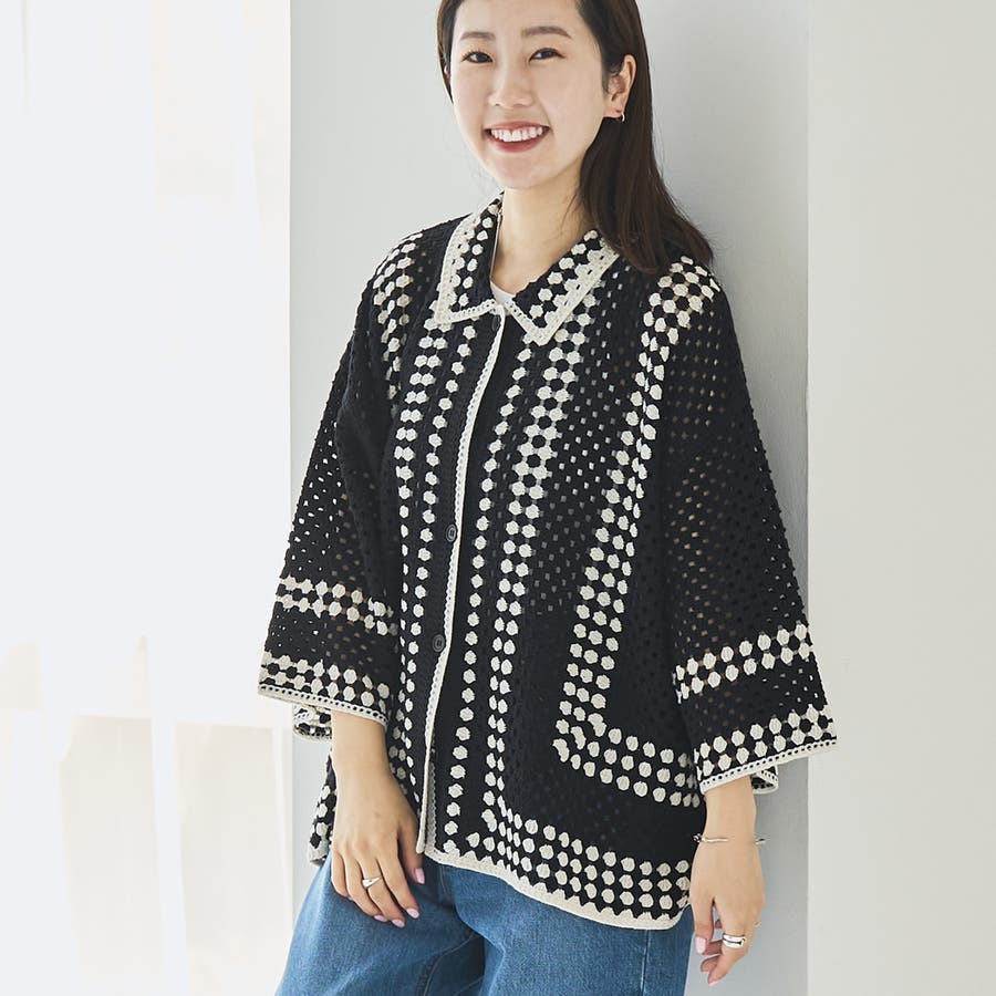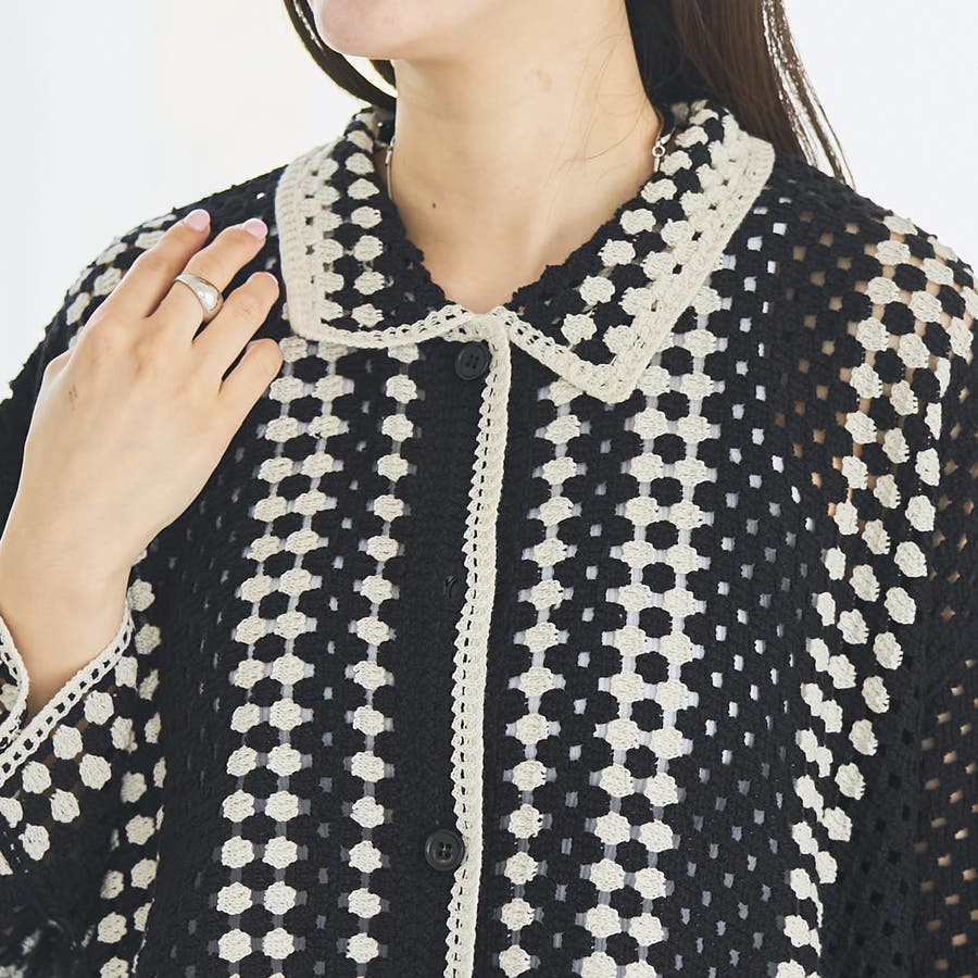 透け感のあるレース編みが可愛いクロシェ編みのポロ型ニットカーディガン。